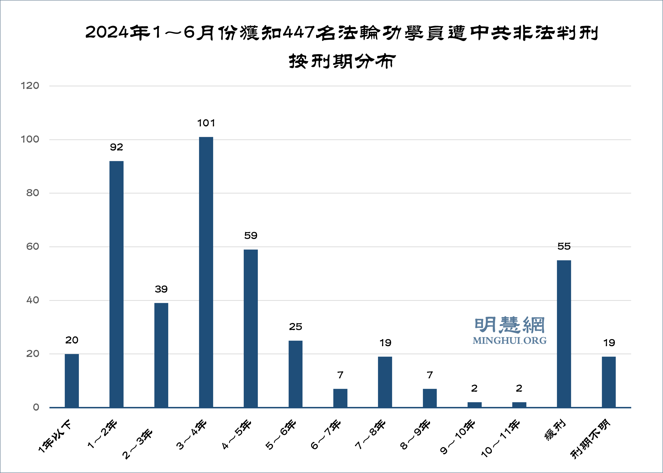 ![]() 图2:2024年1~6月份获知447名法轮功学员遭中共非法判刑按刑期分布 |