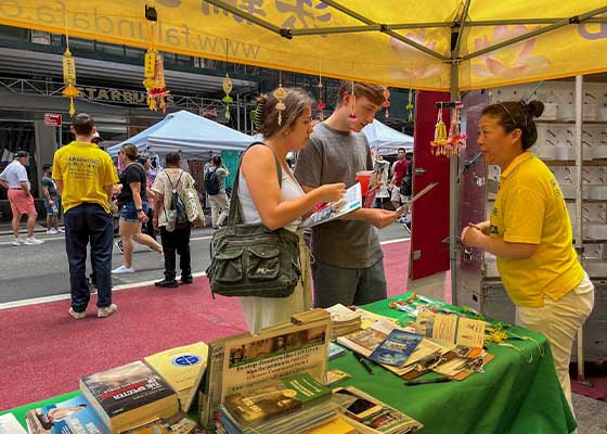 二零二四年七月七日,在法轮功学员在曼哈顿的中心位置、莱辛顿大道47街设立真相展位举办弘法、讲真相活动,吸引不少有缘人前来了解法轮功。