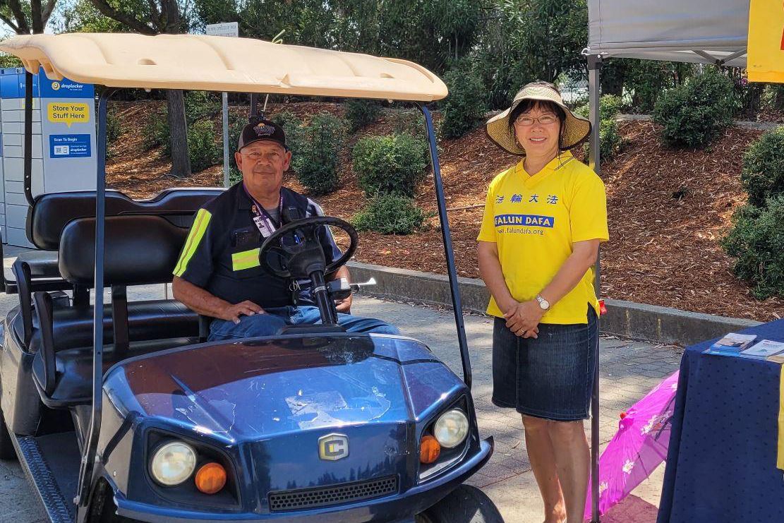 有一位博览会的工作人员叫大卫 (David),他的工作是驾驶电动小车运送人们往返于停车场和入口。大卫在将近十年前,听了法轮功学员讲的真相,从那时到现在每年都帮助学员传播真相。他利用工作之便,在驾驶电动小车运送人时给坐车的人发大法资料,主要是发带有大法信息的小莲花。