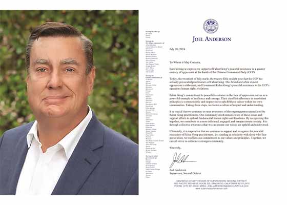 法轮功反迫害25年之际,圣地亚哥县监事乔尔·安德森向当地法轮功学员发信,支持并赞扬法轮功修炼者25年来和平反迫害的勇气与行为。