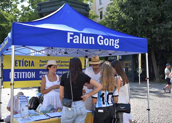 七月十九日,来自斯洛伐克的部分法轮功学员在首都布拉迪斯拉发的赫维兹多斯拉夫广场举行反迫害、讲真相活动。