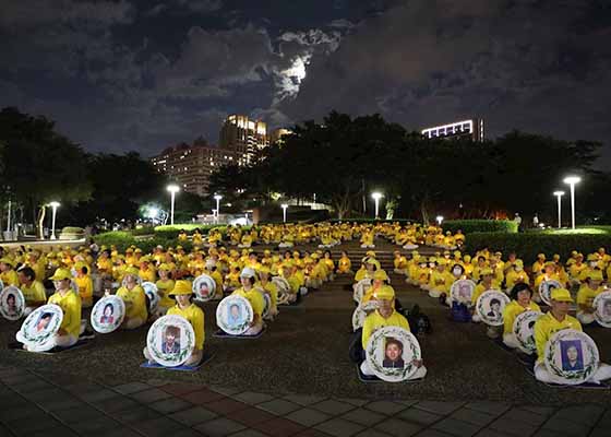 七月二十日晚间,来自台湾北部法轮功学员,在落日余晖下齐聚台北市政府广场,悼念因信仰真、善、忍而被迫害致死的学员。台湾议员和律师也共同谴责中共的暴力罪行。