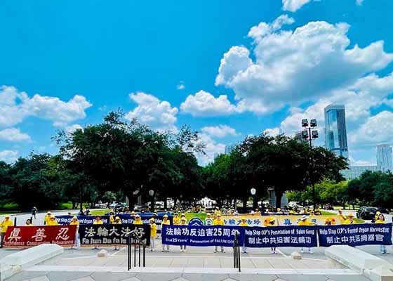 来自美国德州奥斯汀、达拉斯、休斯顿、大学城、新布朗费尔斯等地的法轮功学员7月20日在首府议会大厦前和平集会,要求中共立即停止迫害。