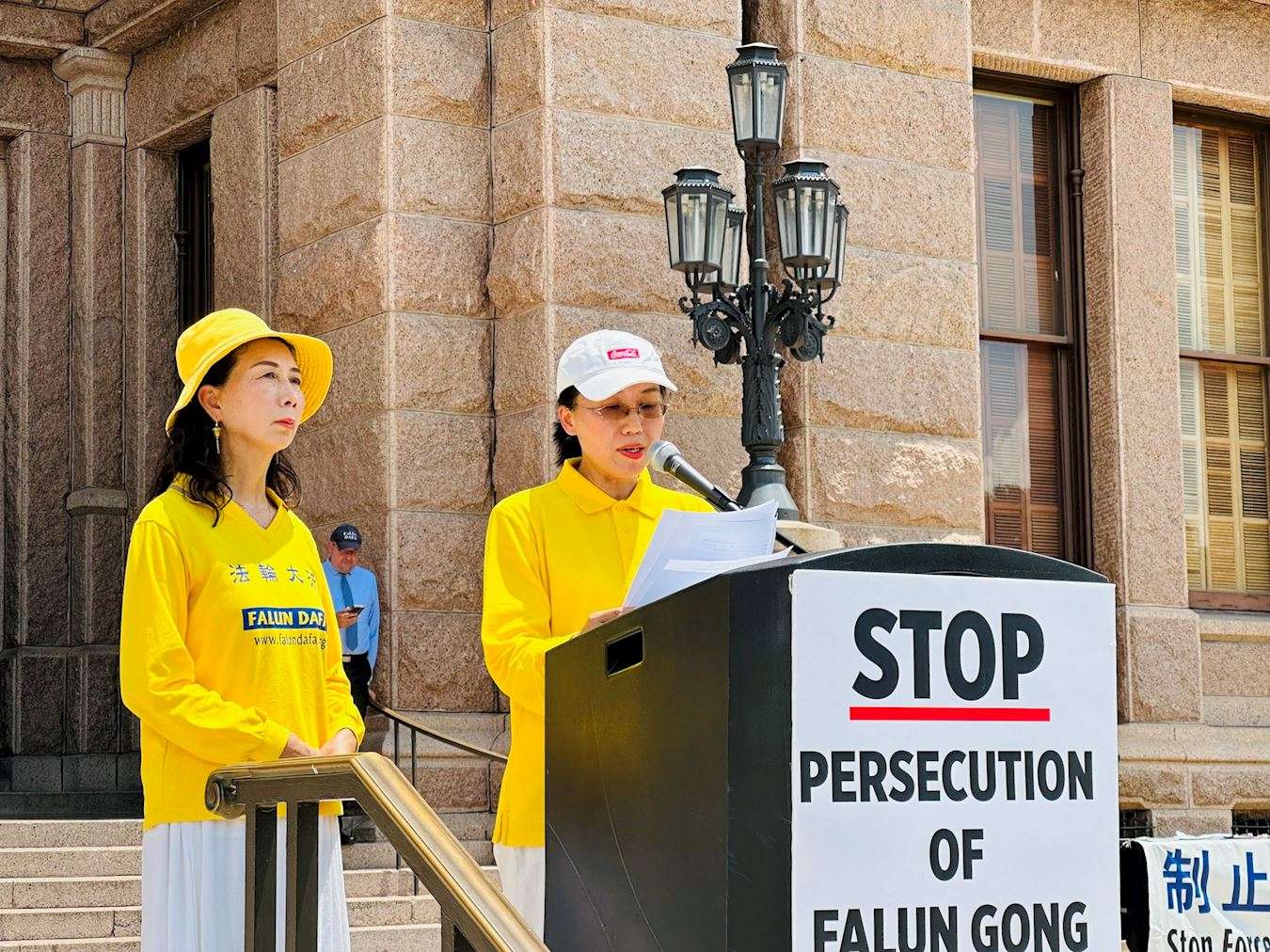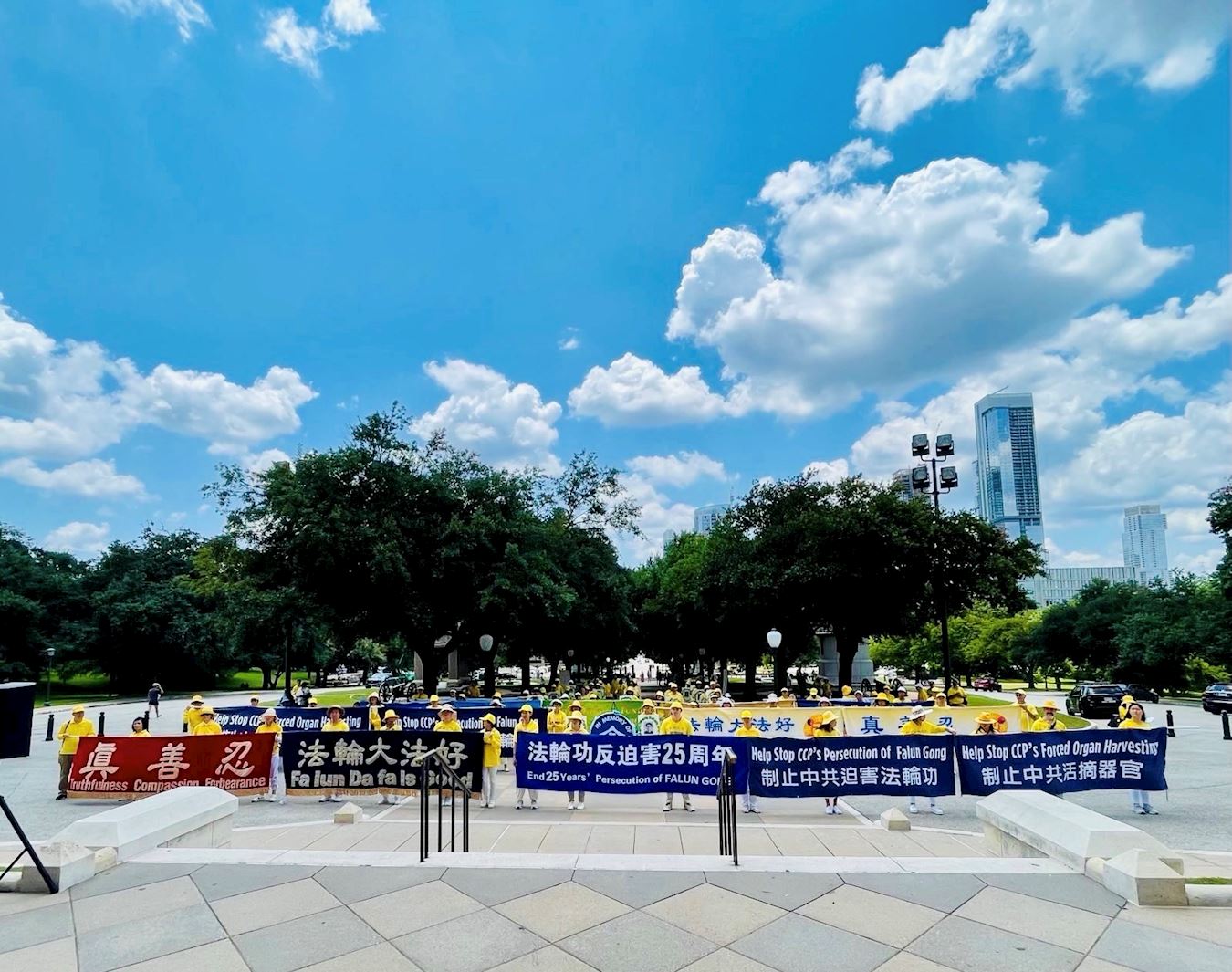美南法轮大法学会会长杨先生在集会中说:“中共对法轮功的迫害已经持续二十五年。法轮功学员每天都在被骚扰、监禁,甚至被活摘器官,这是令人震惊的反人类罪。法轮功学员没有犯罪,也没有伤害任何人。如果没有这场迫害,他们本可以过上更好的生活。他们因为不放弃真善忍的信仰而遭到中共的酷刑或虐杀。”