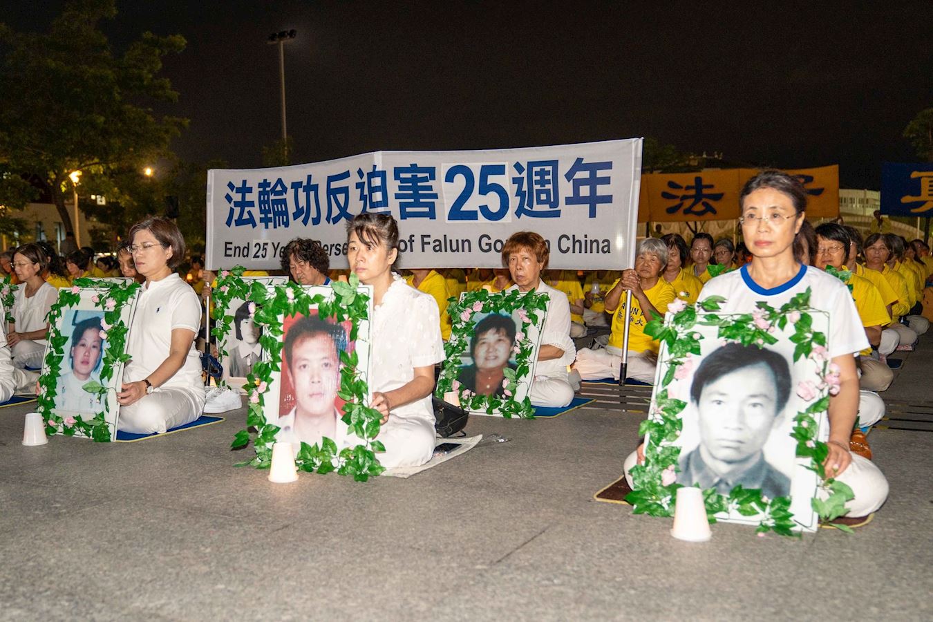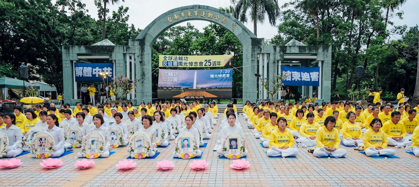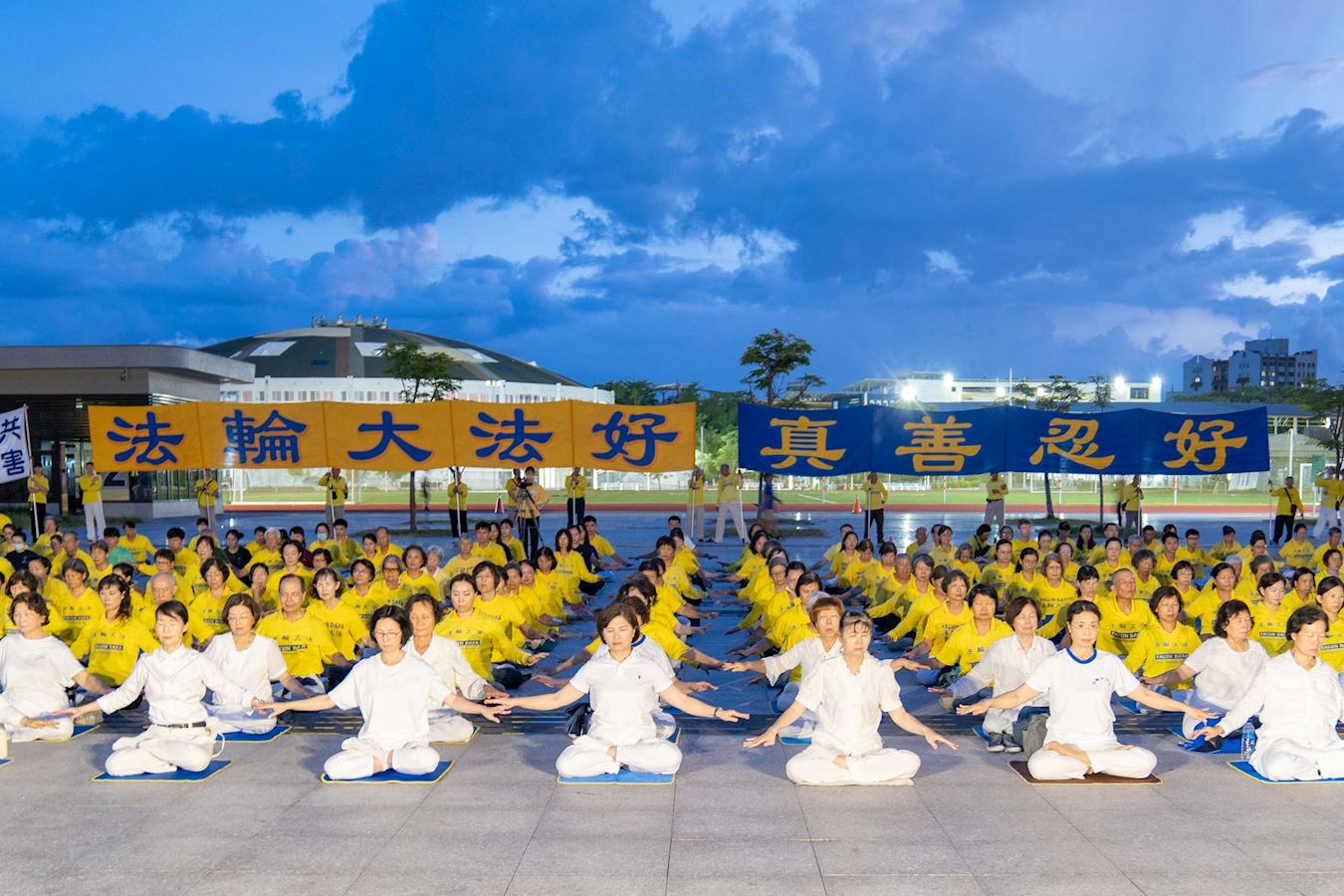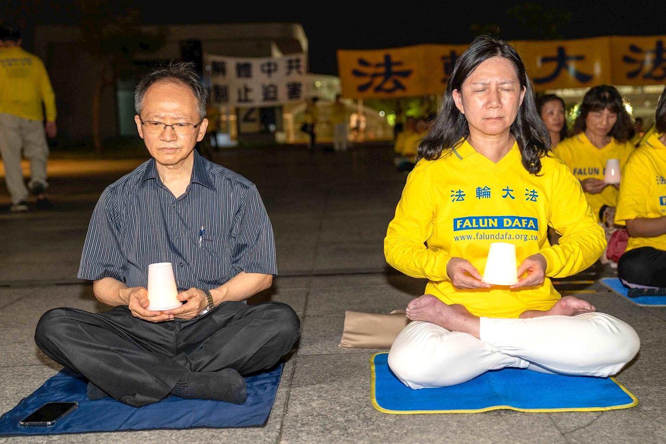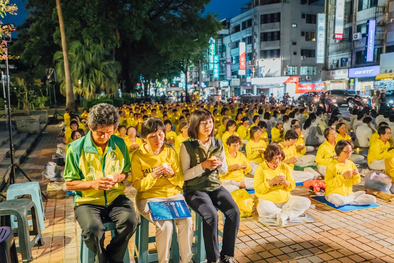 从薄暮到入夜,法轮功学员平和有序的集体炼功、静坐,其间并透过影片回顾二十五年来法轮功学员和平理性反迫害的画面。感佩学员坚持不懈地讲真相,台南、高雄地区议员,以及正义人士纷纷到场声援,呼吁中共停止迫害法轮功。