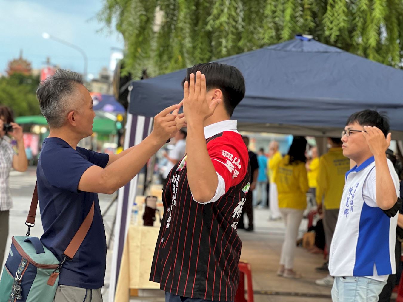 高雄市议员刘德林生致词声援,他说:“法轮功学员在‘真善忍’的指导下,修持自我净化内心,带给社会祥和安康。这么多年来,大家都知道法轮大法好!”