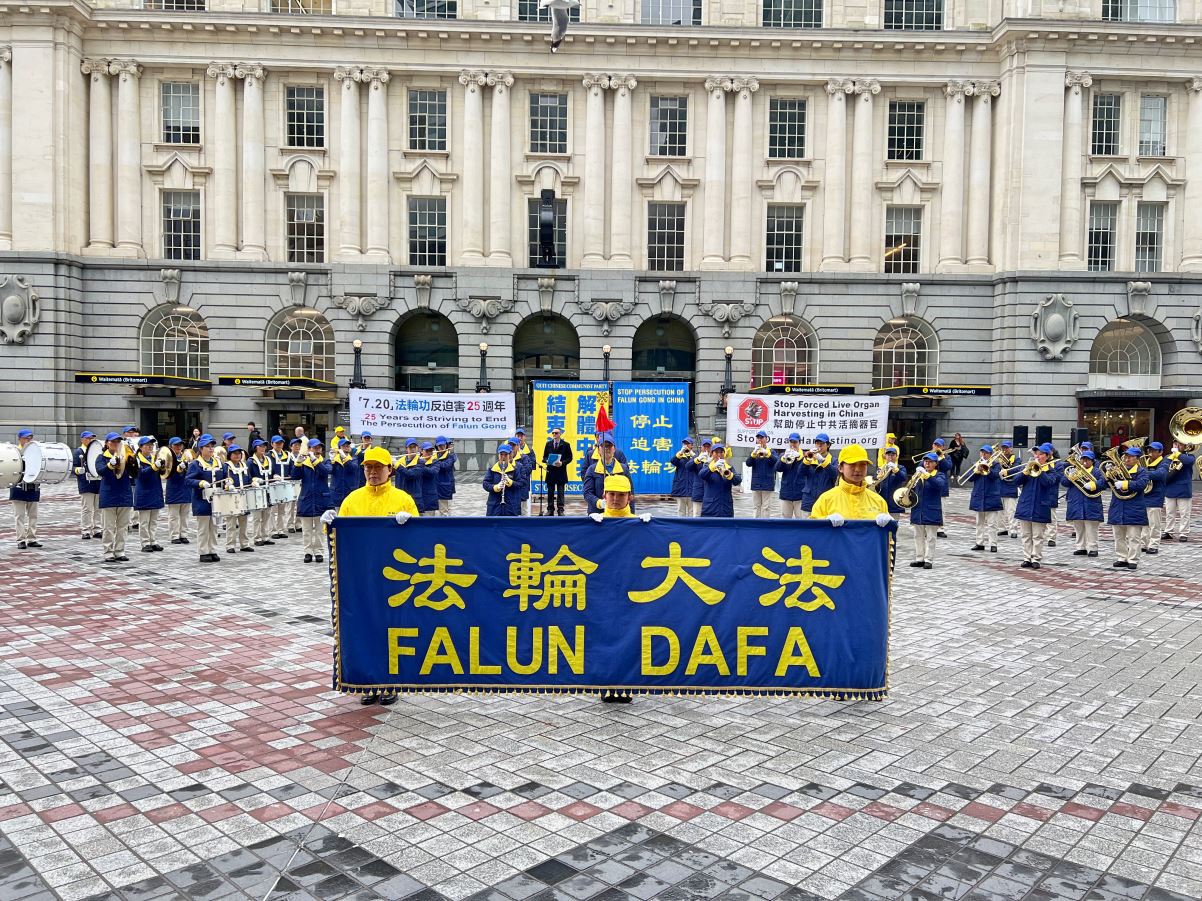 ![]() 图5:法轮功学员组成的天国乐团在集会上演奏,雄壮的乐曲让人们驻足观看并来了解真相。 |