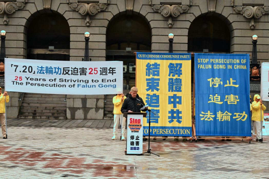 公民自由委员会主席巴里·威尔森(Barry Wilson)在集会中谴责了中共活摘法轮功学员的暴行,赞赏法轮功学员二十五年如一日的反迫害、讲真相活动。