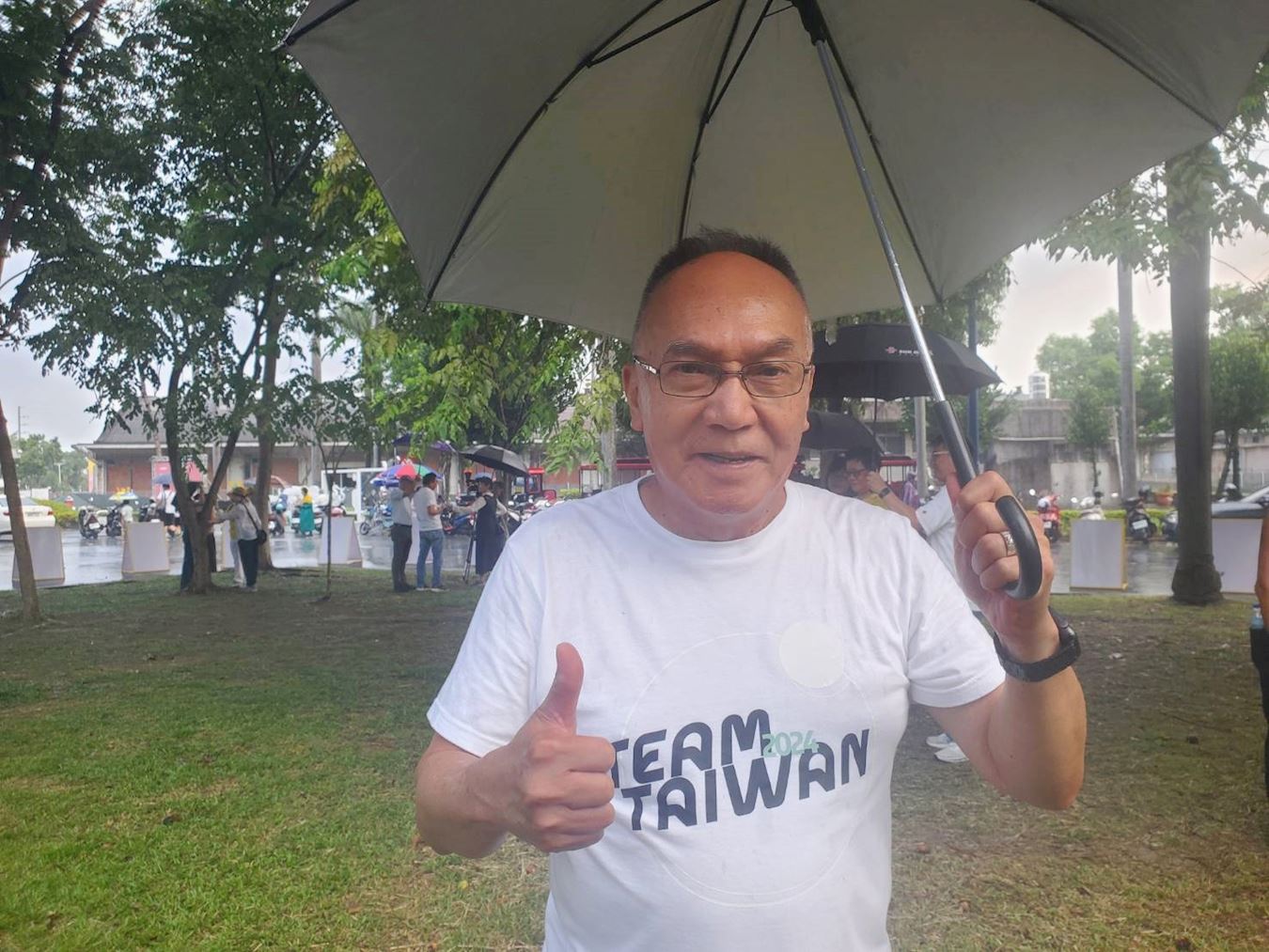 '图15:屏东县议员洪明江。他伸出大拇指对法轮功学员比“赞”'