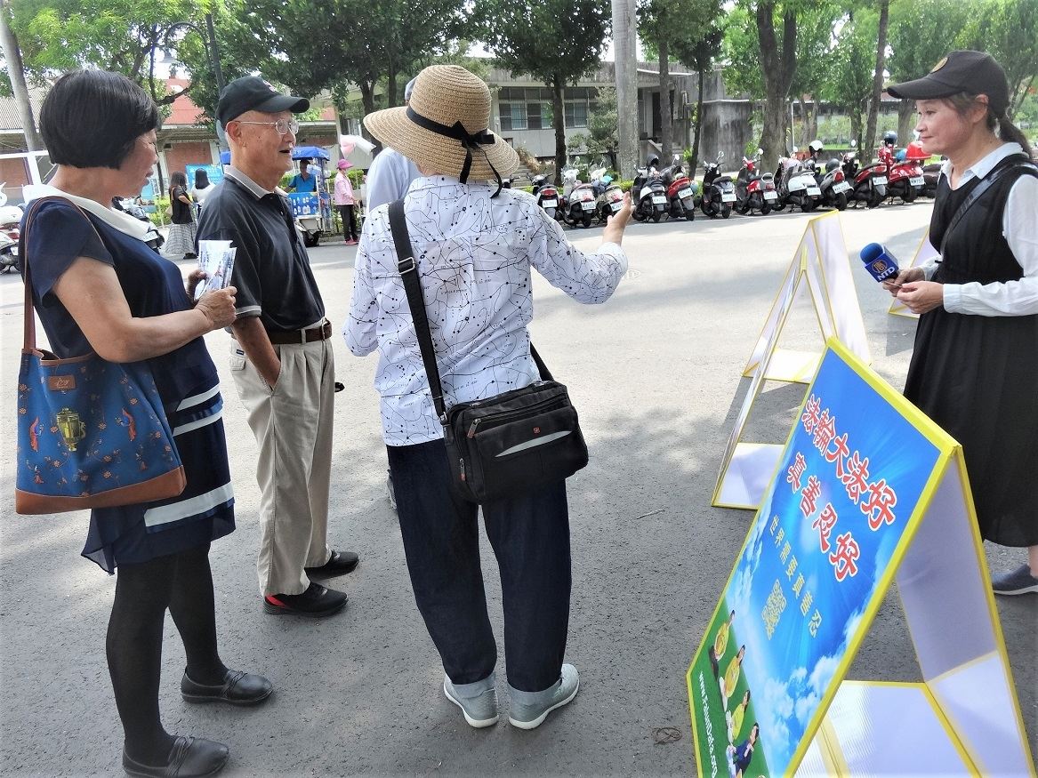 屏东市民代表古富财也来到现场,他表示,在观看了真相展版后,终于了解了法轮功反迫害的要求,他伸出大拇指对法轮功学员点“赞”。