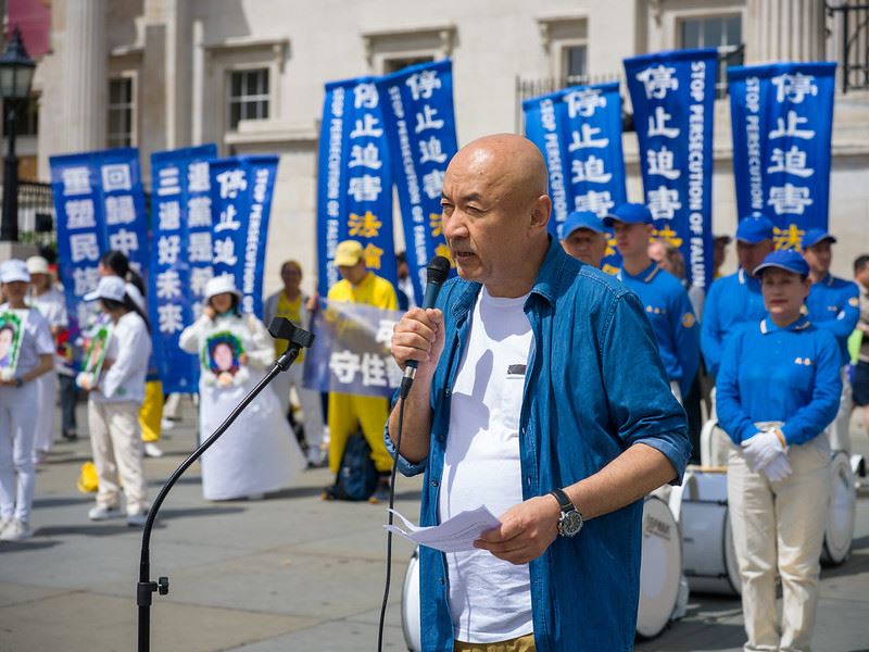 旅英作家马建在集会中发言,表达了对法轮功学员的尊敬,赞扬他们抵抗中共暴政的勇气。他表示,法轮功学员的和平抗争正在改变着政治环境。他还呼吁人们铭记那些遭受迫害的法轮功学员。最后马建振臂高呼“停止迫害法轮功”。