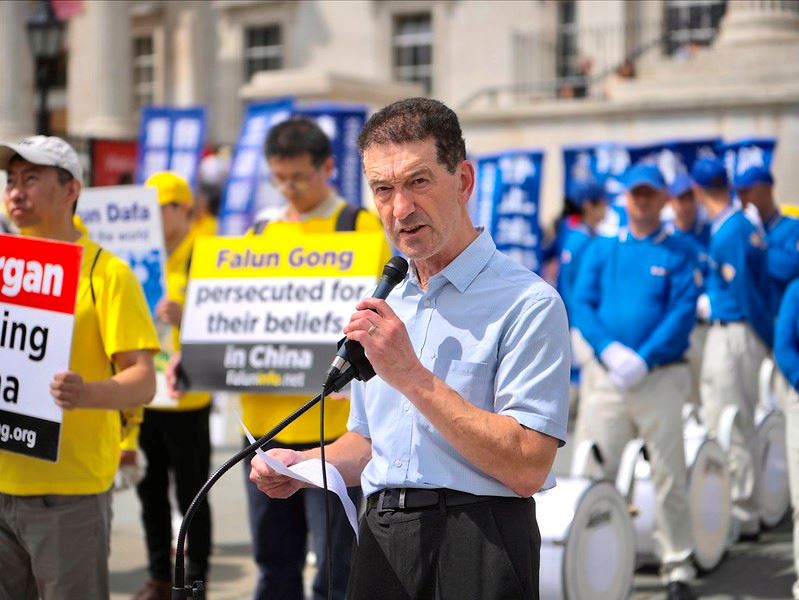 法轮功学员丁乐宾宣读了写给英国首相的公开请愿信,请求英国政府采取切实行动,制止中共对法轮功长达二十五年的迫害。信中详细描述了丁乐宾一家三口因迫害而分离十二年的遭遇,以及中共对法轮功学员的非法抓捕、判刑、酷刑、甚至活摘器官等罪行。
