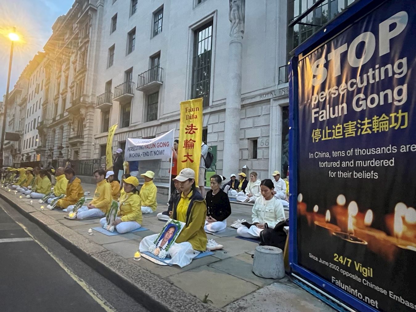 夜幕降临,伦敦中国大使馆外却依然灯火通明。结束了白天游行活动的部分法轮功学员,在这里举行烛光守夜,悼念那些被中共迫害致死的法轮功学员。点点烛光,寄托着哀思,也照亮了夜空,传递着希望。