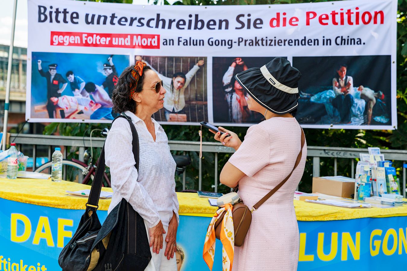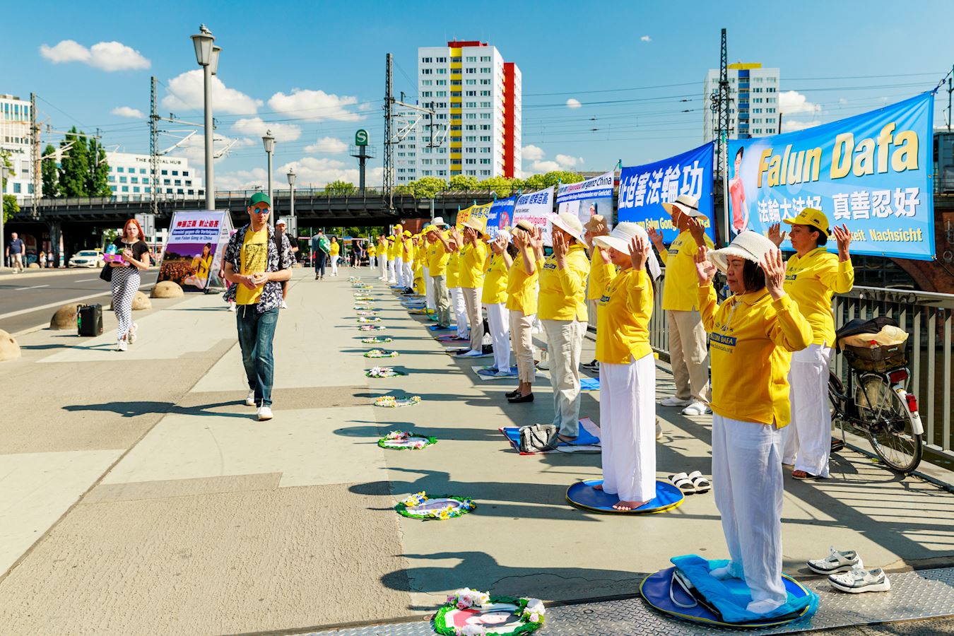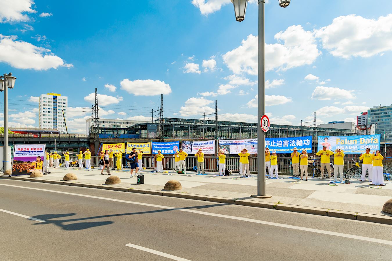 二零二四年七月十九日,法轮功学员在柏林中使馆对面的亚诺维茨桥(Jannowitzbrücke)上举办反迫害活动。伴随着祥和的炼功音乐,学员们展示法轮功五套功法,并向过往民众讲述法轮功反迫害的真相。看到学员平静优雅的炼功动作,对比横幅上展示的中共迫害法轮功的暴行,了解了真相的民众纷纷签名声援法轮功学员反迫害。