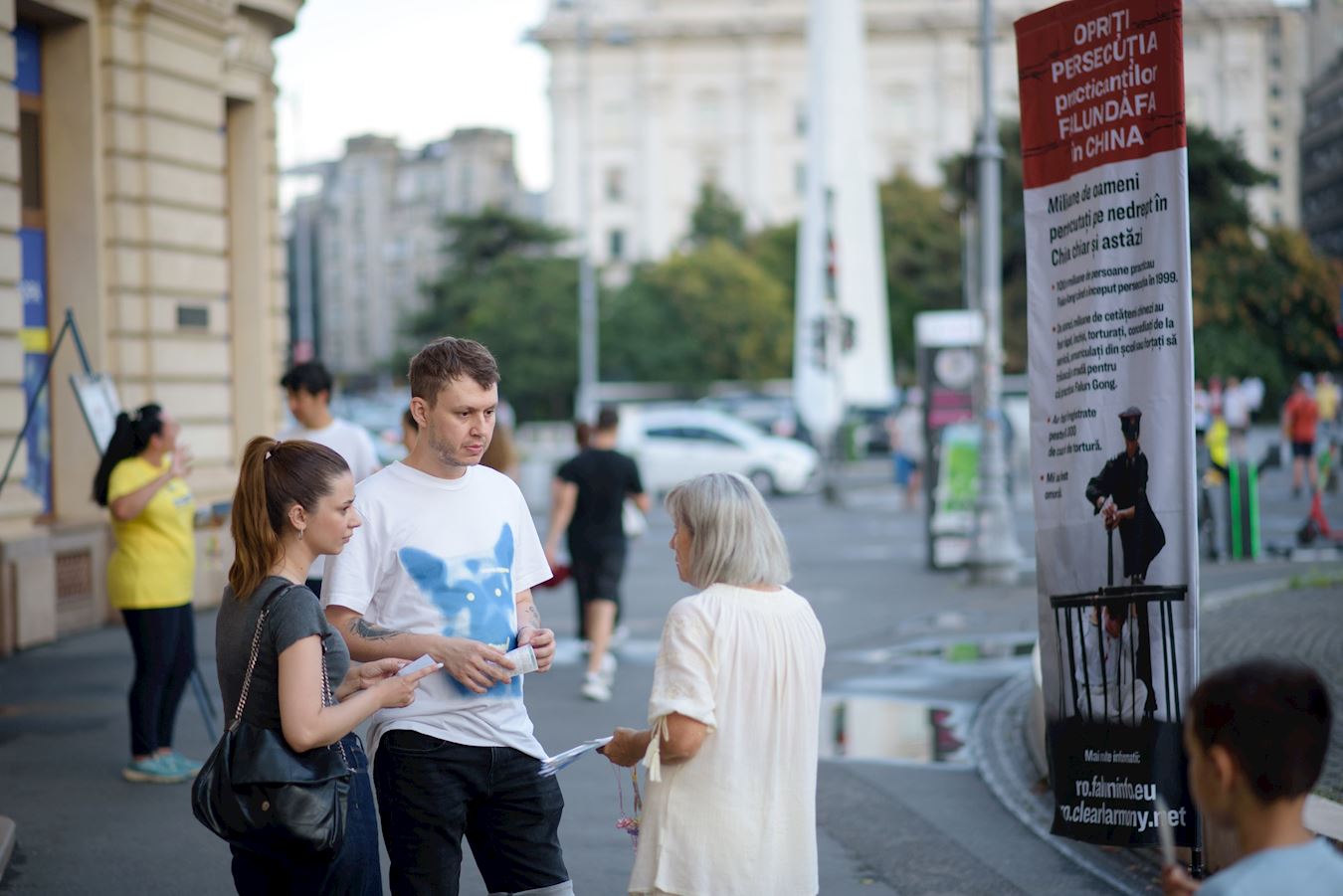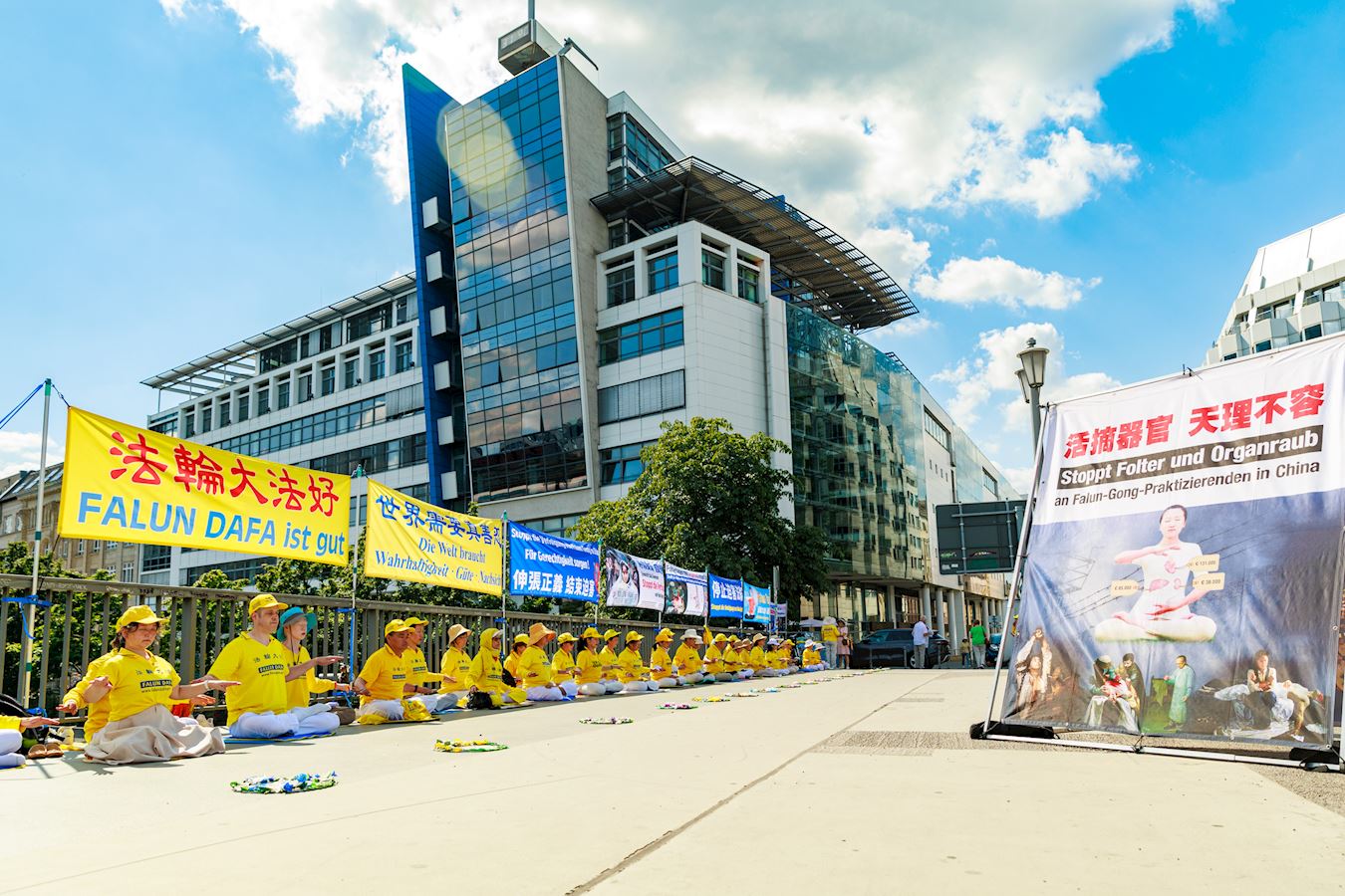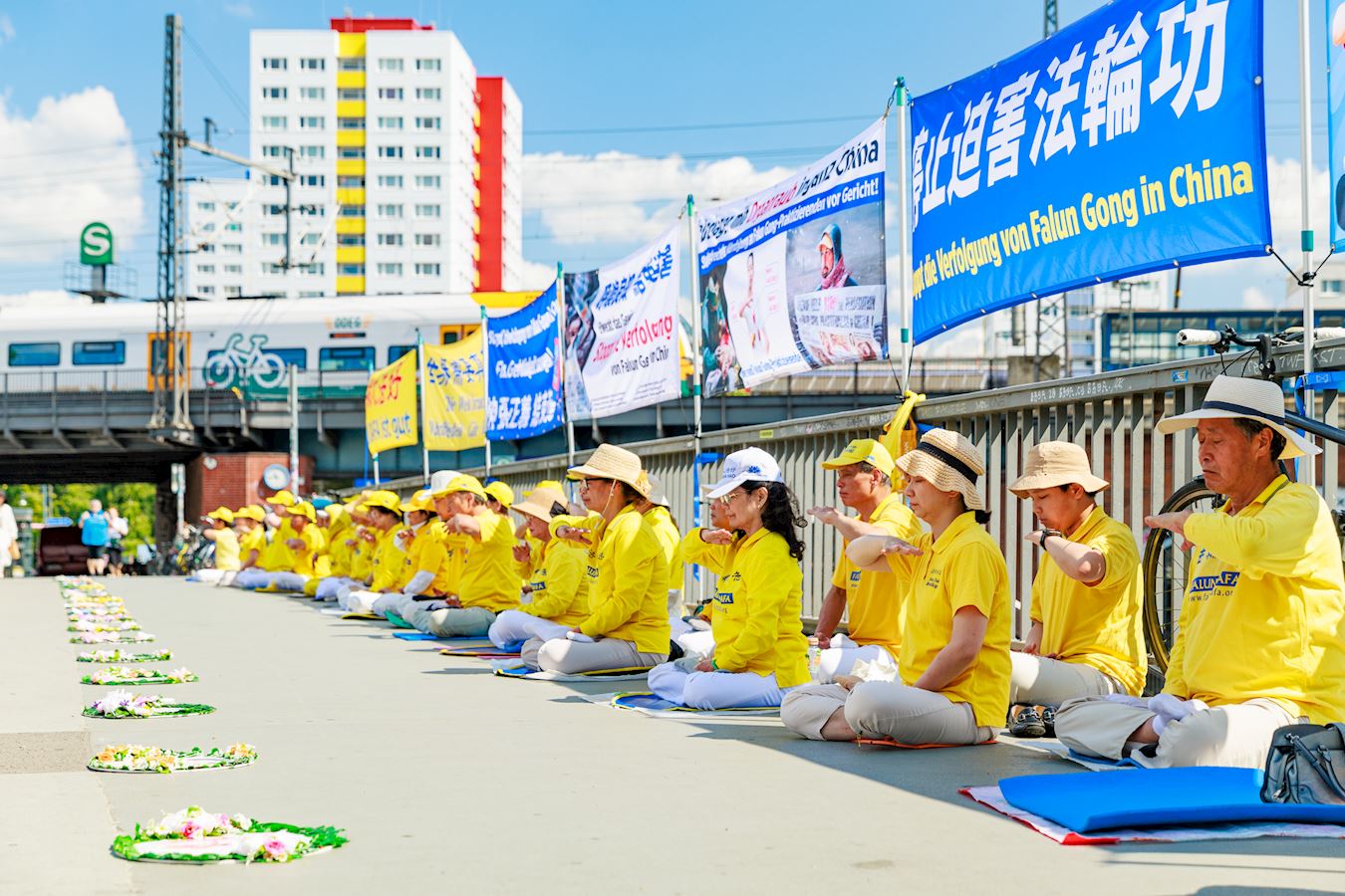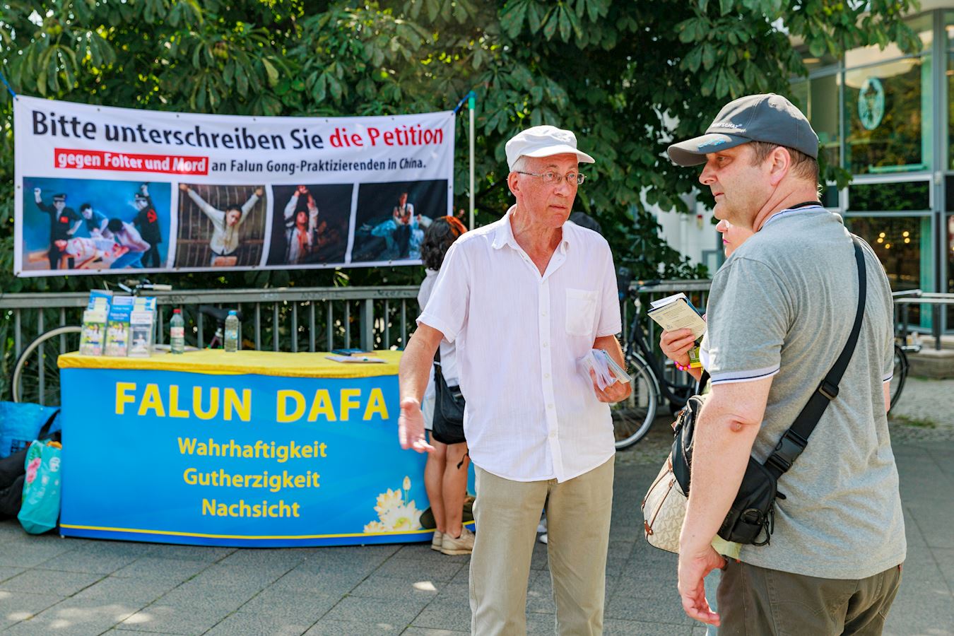 二零二四年七月十九日,法轮功学员在柏林中使馆对面的亚诺维茨桥(Jannowitzbrücke)上举办反迫害活动。伴随着祥和的炼功音乐,学员们展示法轮功五套功法,并向过往民众讲述法轮功反迫害的真相。看到学员平静优雅的炼功动作,对比横幅上展示的中共迫害法轮功的暴行,了解了真相的民众纷纷签名声援法轮功学员反迫害。