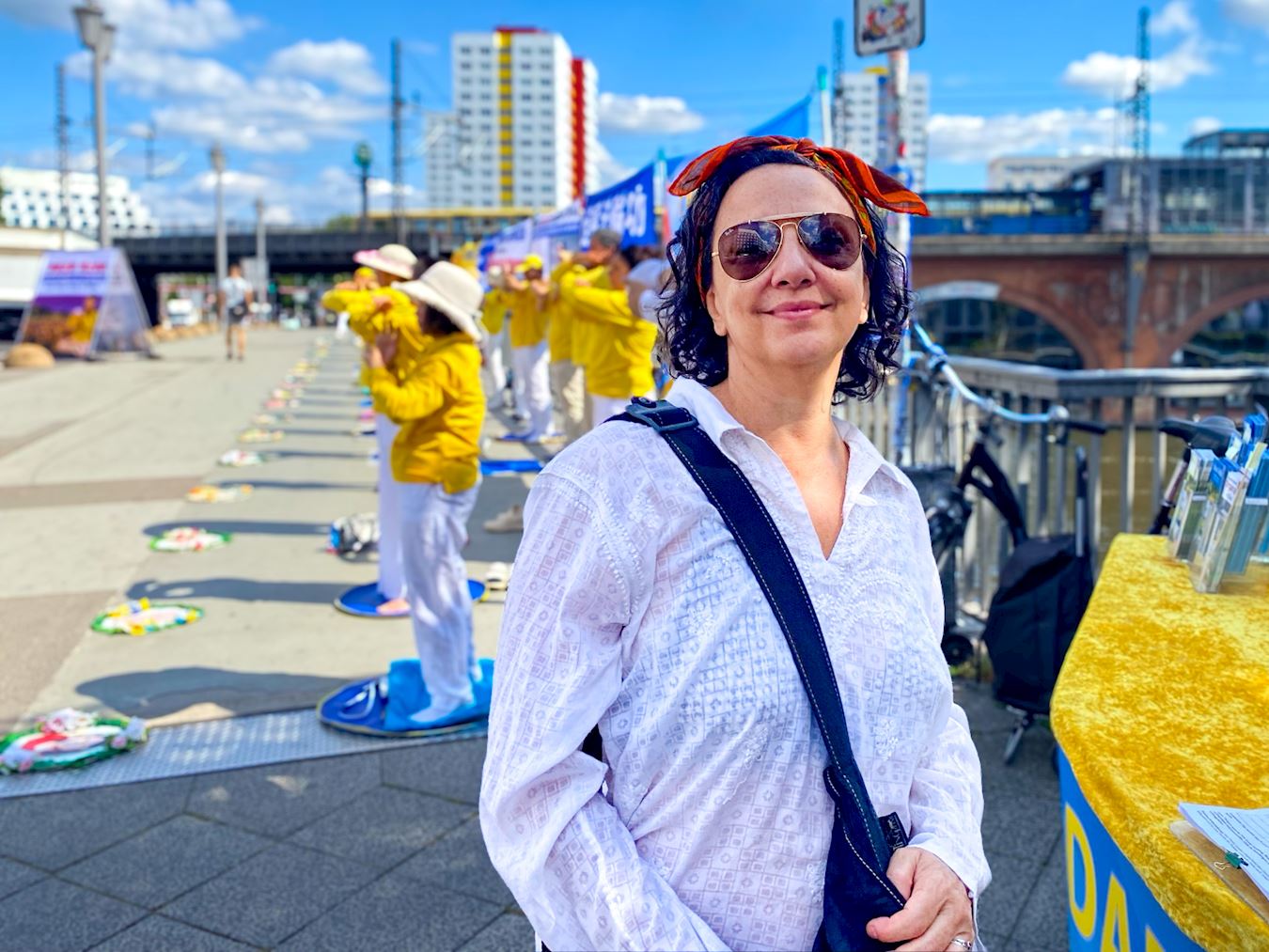 来自巴西的舞蹈艺术家西奥玛·博纳维塔(Thelma Bonavita)旅居柏林已近十年。法轮功学员炼功场景吸引了她,通过阅读资料了解到中共迫害法轮功的罪恶后,她在反迫害征签表上签名,并表示毫无疑问支持学员反迫害,因为她完全理解迫害有多严重。