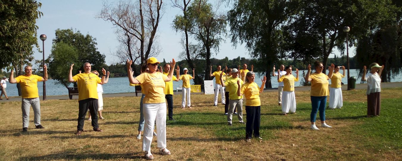 ![]() 图4~6:法轮功学员展示法轮功五套功法。 |