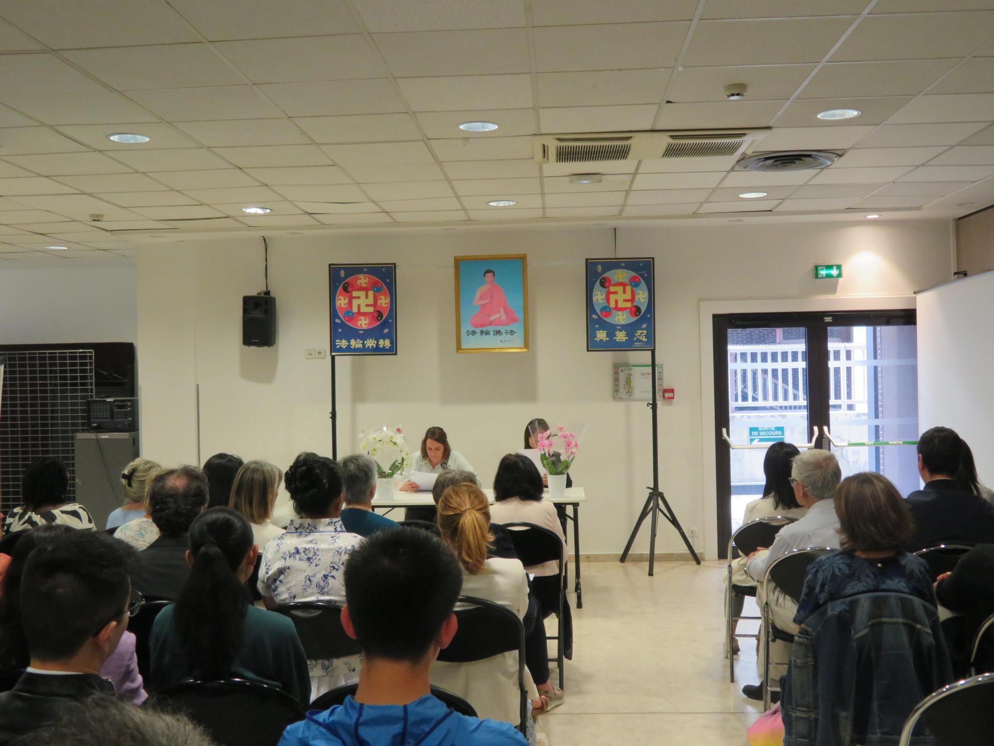 图1~2:学员交流了二零二四年在推广与跟随神韵艺术团在法国巡演过程中的修炼体会