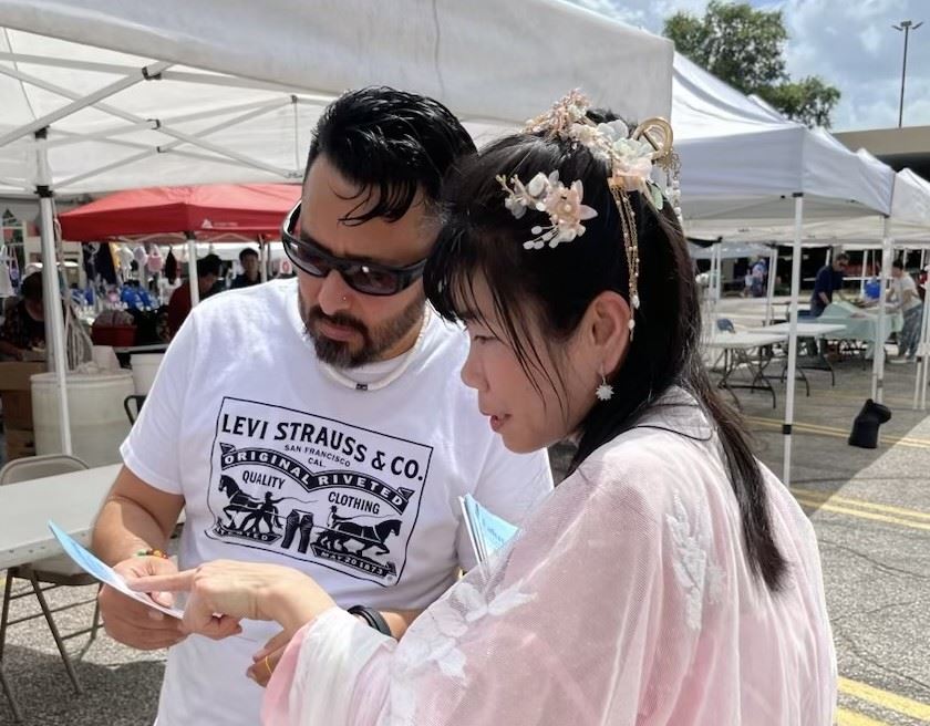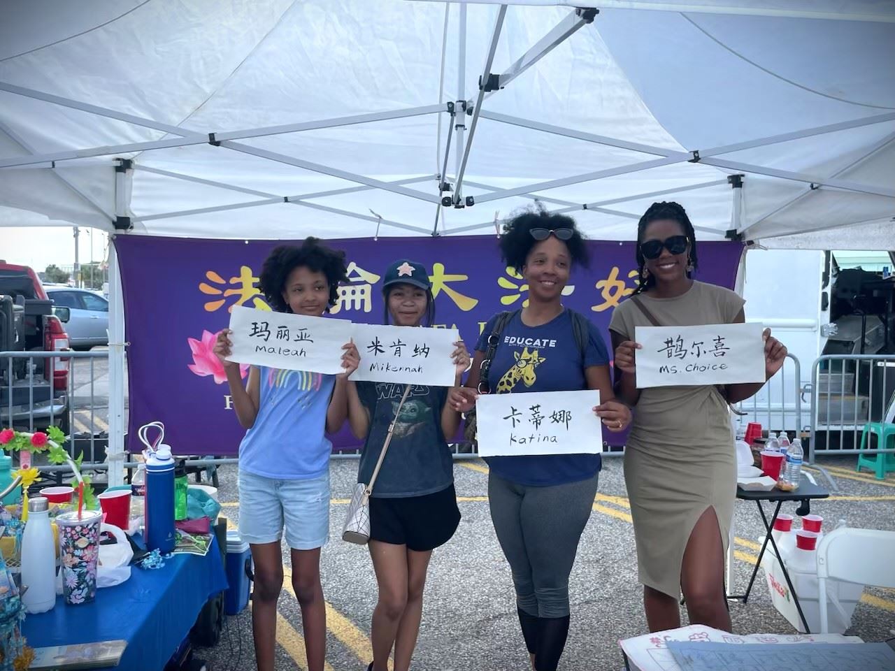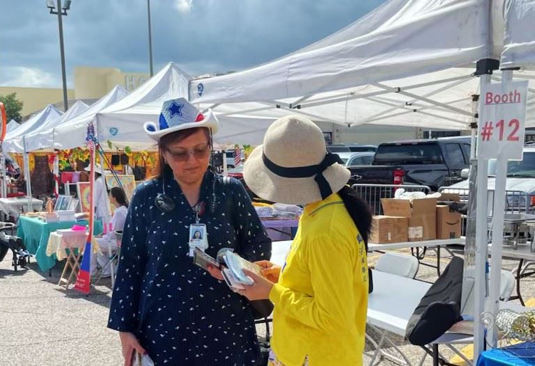 来自休斯顿和圣安东尼奥的法轮功学员设置了真相展位,他们展示舒缓优美的五套法轮功功法,向游客免费赠送书法作品,身着中国传统服饰的学员分发真相资料,讲述大法的美好。