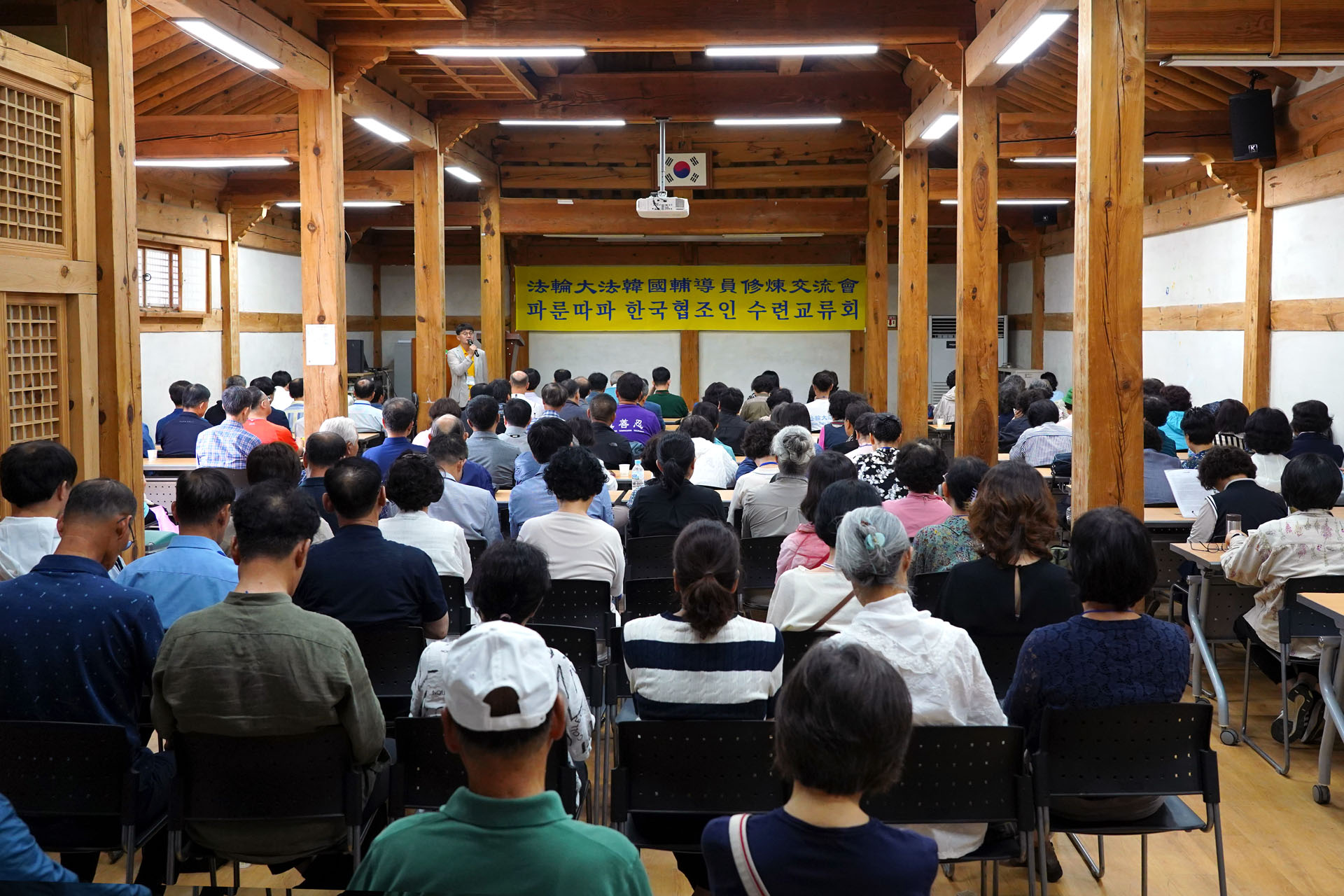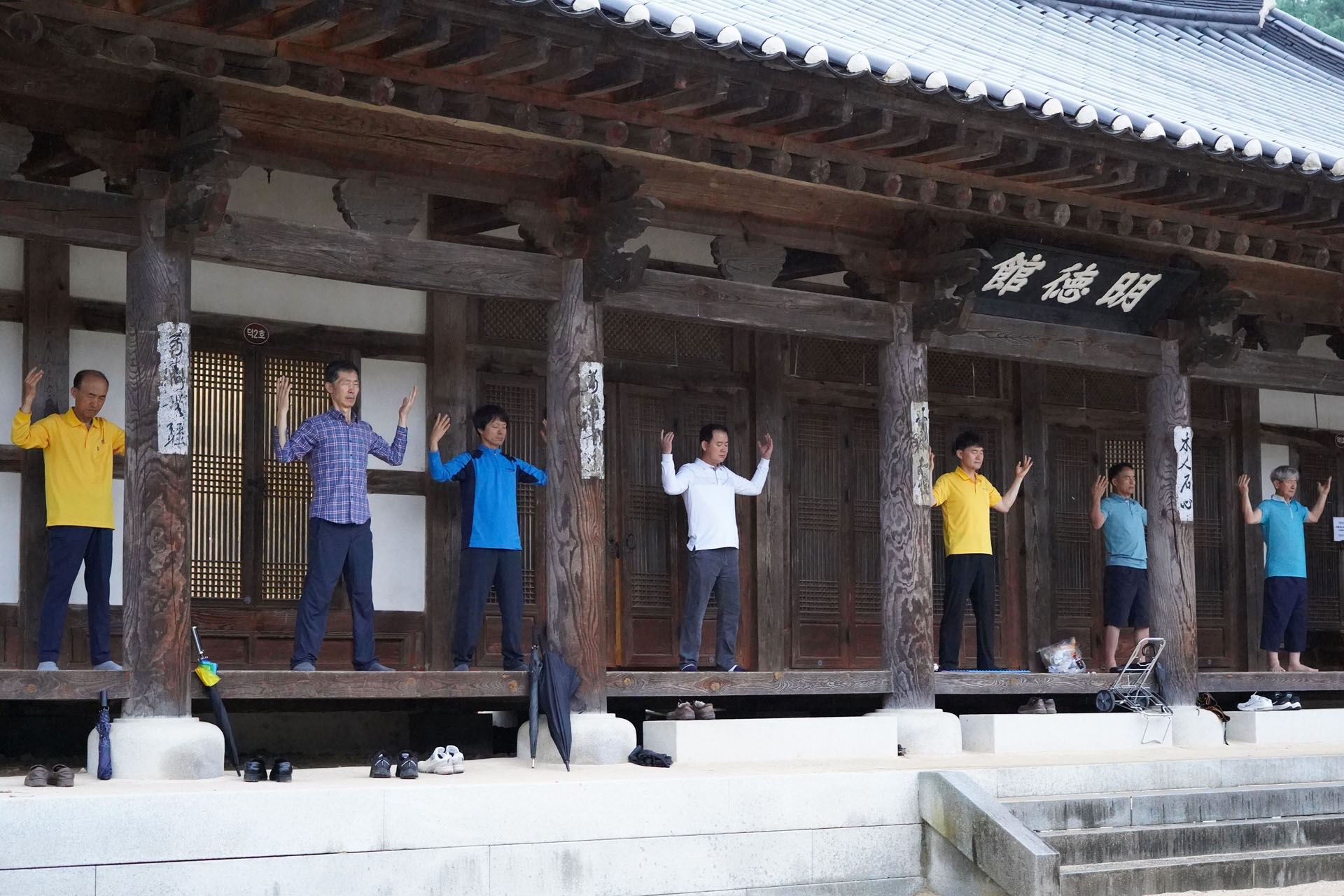 第二天,原定于凌晨集体炼功,由于正值雨季下雨,炼功不得不移至室内。在传统韩屋室内和屋檐下炼功,闻着雨中传统韩屋的木香,气氛十分宁静。