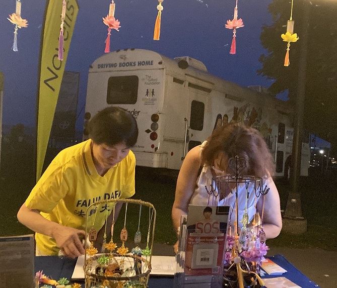 一位年轻男士白天在法轮大法的展位了解了法轮大法的真相,并签名支持法轮大法。晚上,当学员们正在收帐篷时,他看到了,主动上前帮助学员们收帐篷。