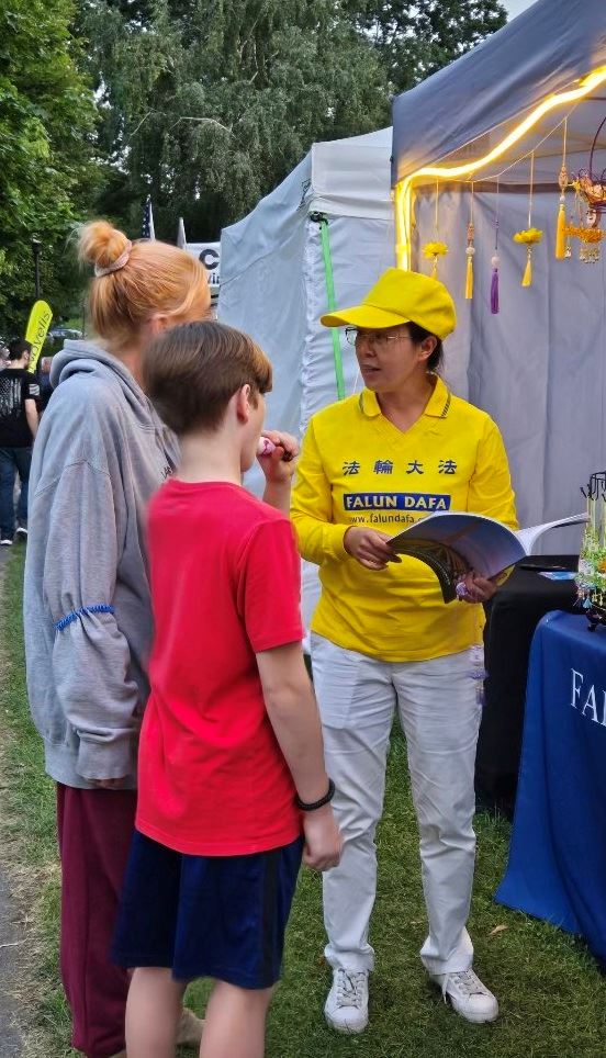 在人流如织的环境中,有一位中年人来到法轮大法展位,非常有兴趣地了解大法真相。他的儿子在一旁静静地听着。当他知道学员们在征签时,立刻签名表示支持,希望迫害早日结束。