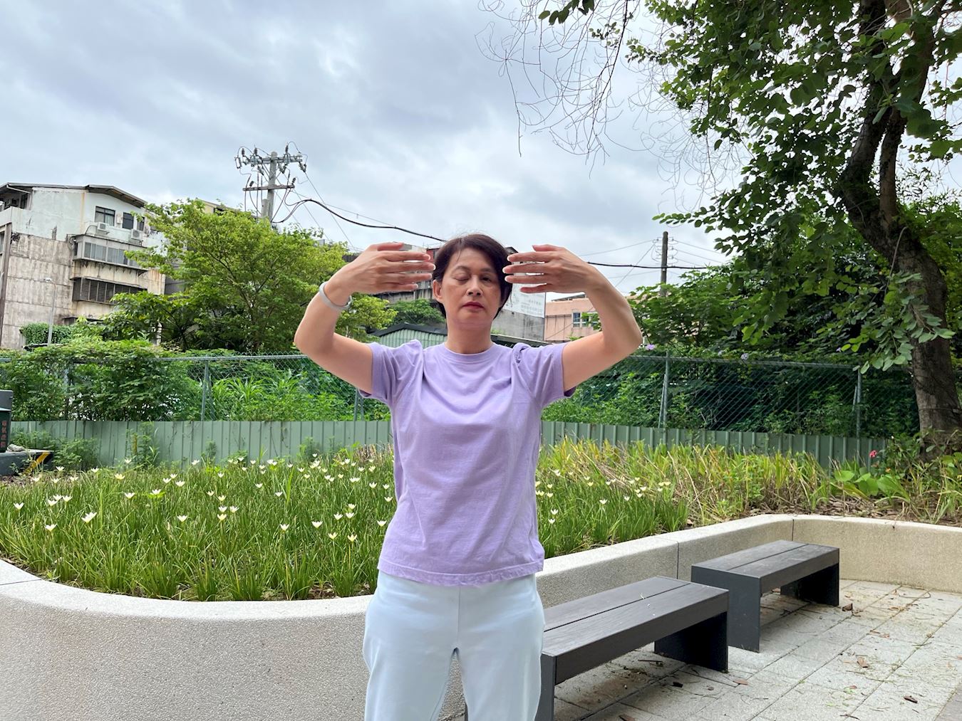 ![]() 图2:纪美正在炼法轮功第二套功法——法轮桩法。 |
