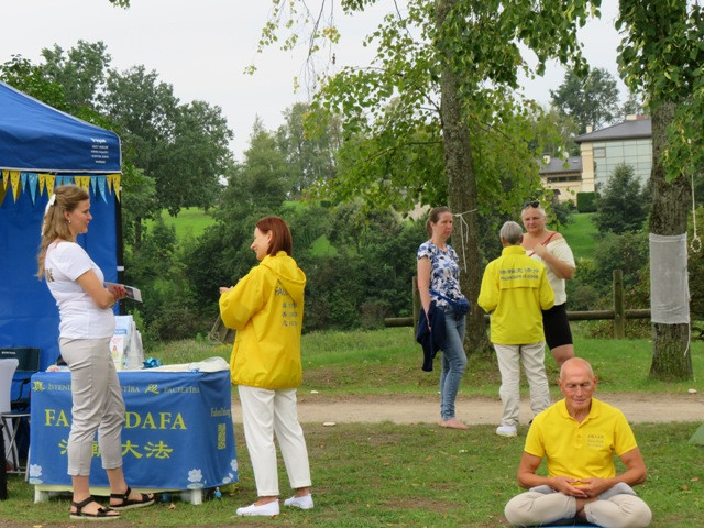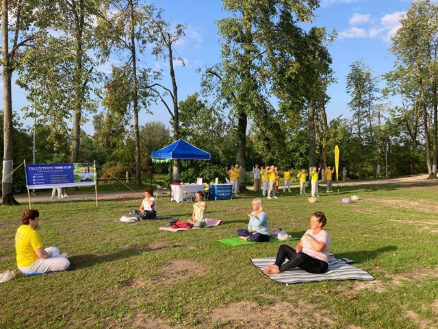八月十七日星期六,法轮功学员来到节日现场,向游客介绍法轮功真相以及大法对改善身心健康的巨大作用。他们还演示五套功法,为感兴趣的人们免费教授法轮功功法。许多尝试了炼功动作的人说,他们感觉很放松,并想要开始走入修炼。学员向他们提供了拉脱维亚炼功点的信息,并告诉他们,如果他们所在城市还没有炼功点,可以组建一个。