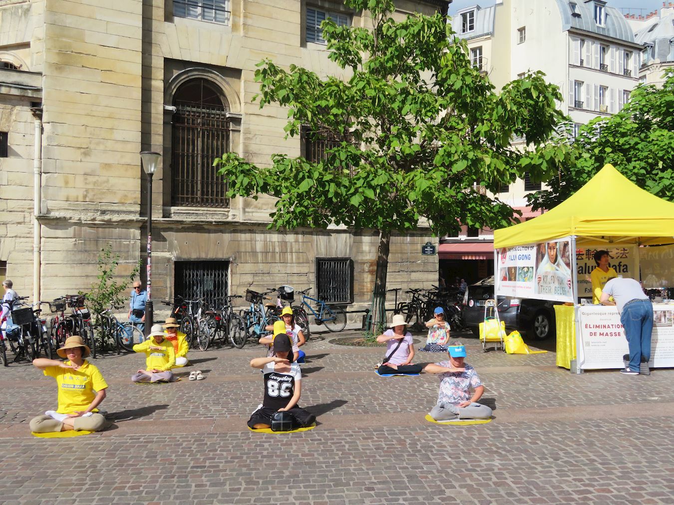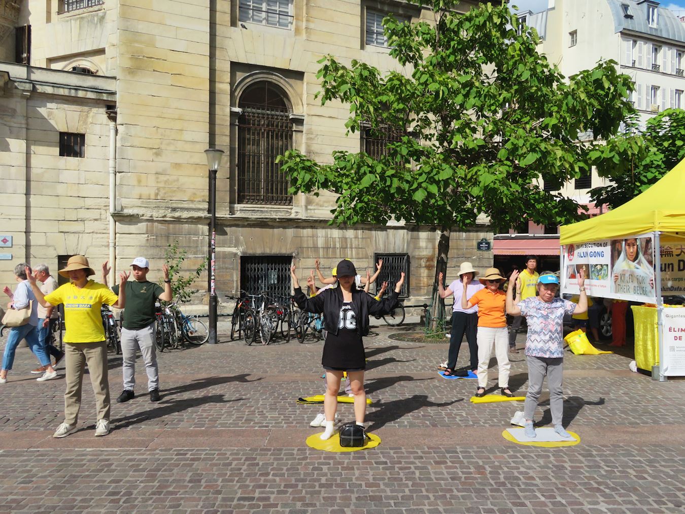 '图1~5:二零二四年八月二十五日下午,在巴黎市夏特蕾街区,法轮功学员演示法轮功功法,向民众讲述法轮功真相。'