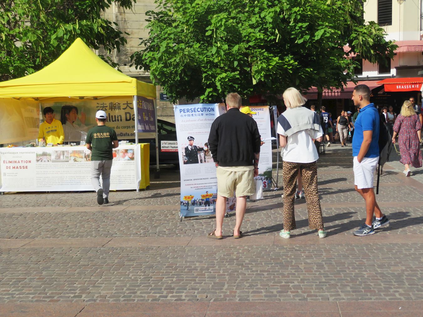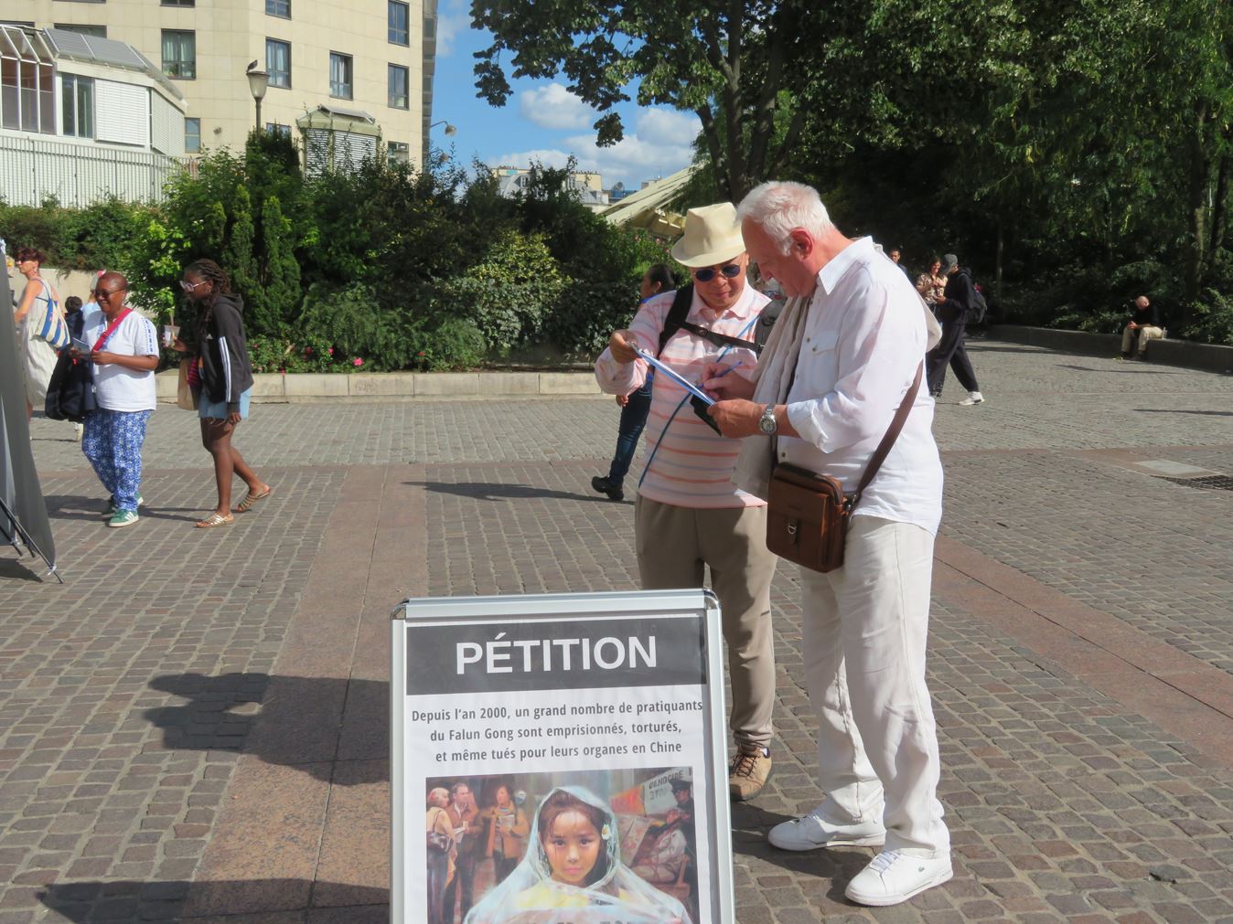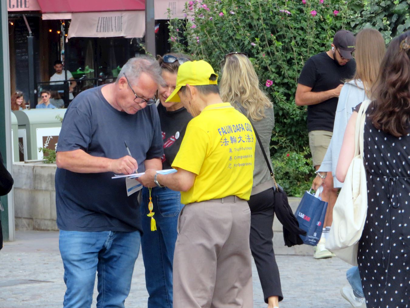 当天天晴气爽,外出散步的民众和游人路过活动地点时,被法轮功学员的功法演示和展板吸引,都想要了解个究竟。得知在中国,法轮功学员因为修炼真、善、忍而遭受中共迫害,甚至被活摘器官,人们感到震惊、愤怒,谴责中共对无辜修炼人的迫害,纷纷在反迫害征签表上签字,支持法轮功学员的活动。有些人想学炼法轮功,打听炼功点和法轮功九天班的信息,并要上网查看更多相关资料。