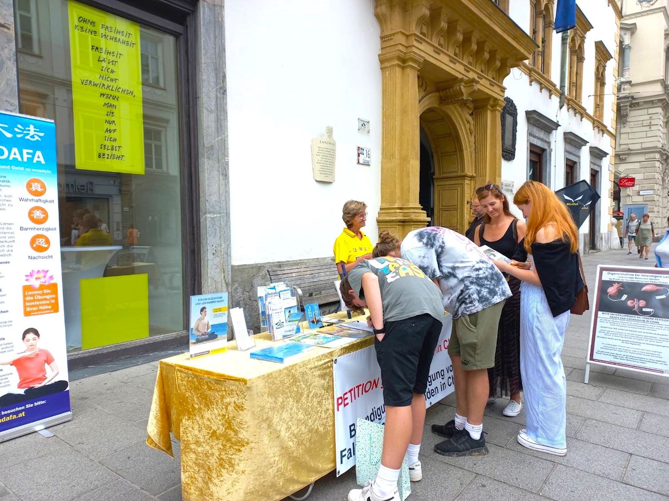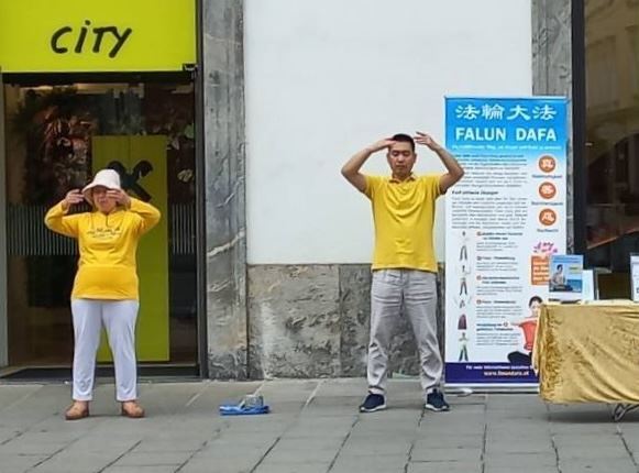 在赫尔伦(Herrengasse)商业街旁,法轮功学员们展示了五套功法,并向民众讲述大法的美好和中共的迫害。真相点旁边就是施蒂里亚州(Steiermark)议会大厅的入口处。