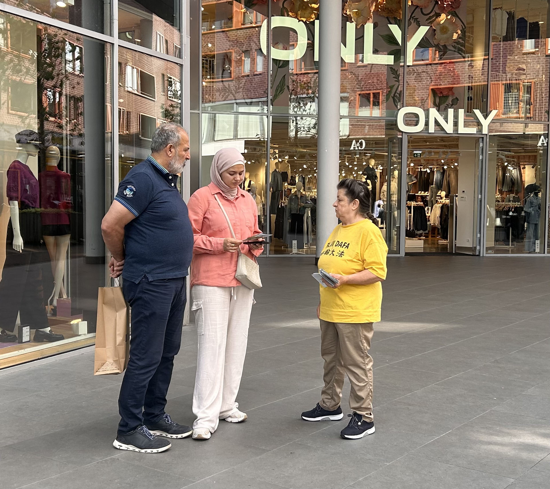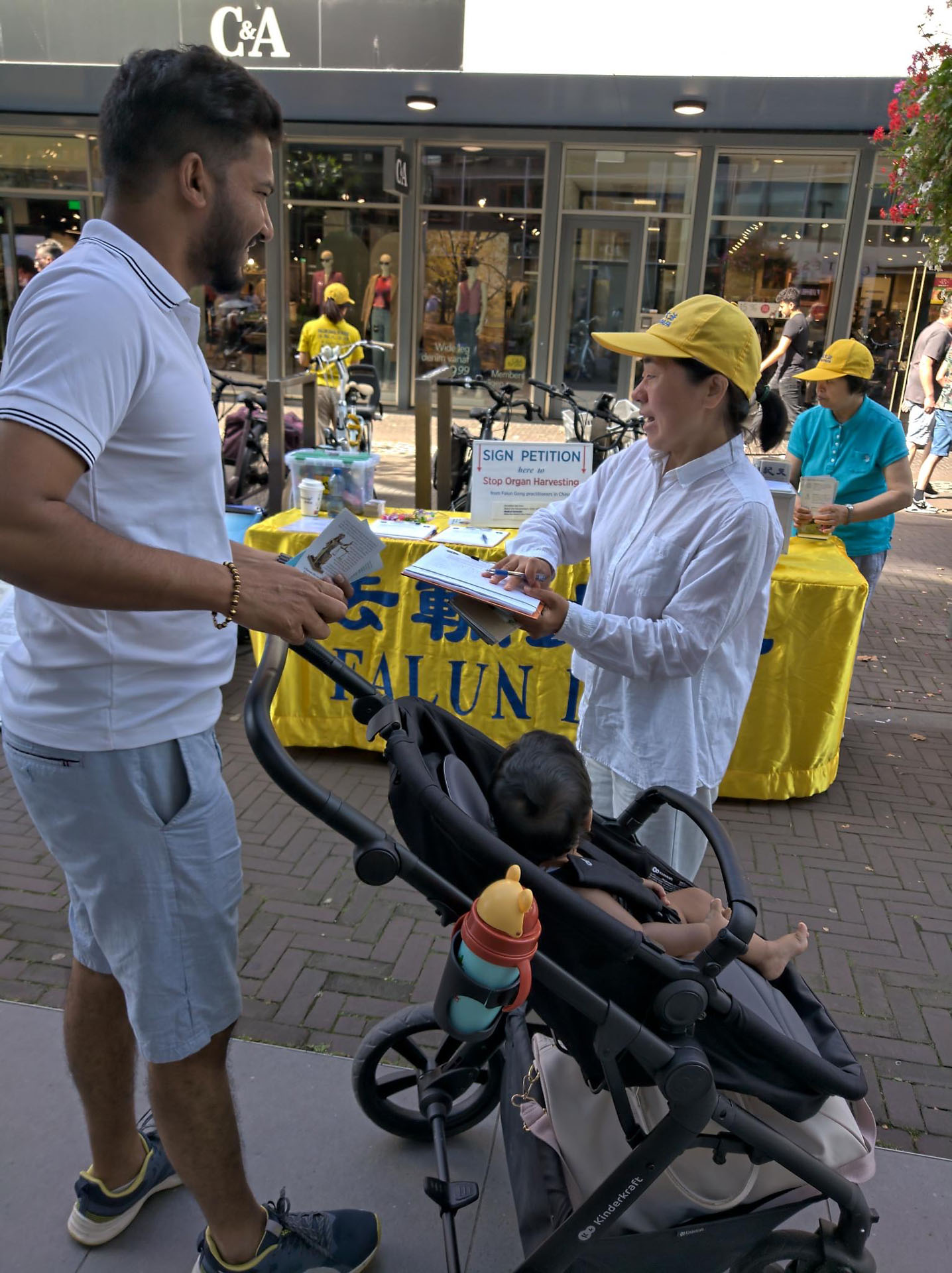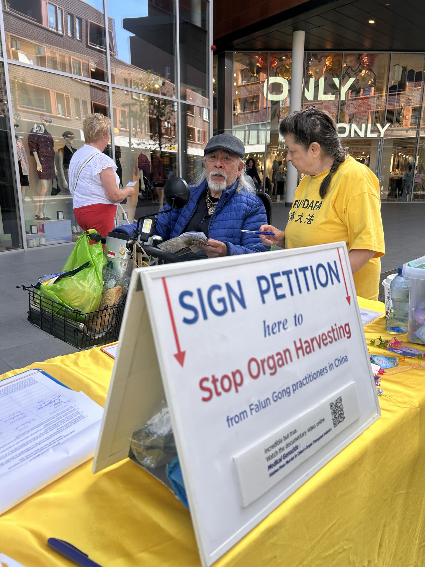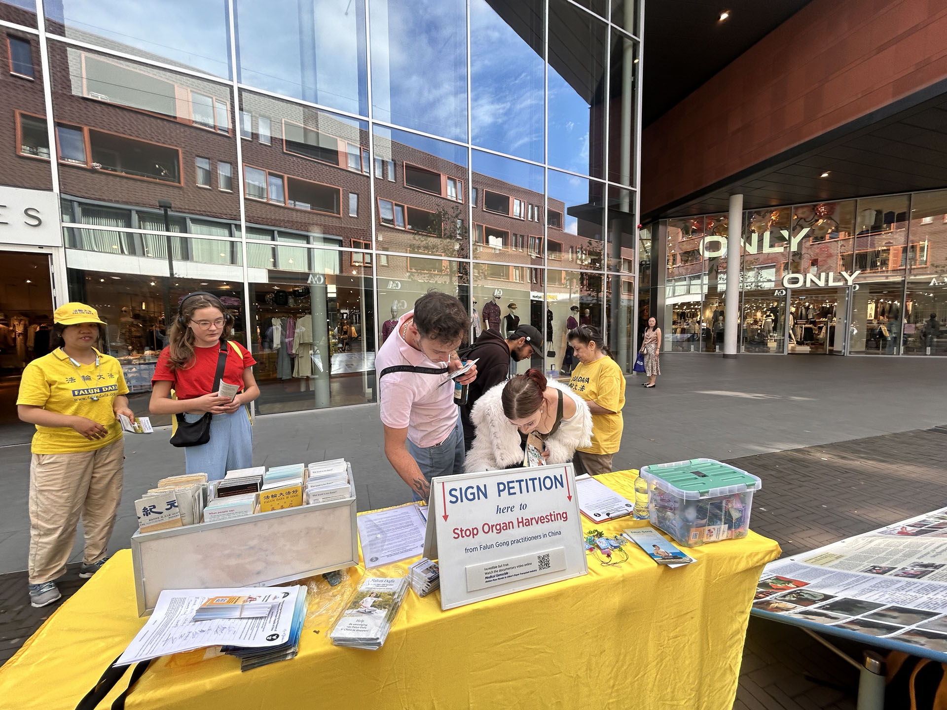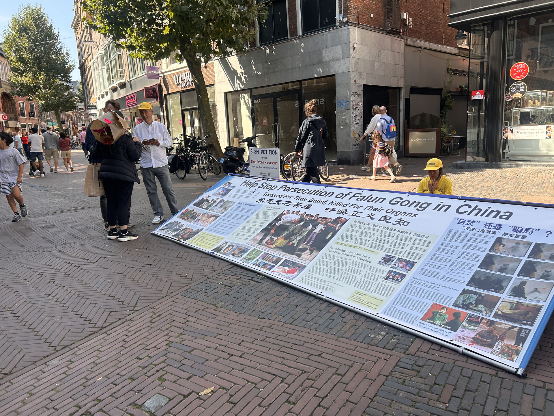 八月三十一日,学员们在哈勒姆市中心商业区布置介绍大法弘传世界和中共酷刑迫害法轮功的两块展板,向过往民众派发传单,征集反对活摘器官的签名。