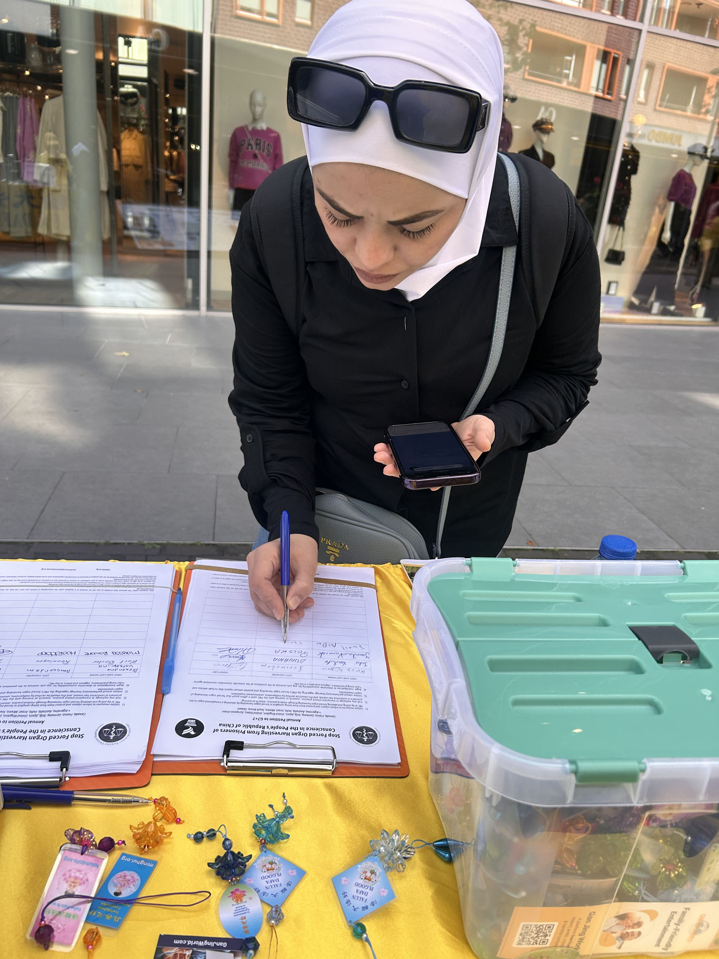 一对来自波兰的游客签名之后,向学员要了波兰语的大法网址,想了解更多真相信息;一个菲律宾女士询问自己的签名会有什么帮助,学员给她看了反对强摘器官医生组织(DAFOH)向七国集团(G7+7)发起的请愿书,她马上在征签表上签名表示反对迫害。