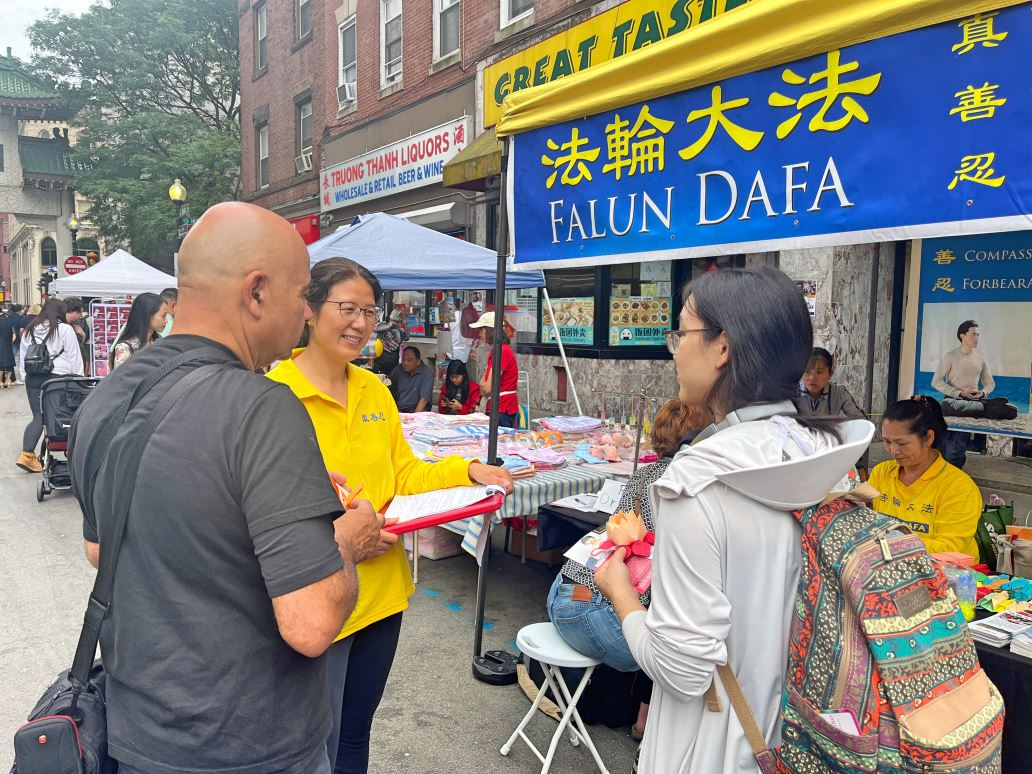 一位在中国城工作的中年男子来到法轮大法展位。他说有一次去纽约出差,曾遇到了法轮功学员在征签。他表示自己信奉神佛,非常反对中共对法轮功信仰团体的迫害。他说每天出来吃午饭的时候都会看到法轮功学员在中国城炼功,他很想一起跟着炼,但因时间限制未能参加。他表示想报名参加九月底学炼法轮功的“九天班”。