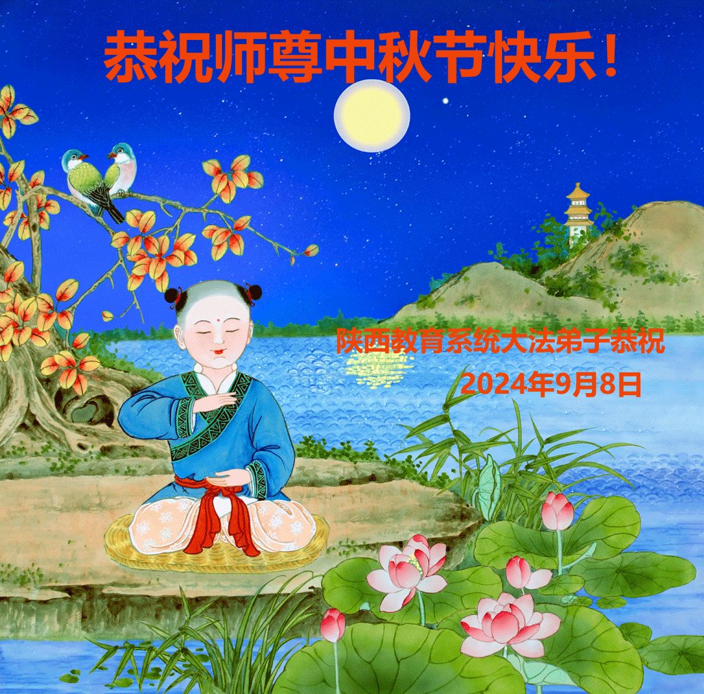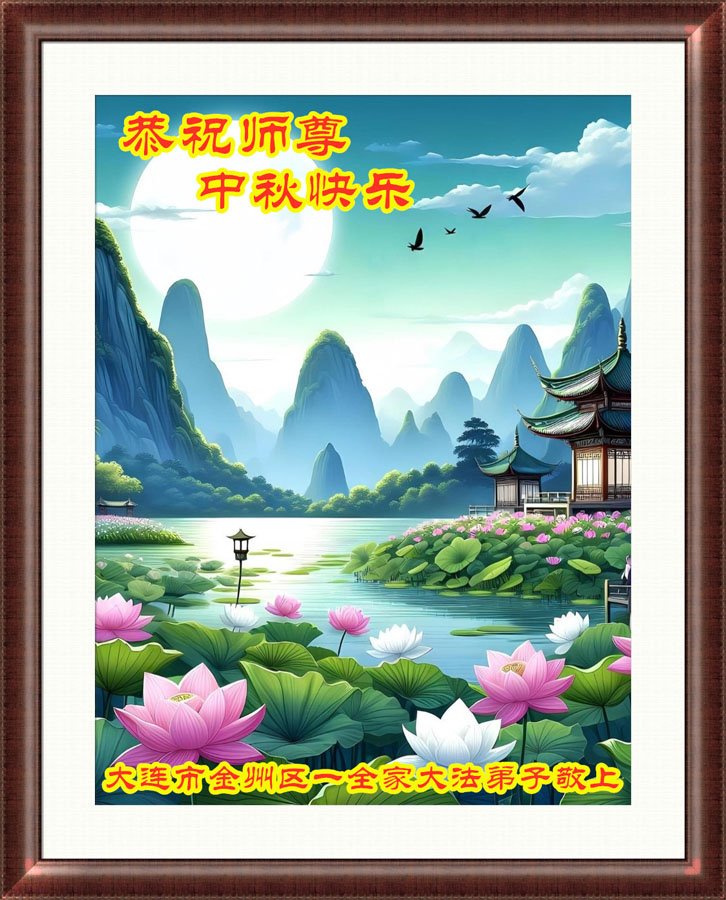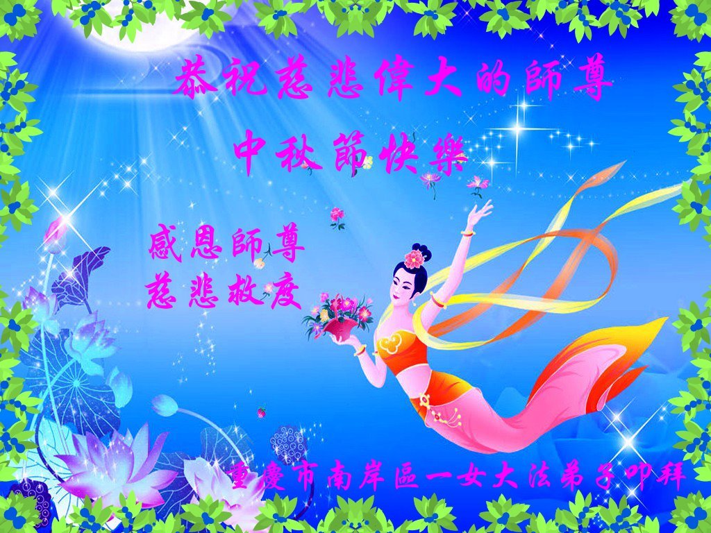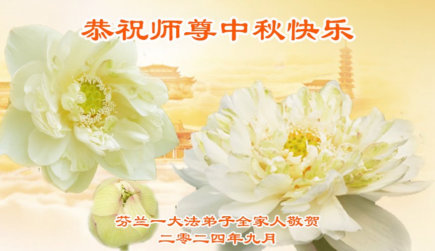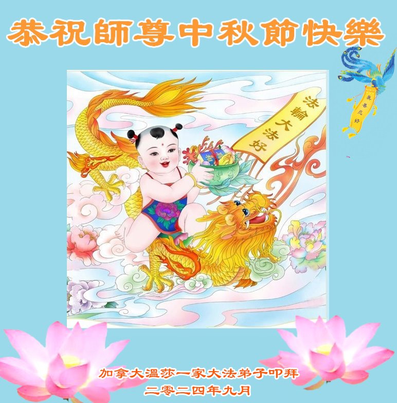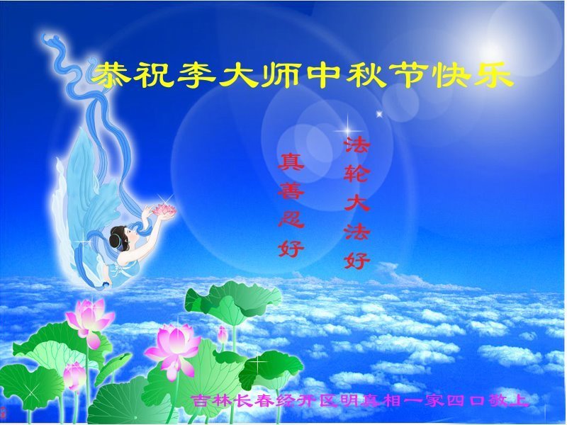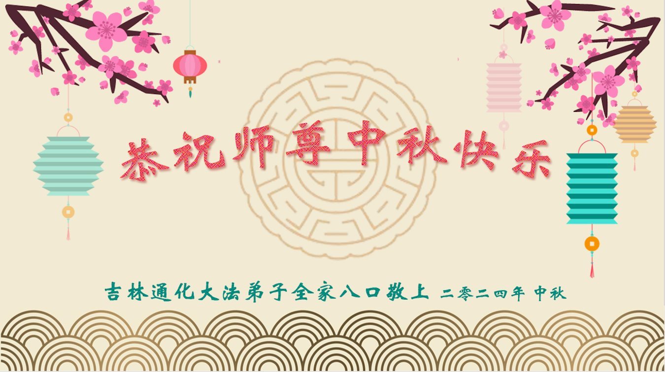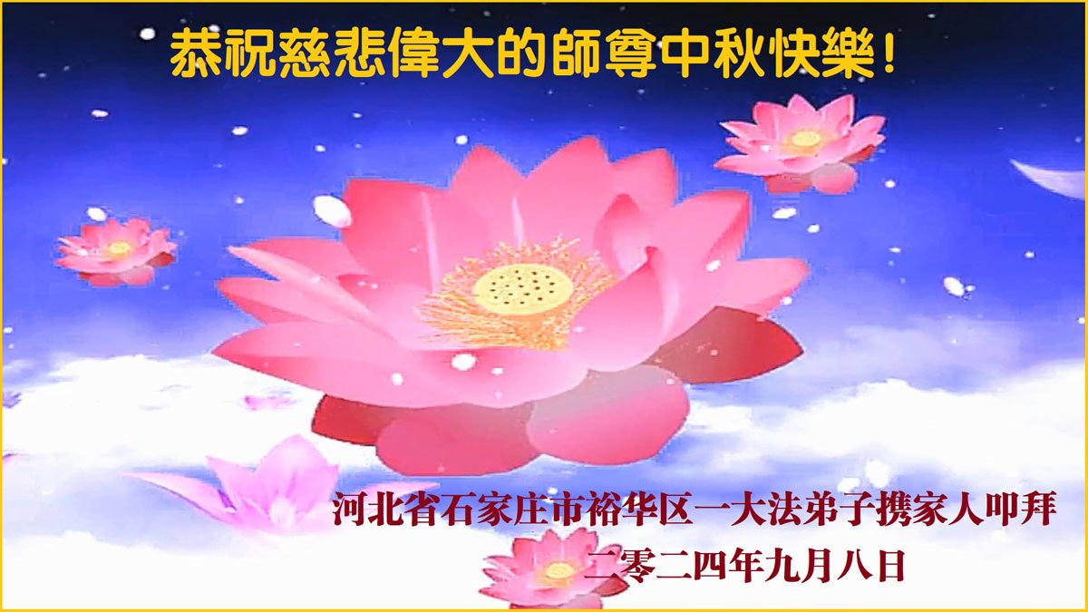 弟子和家人同修恭祝师父中秋节快乐!感恩师父对弟子和家人同修的一路慈悲看护!弟子也感恩师父对弟子的一切慈悲安排!弟子一定努力多学法炼功,用心做好救人的事情,修去妒嫉心,怨恨心,及人心,人念,人情,努力做好师父让弟子做的救人的事,跟随师父回家!
