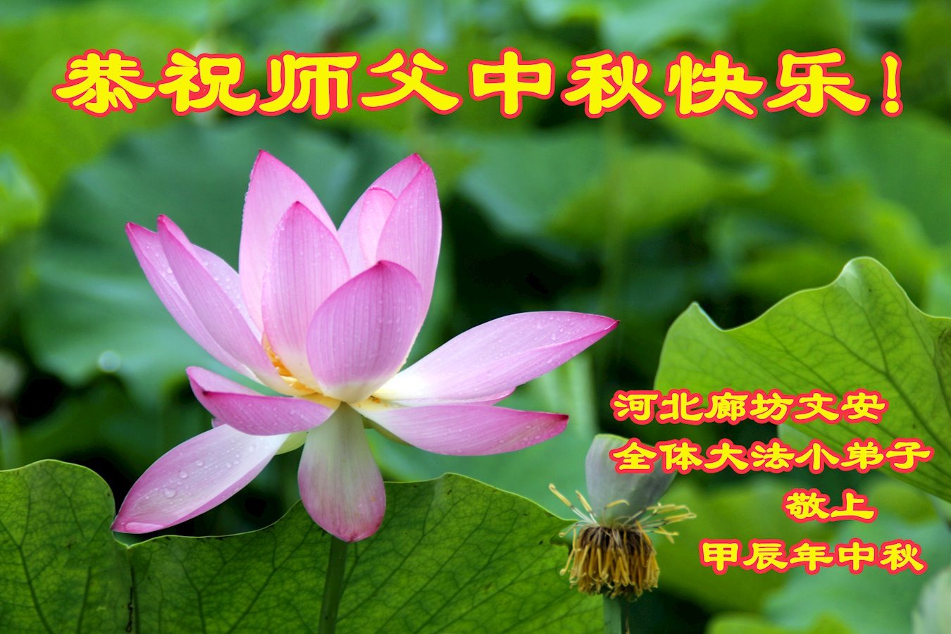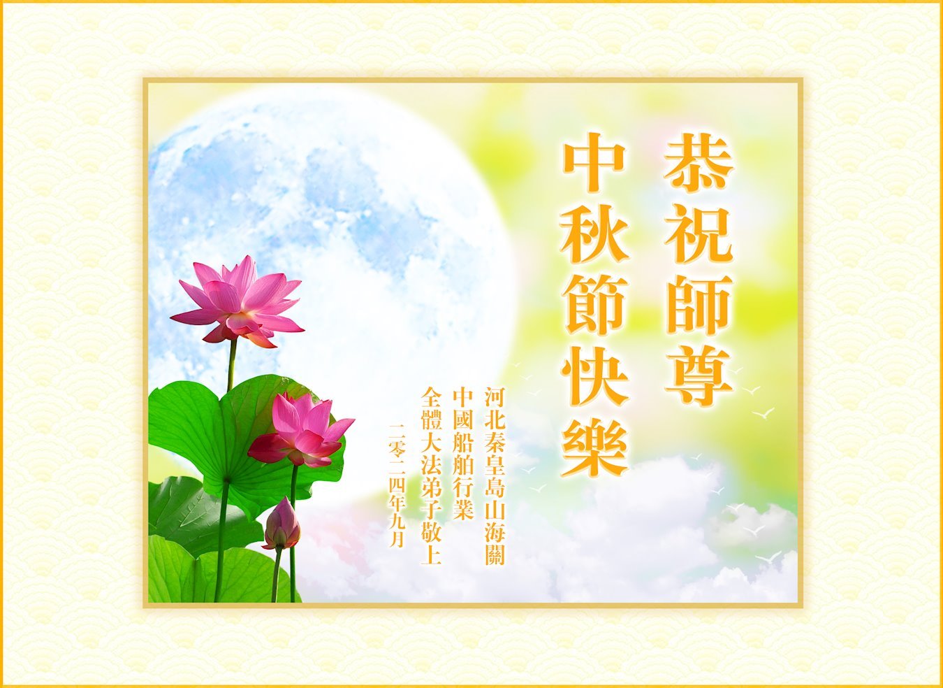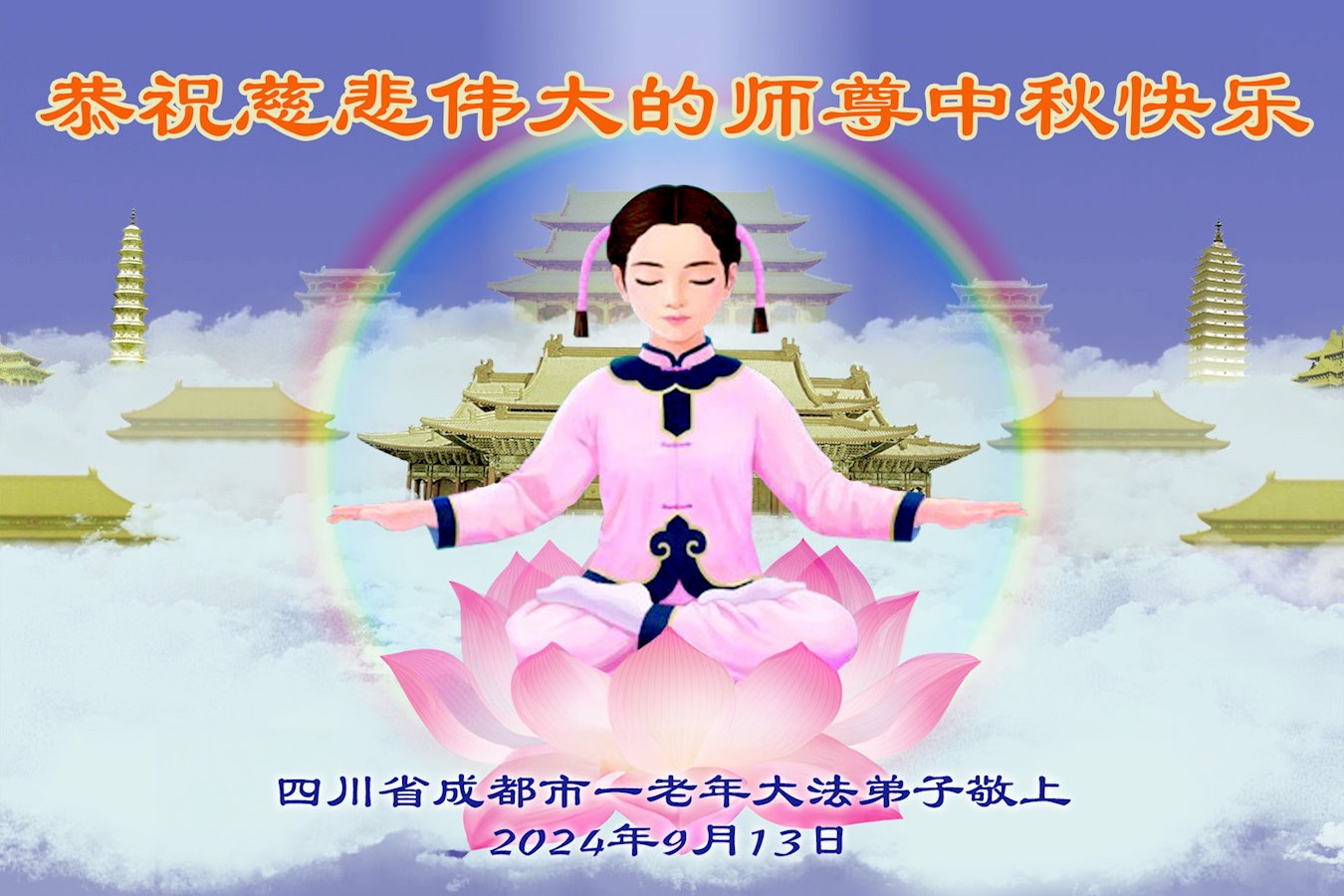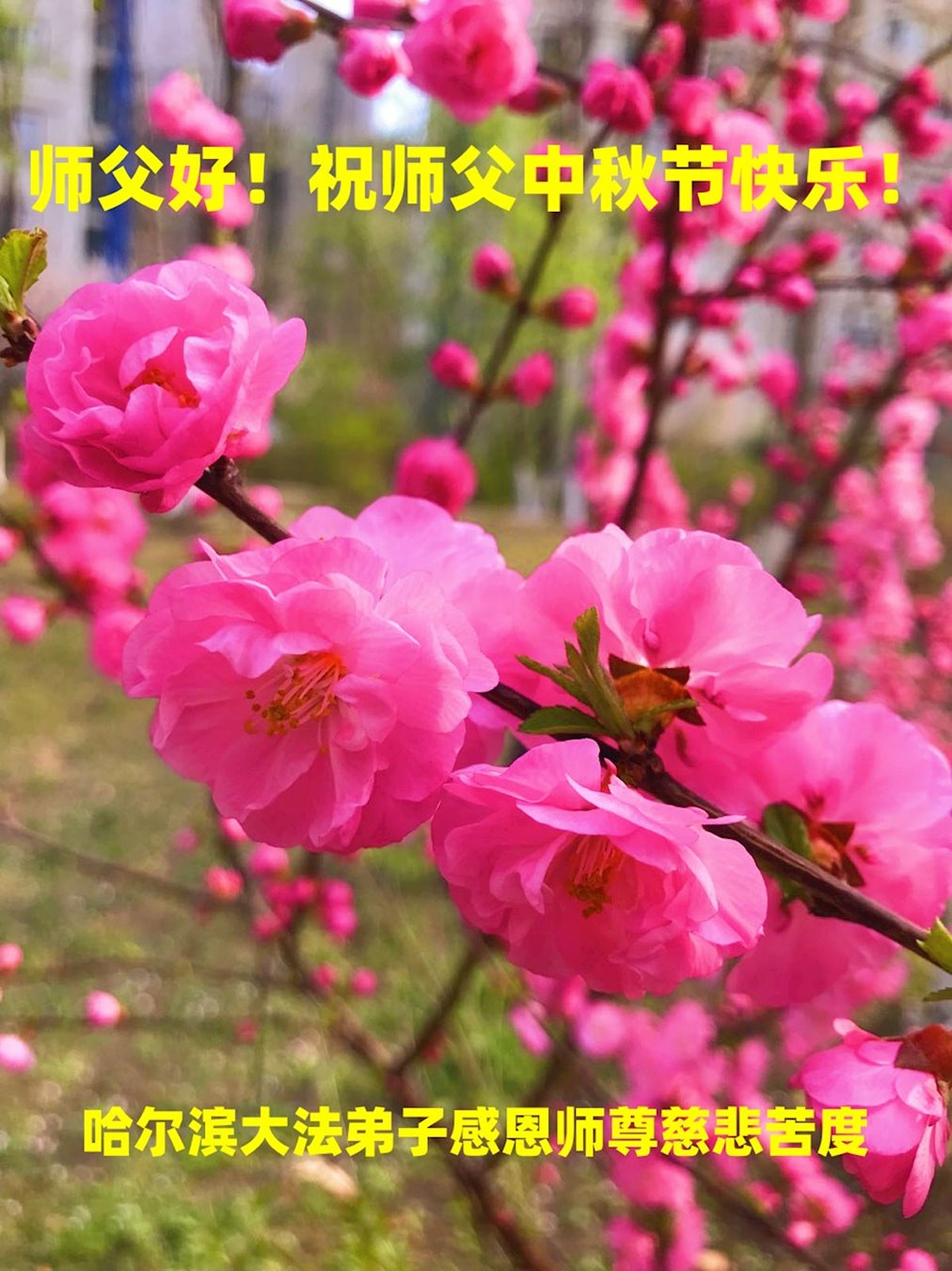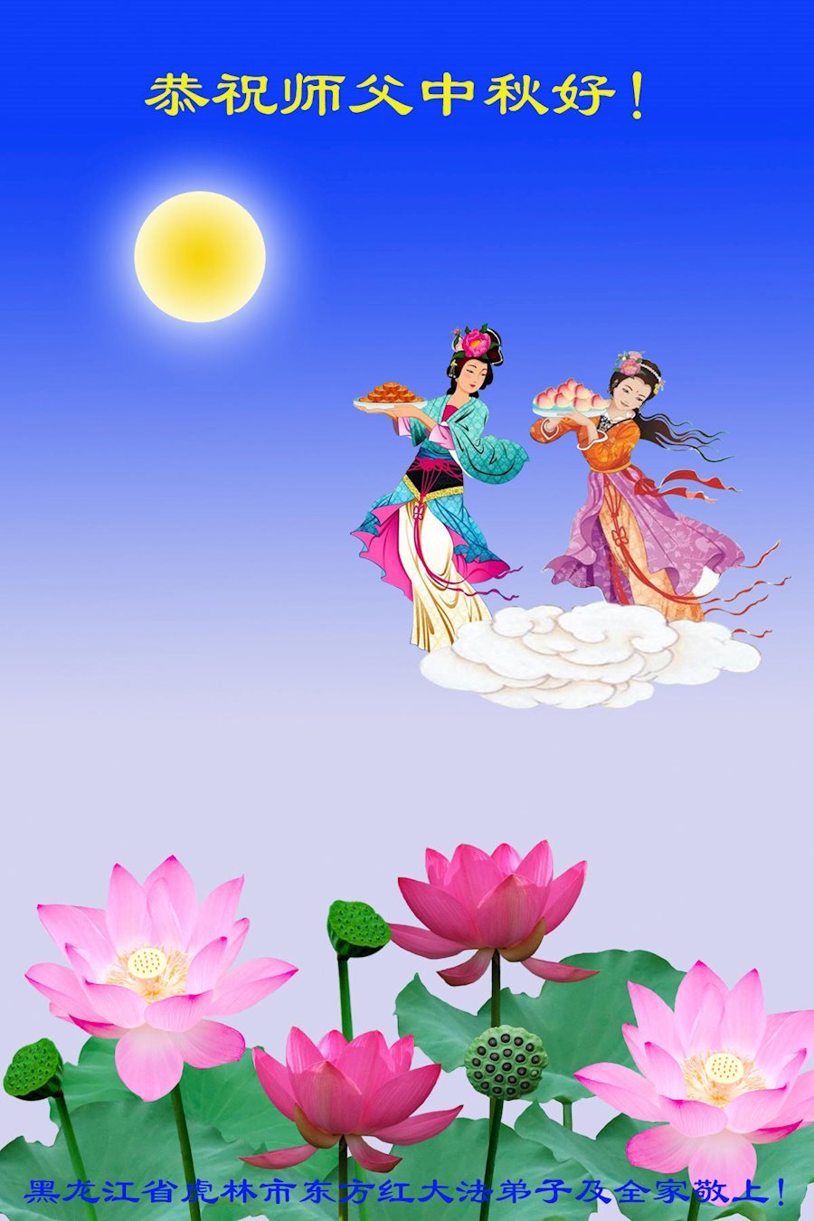 弟子和家人同修恭祝师父中秋节快乐!感恩师父对弟子和家人同修的一路慈悲看护!弟子也感恩师父对弟子的一切慈悲安排!弟子一定努力多学法炼功,用心做好救人的事情,修去妒嫉心,怨恨心,及人心,人念,人情,努力做好师父让弟子做的救人的事,跟随师父回家!