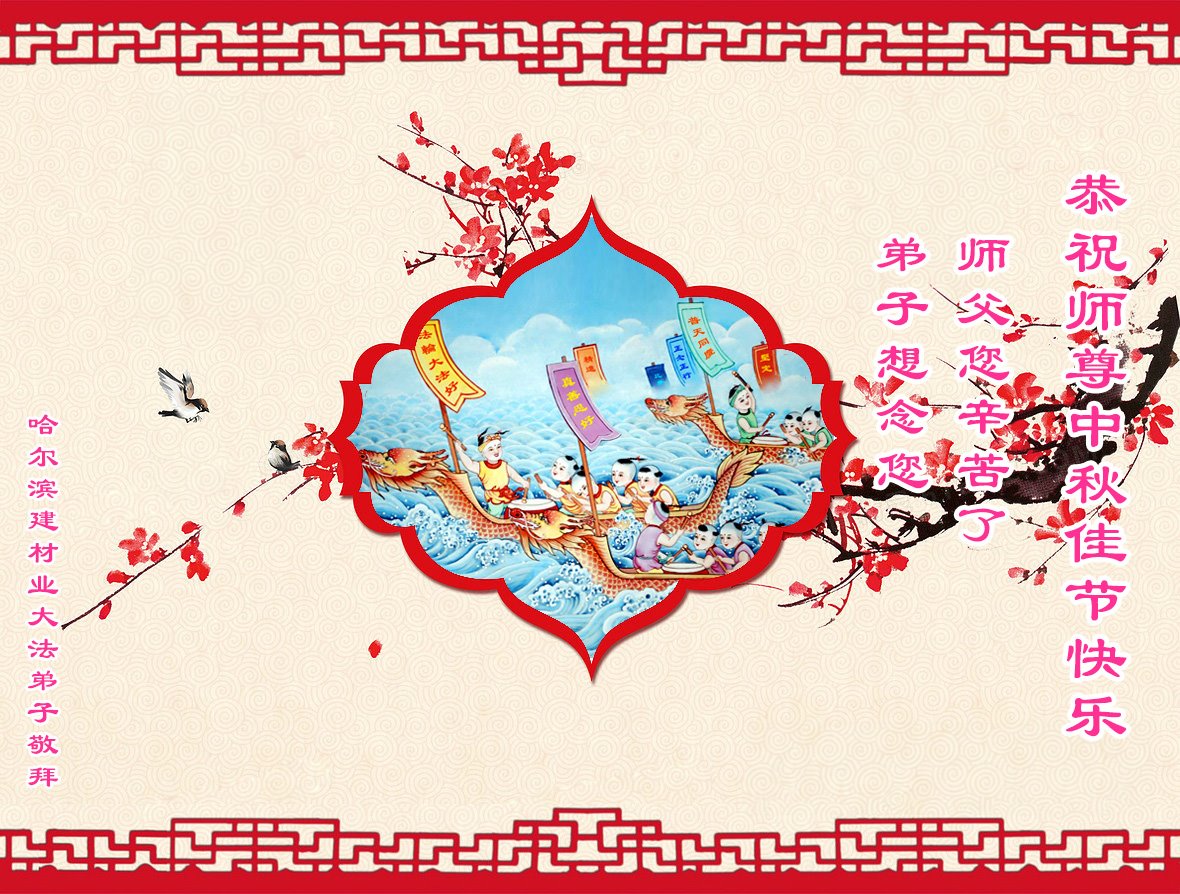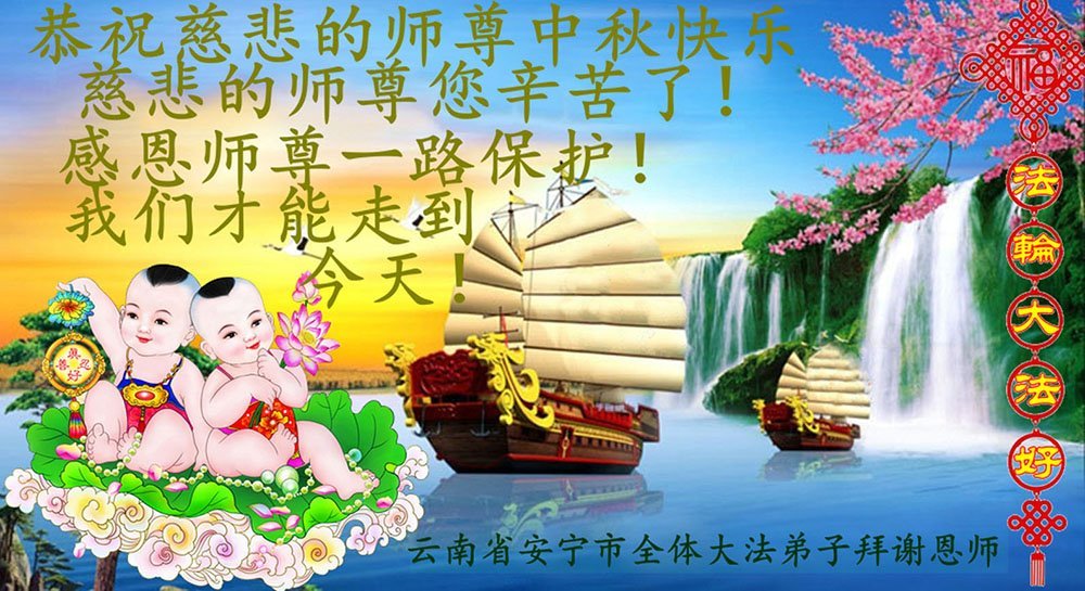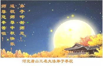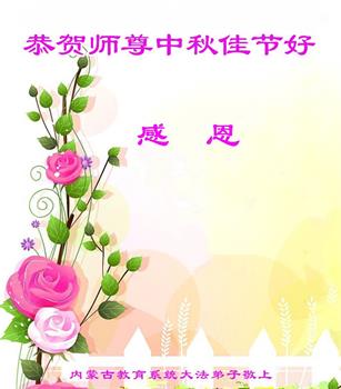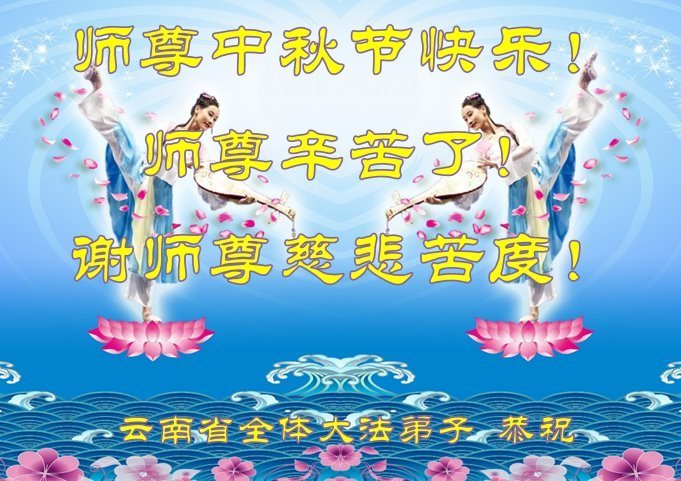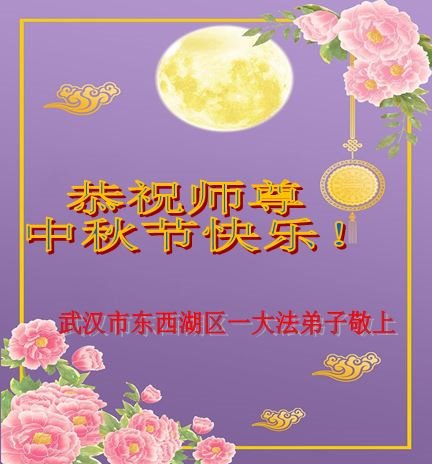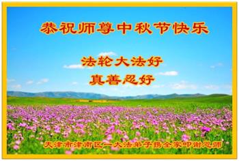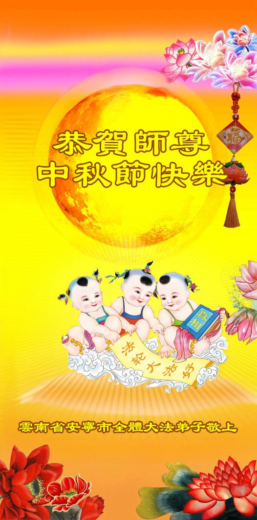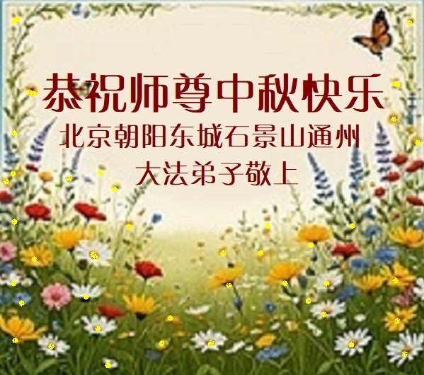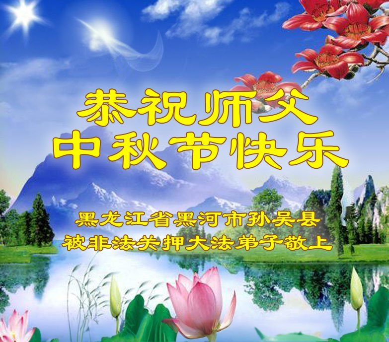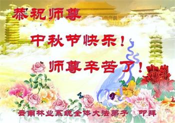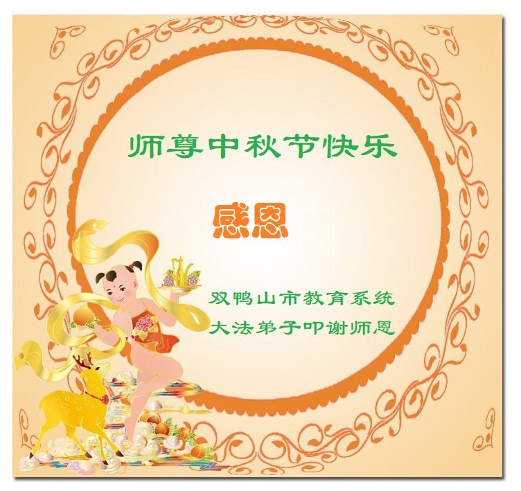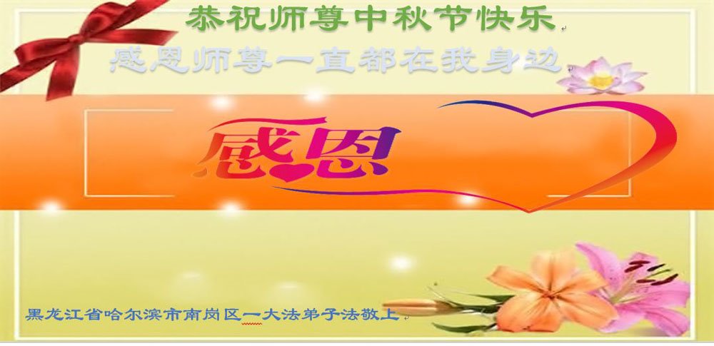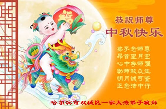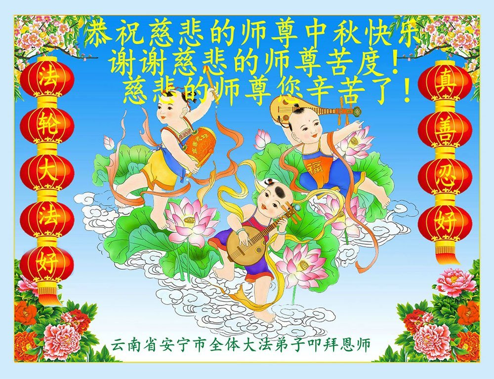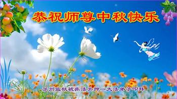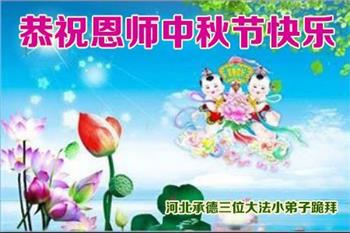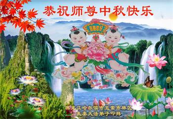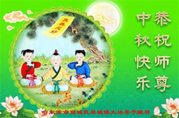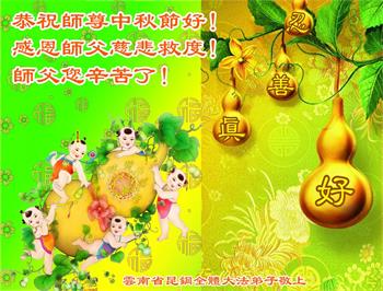 以下来自北京市、天津市、上海市、黑龙江省、吉林省长春市、吉林市、辽宁省沈阳市、新宾县、鞍山市、内蒙古自治区、宁夏回族自治区、山东省菏泽市、河北省石家庄市、河南省许昌市、三门峡市、湖北省武汉市、咸宁市、江苏省连云港市、浙江省、四川省自贡市、云南省等地的被非法关押大法弟子,以及被非法关押在黑龙江省泰来监狱、呼兰监狱、河南省新乡监狱、江苏省苏州监狱、云南省昆明监狱的大法弟子托亲友们发来敬献给慈悲伟大的师父的中秋贺词贺卡。