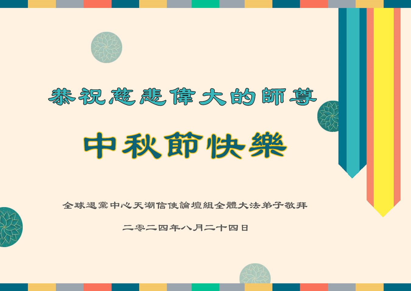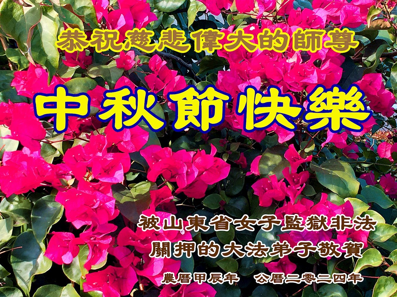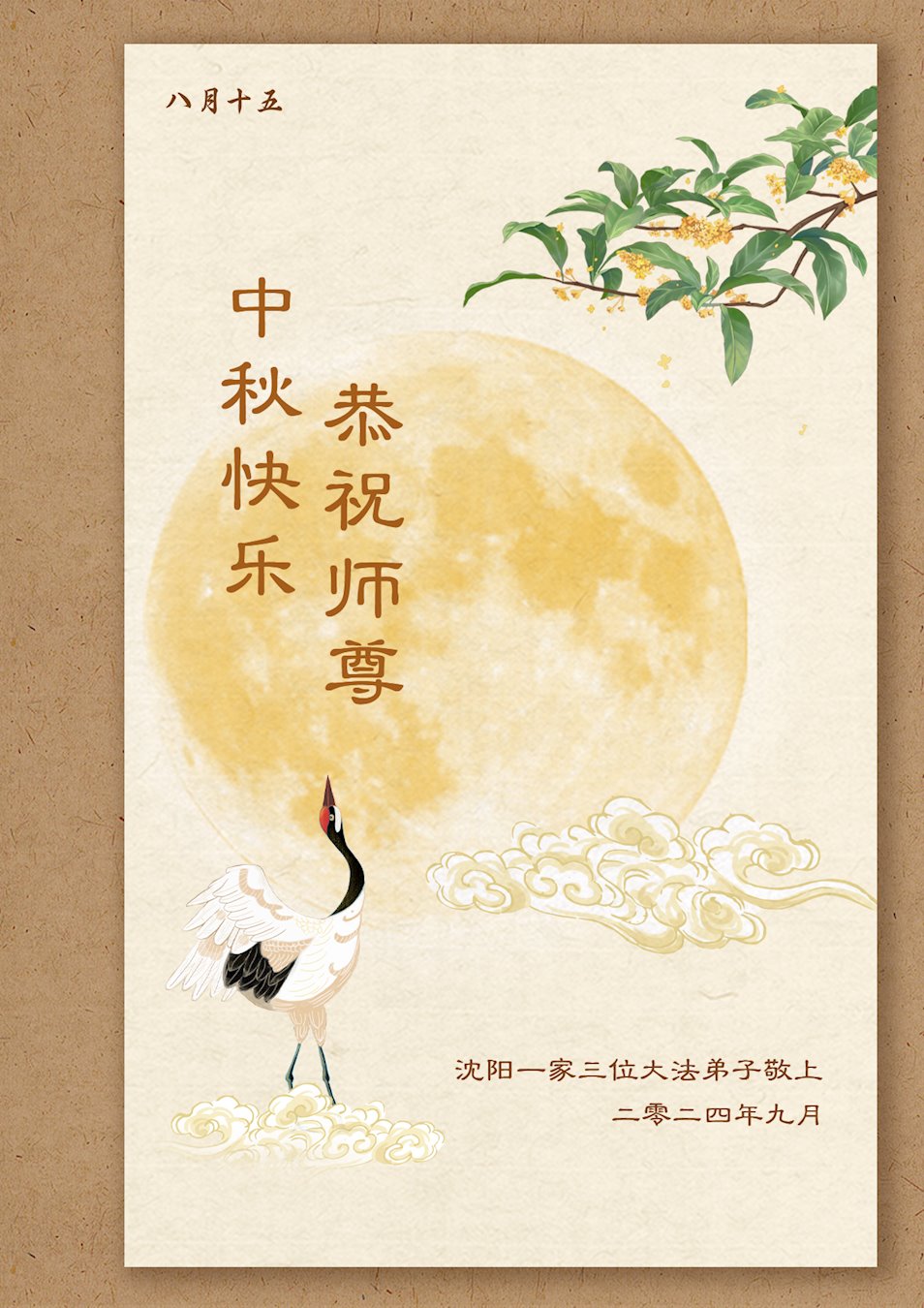 【明慧网二零二四年九月十七日】在甲辰中秋节之际,一张张飞出牢笼的贺卡诉说着在中国大陆身陷囹圄的大法弟子的心声:“禁锢的高墙也阻挡不了我们对师尊的问候、想念、祝贺!”“弟子们一定坚信师尊,在邪窝里坚持劝三退救人。”“环境再恶劣、迫害再邪恶,我们都坚信:正义光明的一天一定会到来。”