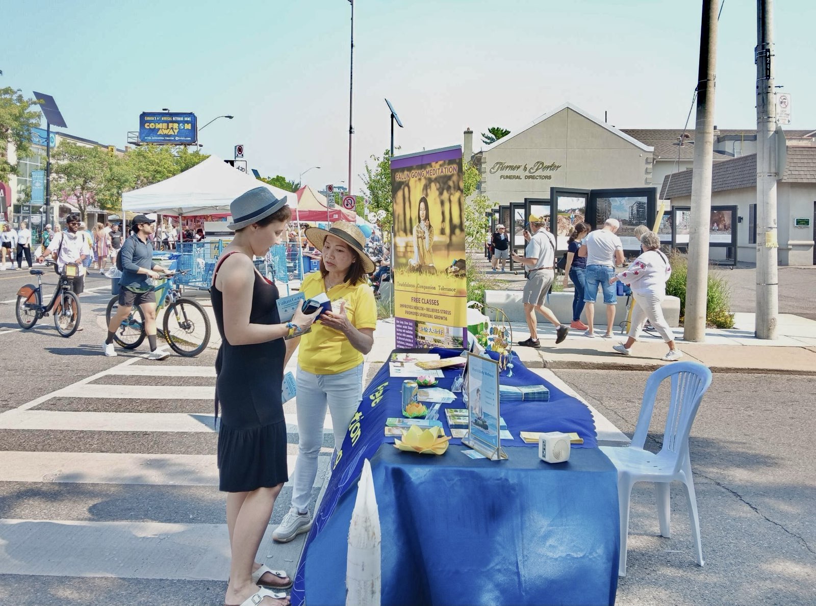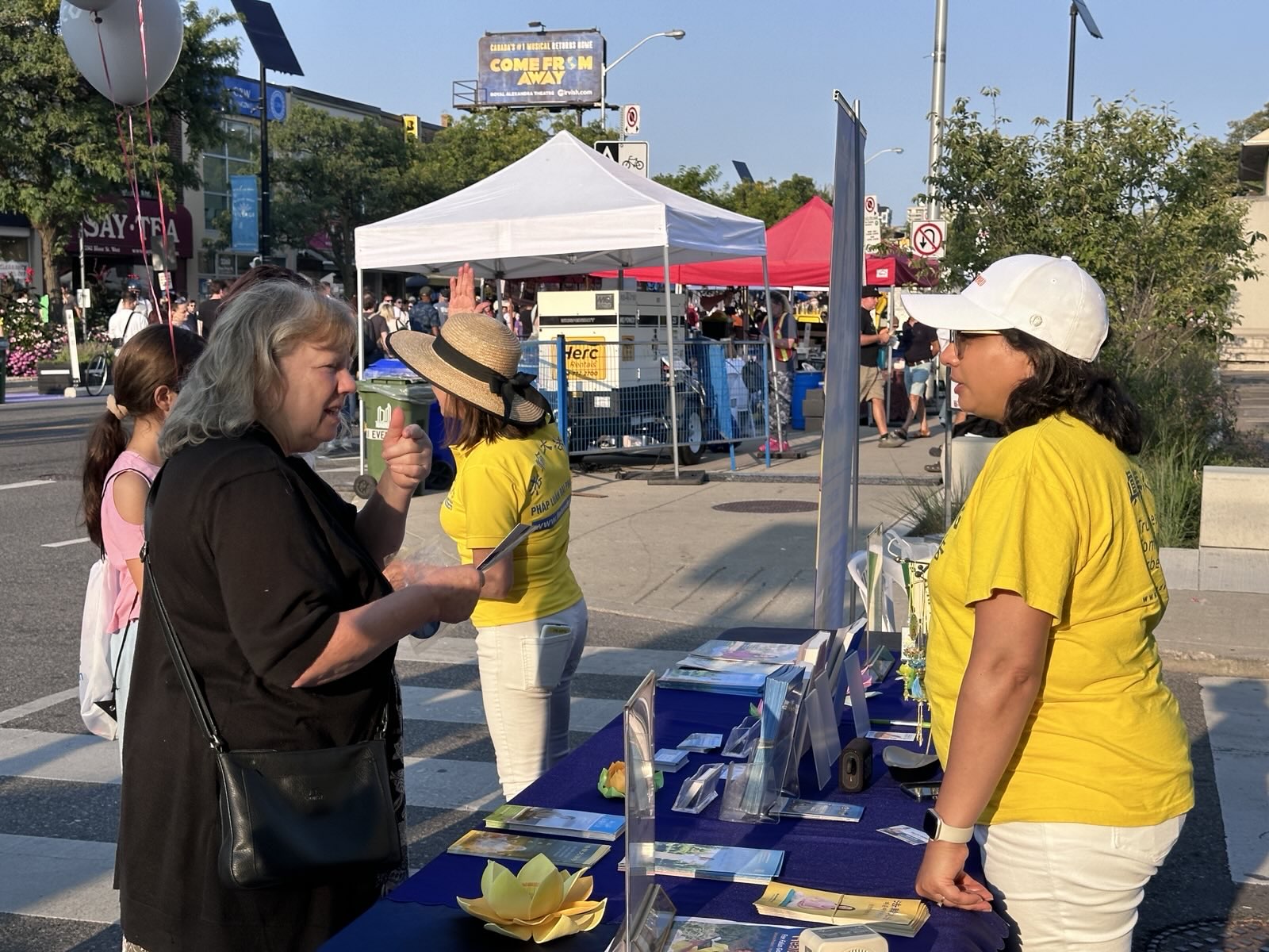 安朱(Anju)和她的丈夫来自印度,她曾从事金融服务工作,现在定居在加拿大。他们在展位前驻足,她丈夫对学员说:“我知道法轮功起源于中国,但是现在在中国被禁止了。我认为这场迫害是不合理的。”听完丈夫所讲的内容,安朱表示自己对功法产生好奇,于是学员介绍了功法的基本情况和相关书籍。