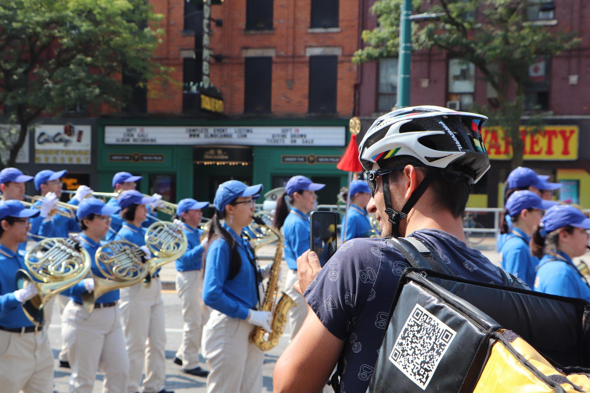 在游行刚开始的时候,有位留学生停下来拍照,学员向他介绍:“你看中共一直在迫害法轮功,但是法轮大法自一九九二年传出后,已弘传一百多个国家和地区,并在西方自由社会获得了支持。”那位留学生说:“我看到了,连警察都为你们开路。”学员又向他提到了中共不等于中国,只有退出中共组织才能和它划清界限。学生听完后表示:“阿姨您说得有道理,我愿意退出来。”并用自己的真实姓名做了“三退”。
