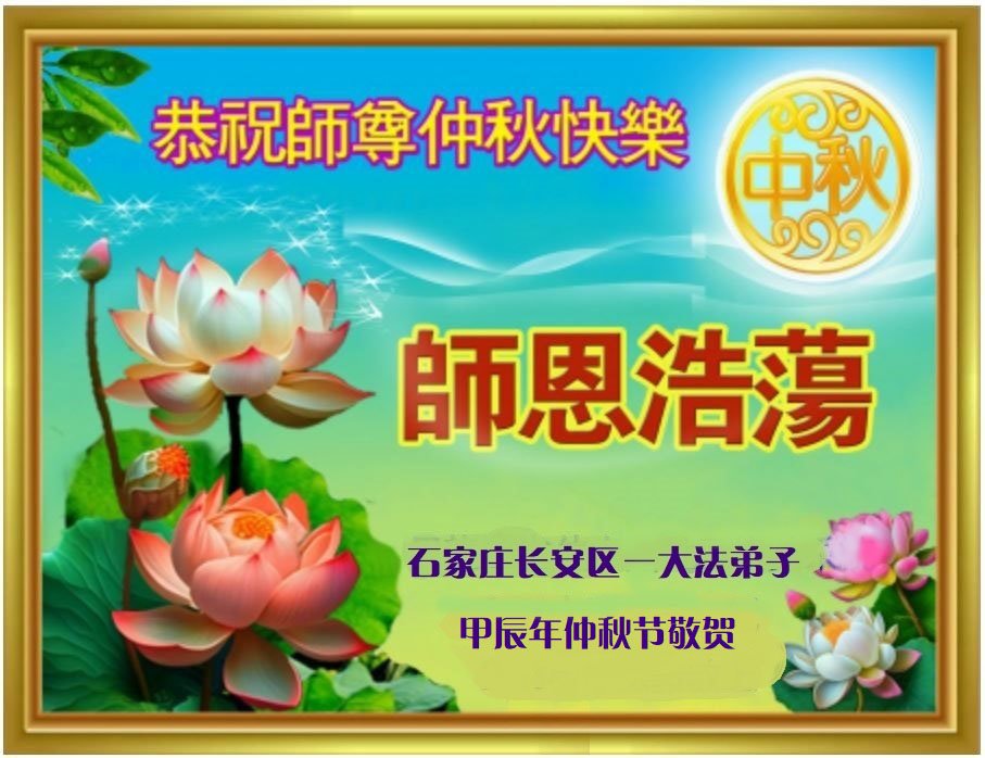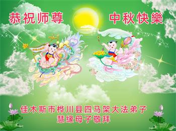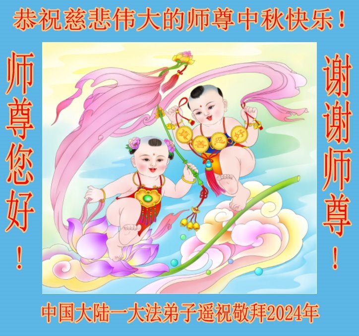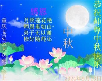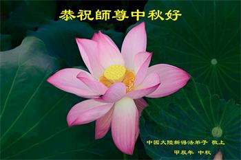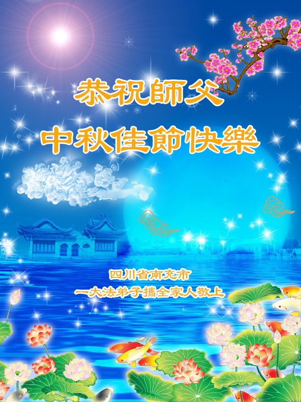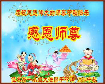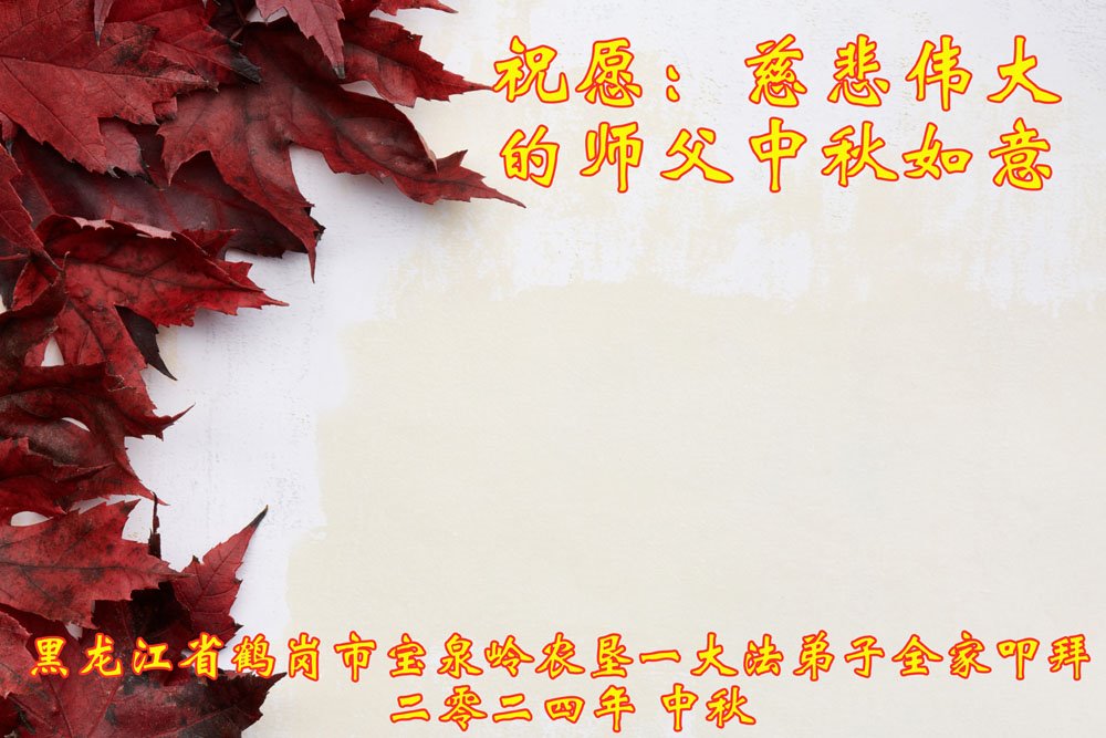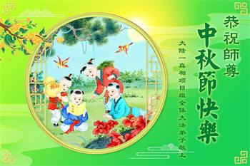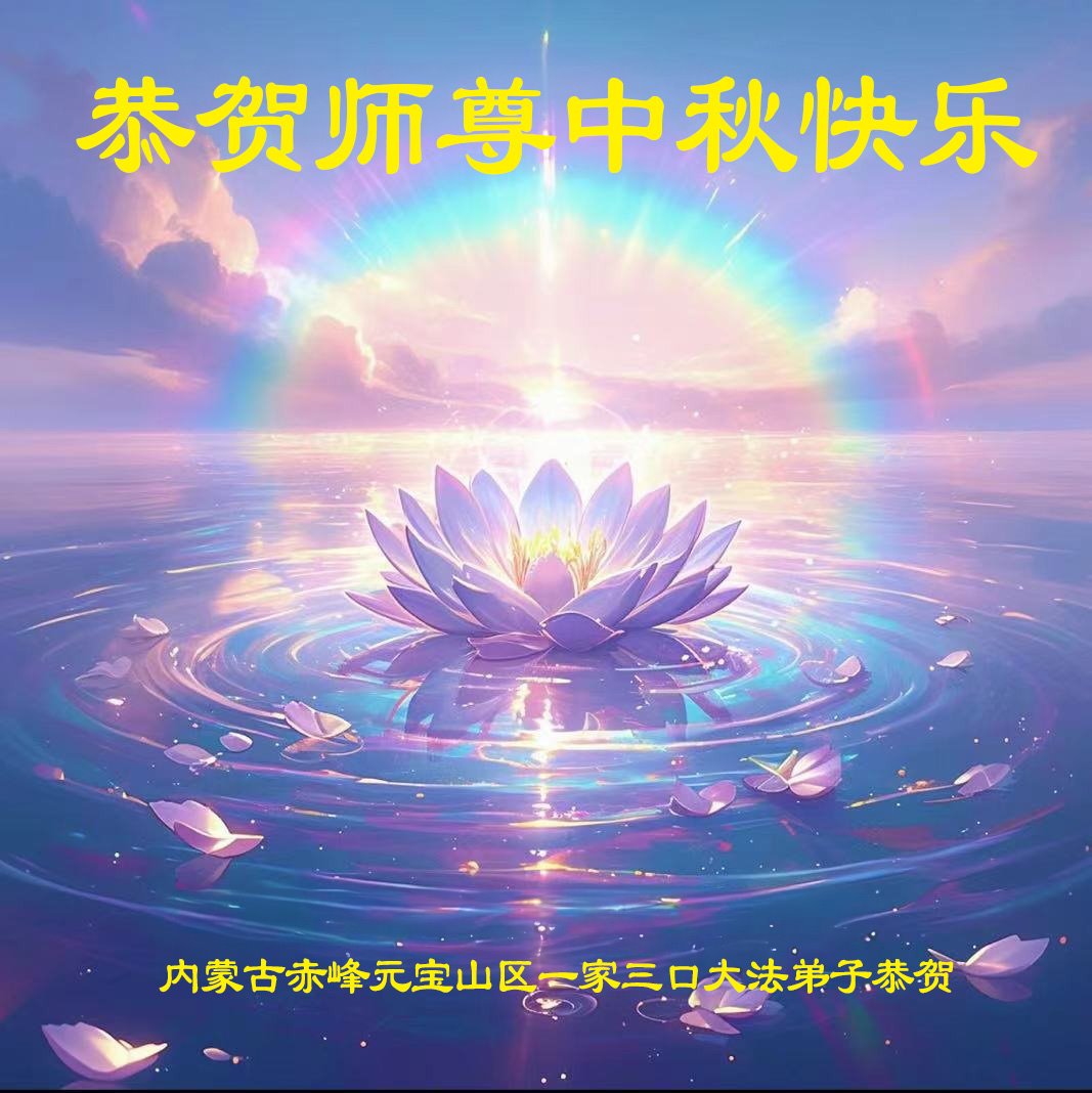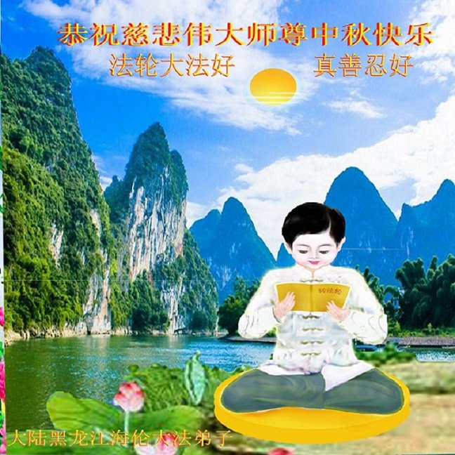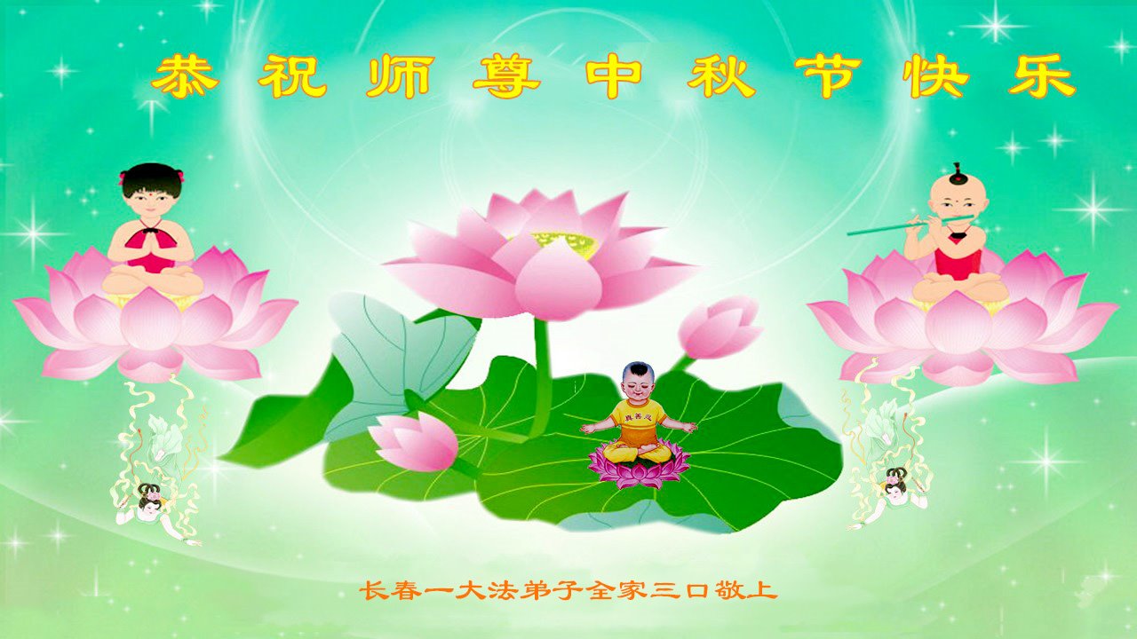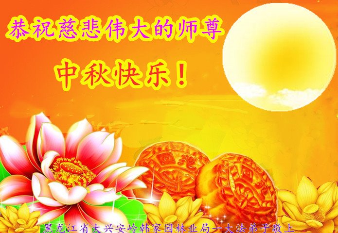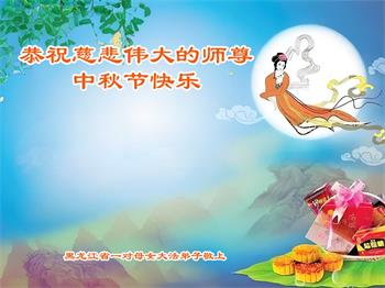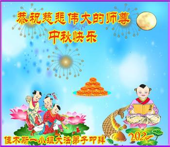 慈悲伟大的师尊好:我们在大陆都曾被邪恶残酷迫害,但我们不仅无悔,且深知能做师父的弟子是我们最大的荣耀与幸福。随师正法、救度众生是我们此生的意义与重任。弟子一定尽心、尽力去做,不负师尊的期望,不负众生的盼望。遥祝慈悲伟大的师尊中秋快乐!盼望师尊早日回大陆。