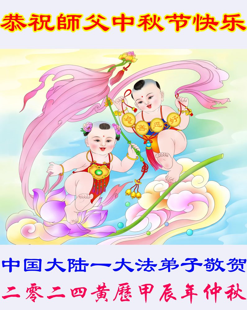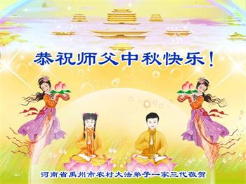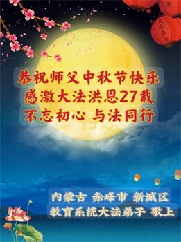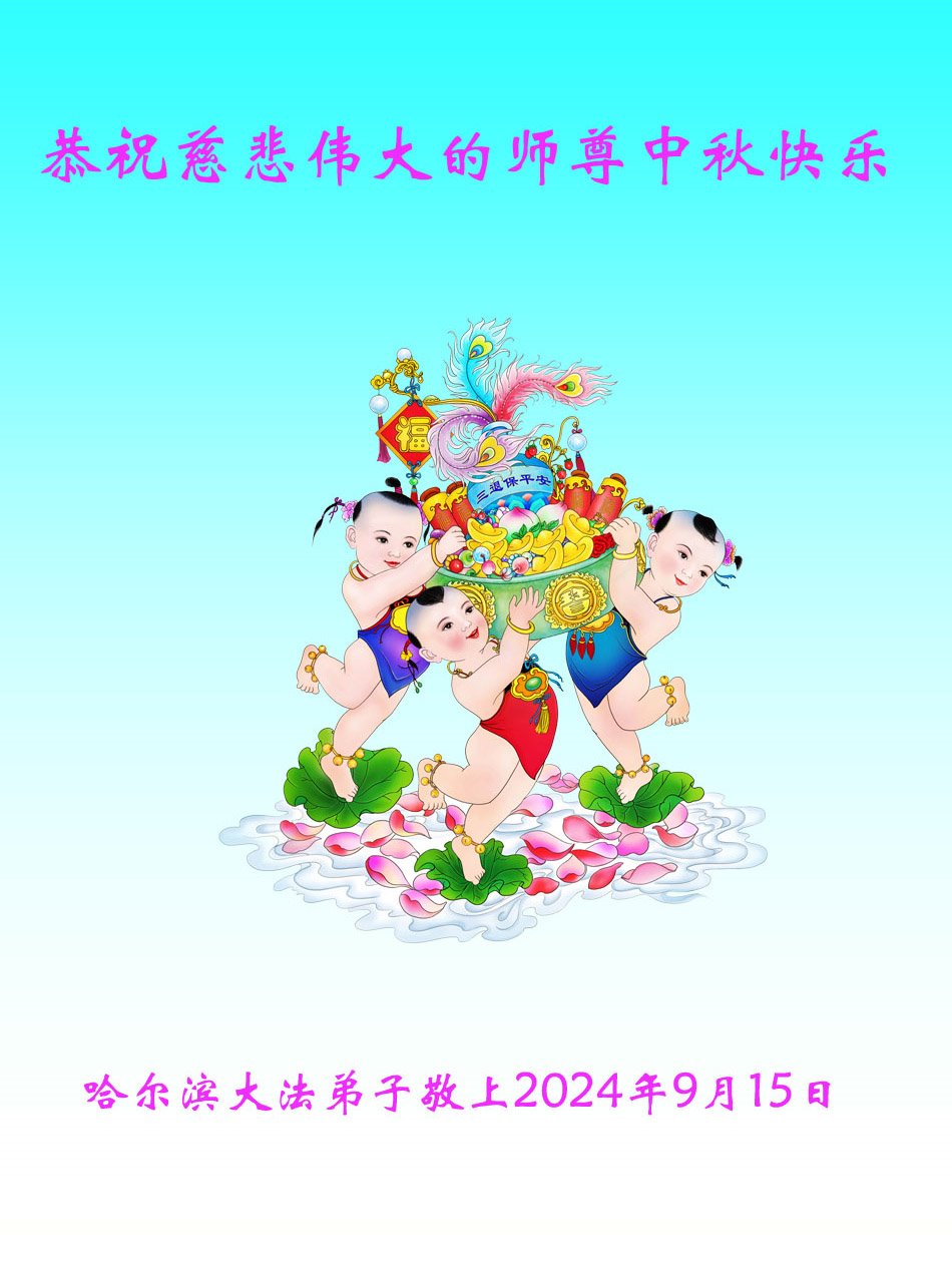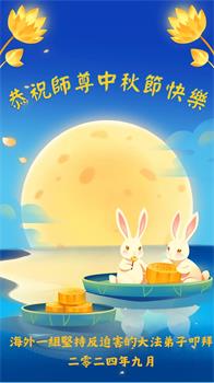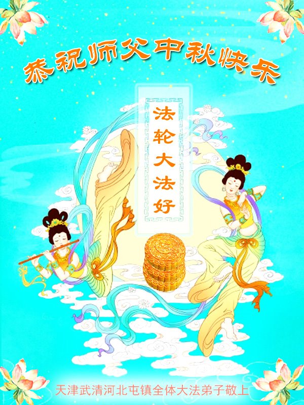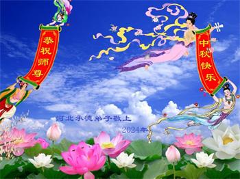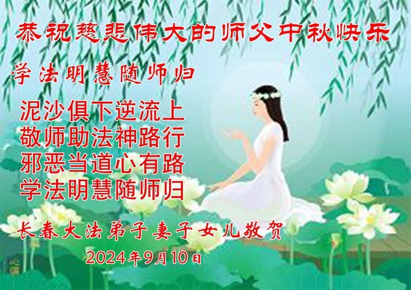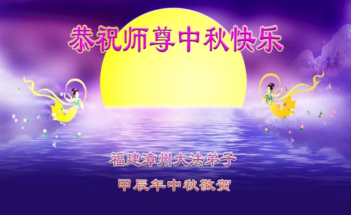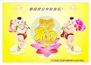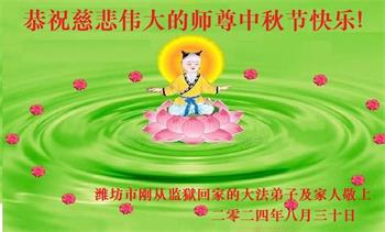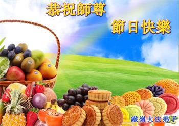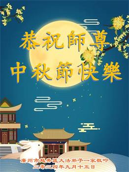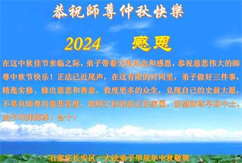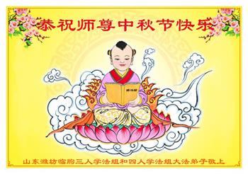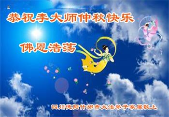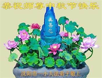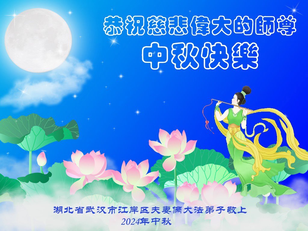 慈悲伟大的师尊好:我们在大陆都曾被邪恶残酷迫害,但我们不仅无悔,且深知能做师父的弟子是我们最大的荣耀与幸福。随师正法、救度众生是我们此生的意义与重任。弟子一定尽心、尽力去做,不负师尊的期望,不负众生的盼望。遥祝慈悲伟大的师尊中秋快乐!盼望师尊早日回大陆。