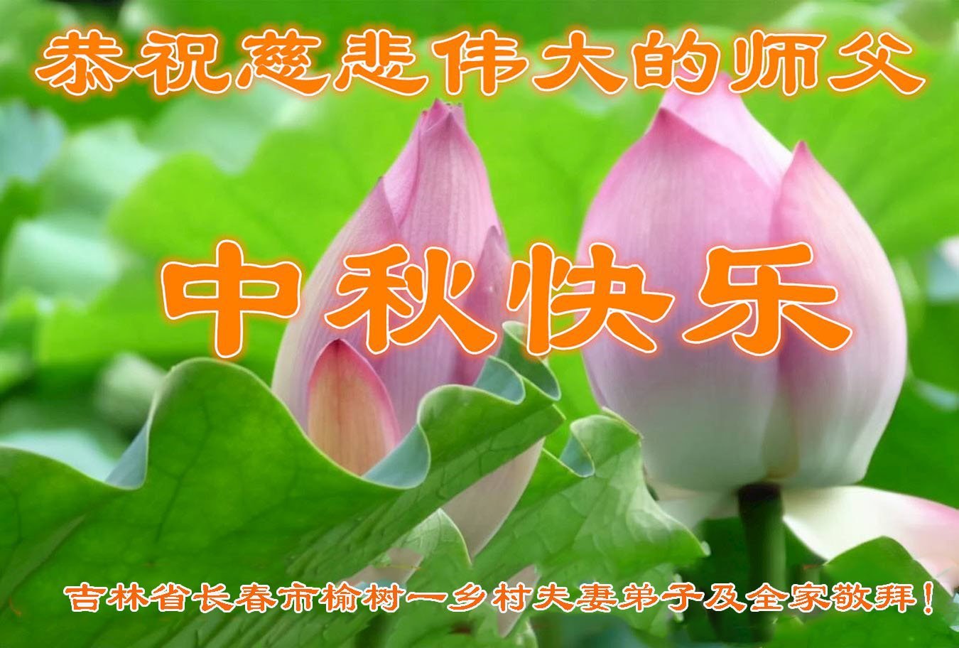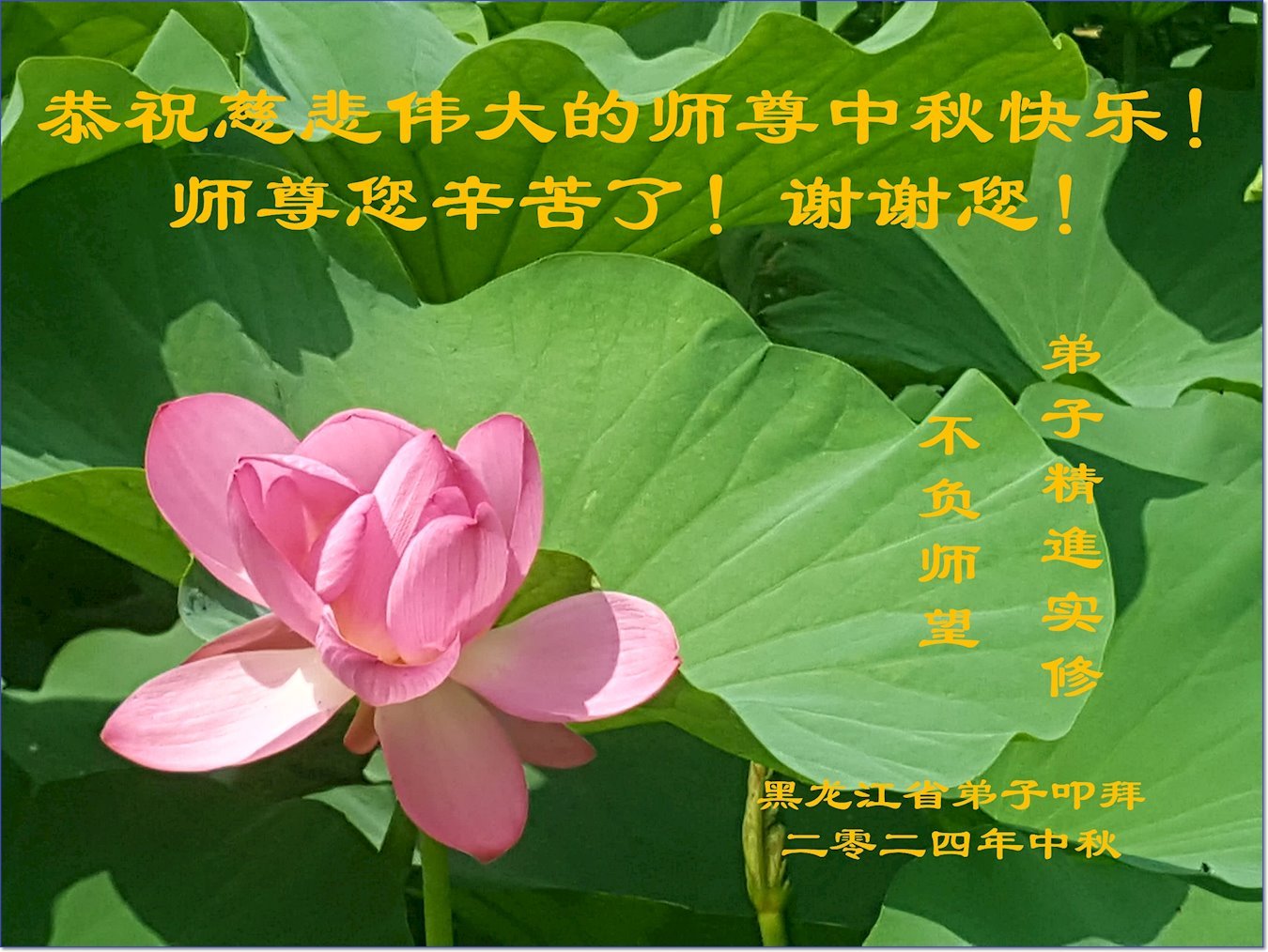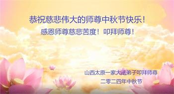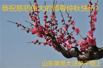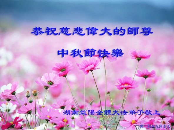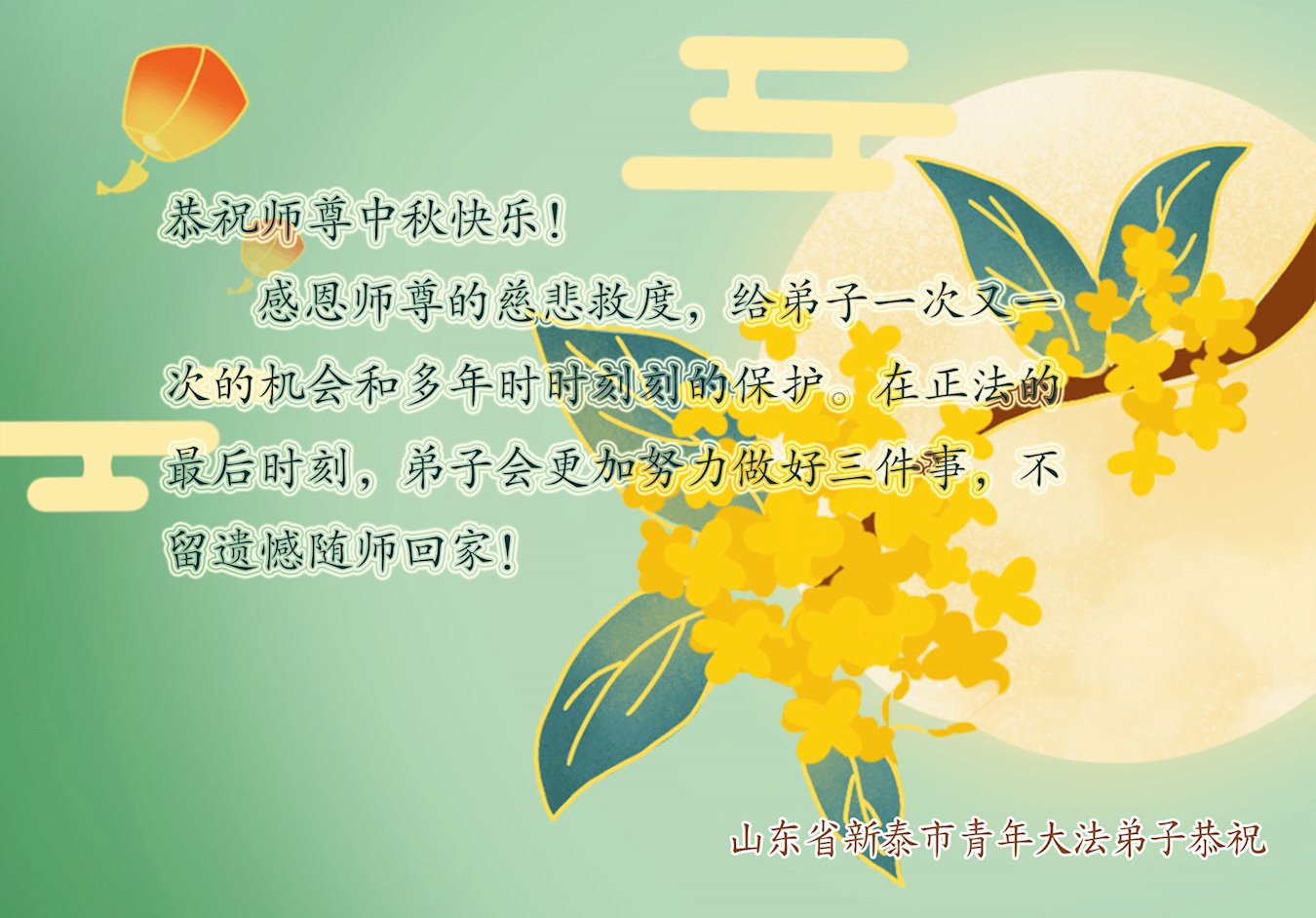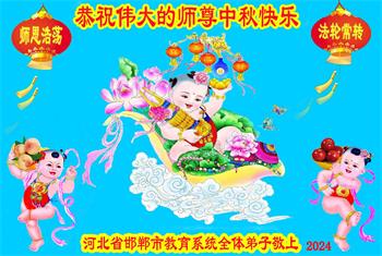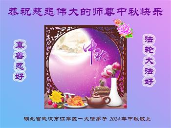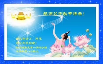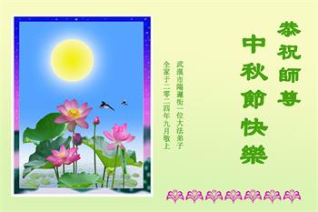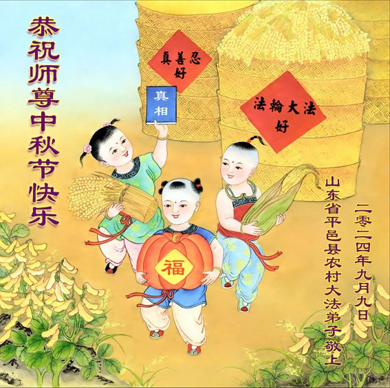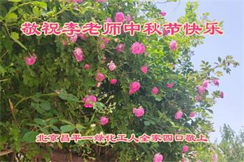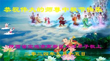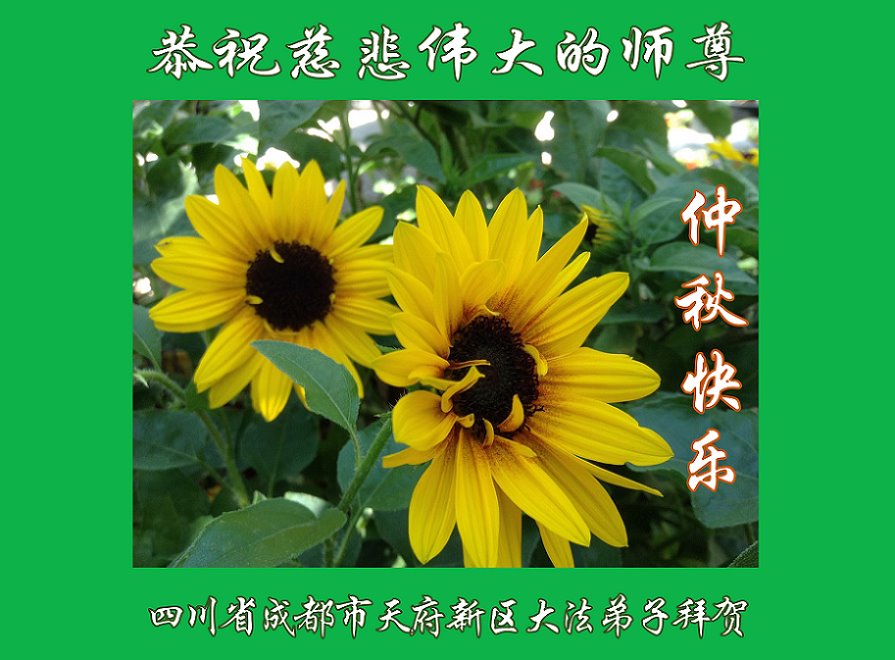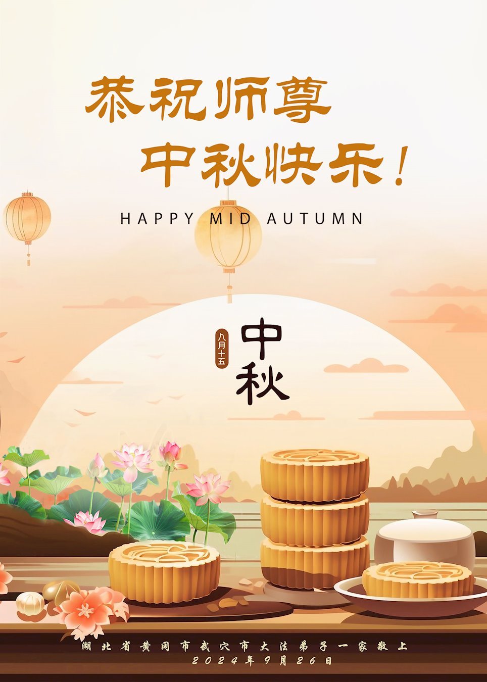 慈悲伟大的师尊好:我们在大陆都曾被邪恶残酷迫害,但我们不仅无悔,且深知能做师父的弟子是我们最大的荣耀与幸福。随师正法、救度众生是我们此生的意义与重任。弟子一定尽心、尽力去做,不负师尊的期望,不负众生的盼望。遥祝慈悲伟大的师尊中秋快乐!盼望师尊早日回大陆。