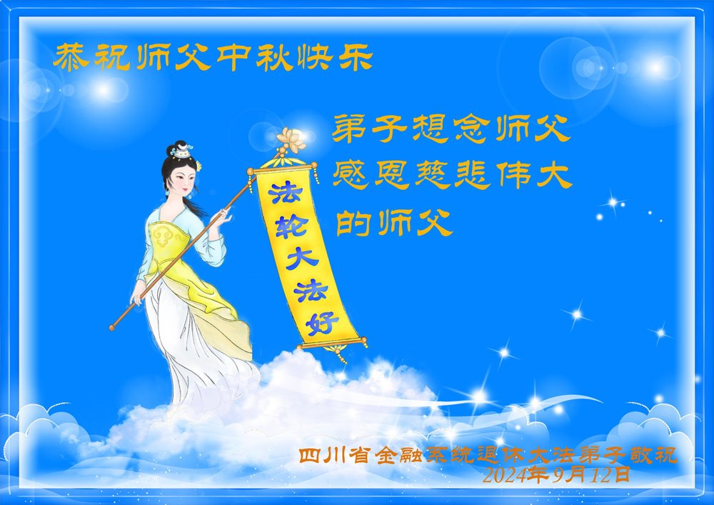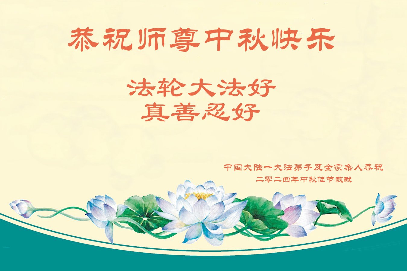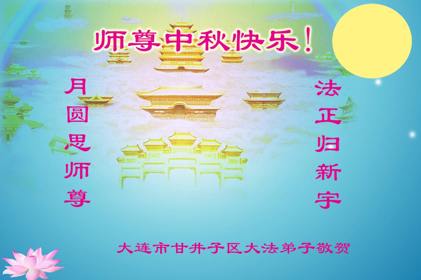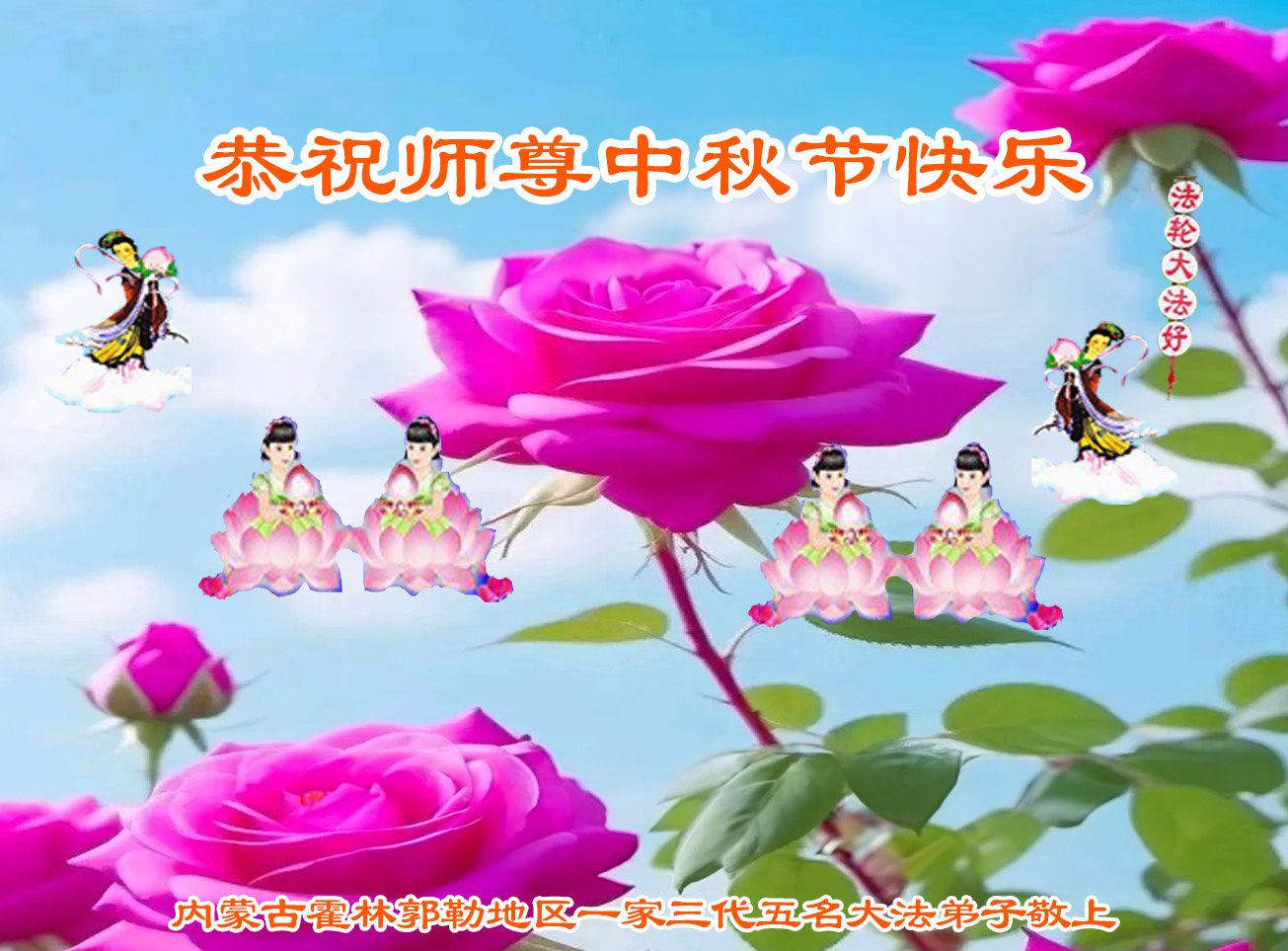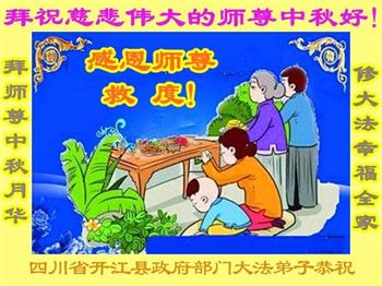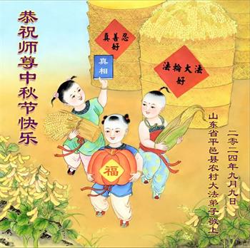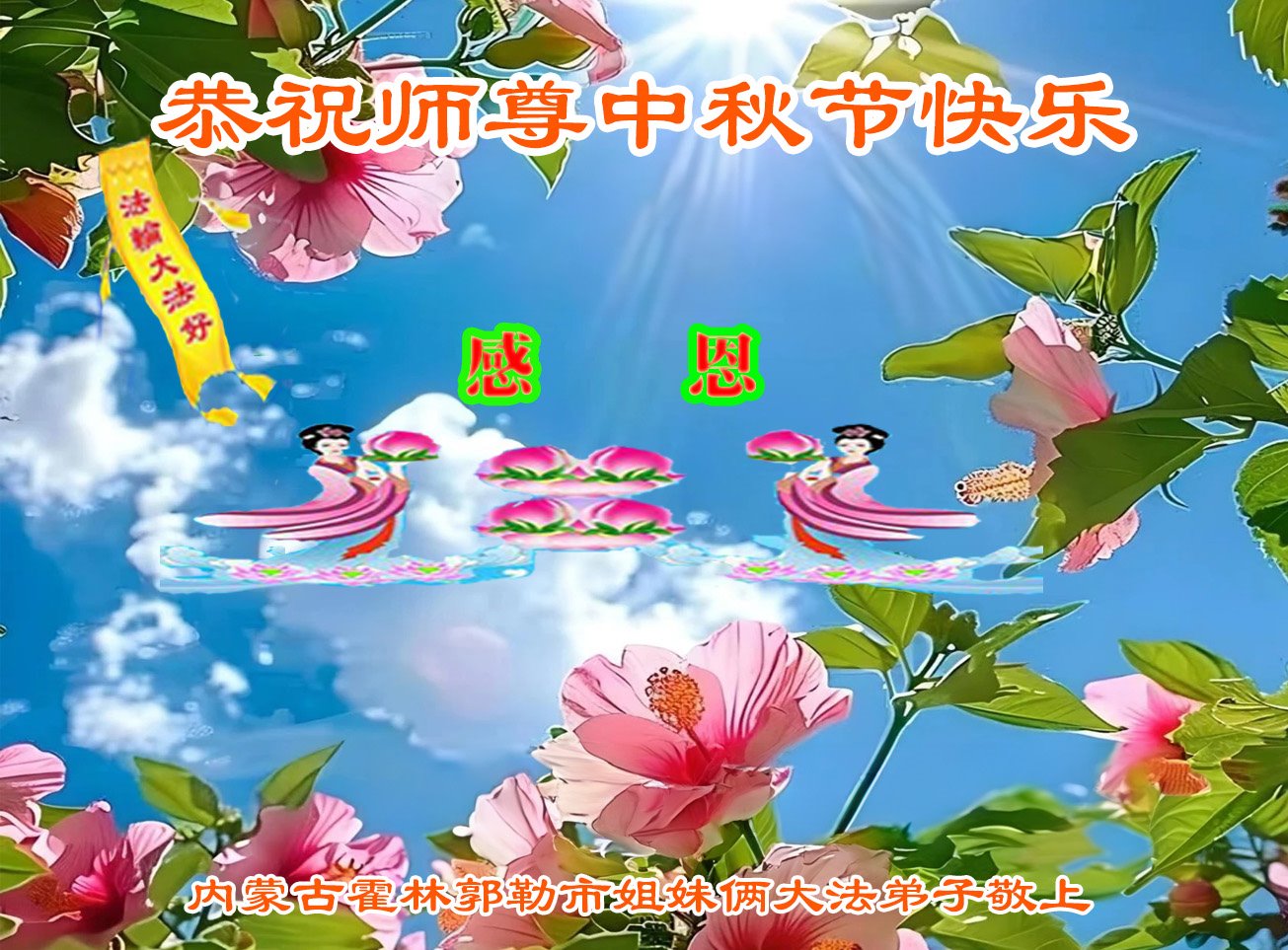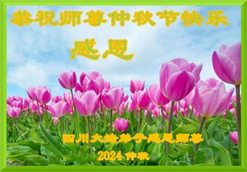 慈悲伟大的师尊好:我们在大陆都曾被邪恶残酷迫害,但我们不仅无悔,且深知能做师父的弟子是我们最大的荣耀与幸福。随师正法、救度众生是我们此生的意义与重任。弟子一定尽心、尽力去做,不负师尊的期望,不负众生的盼望。遥祝慈悲伟大的师尊中秋快乐!盼望师尊早日回大陆。