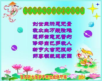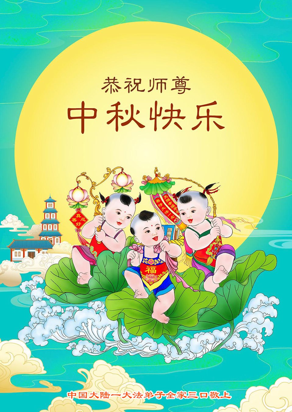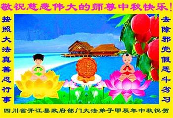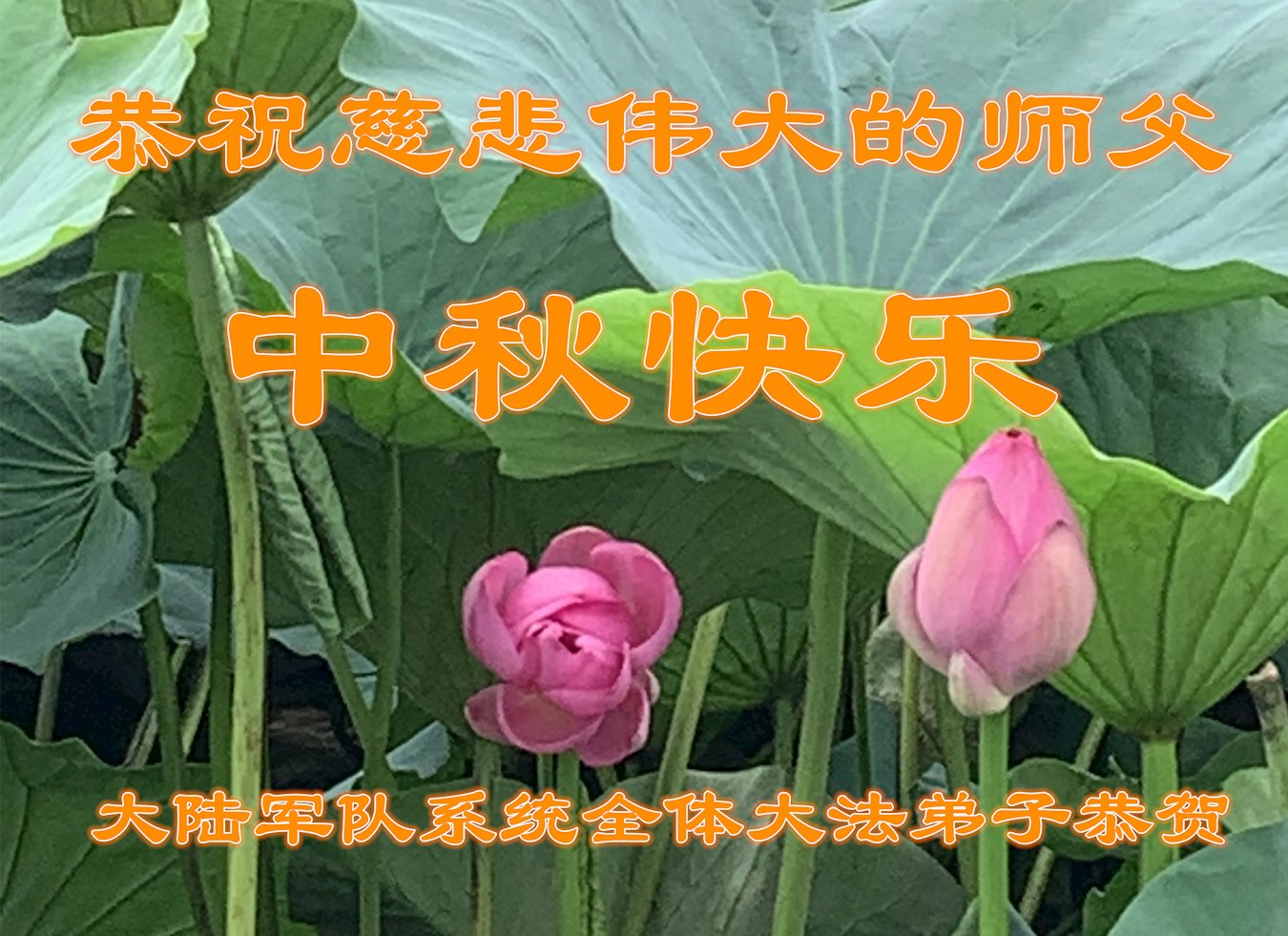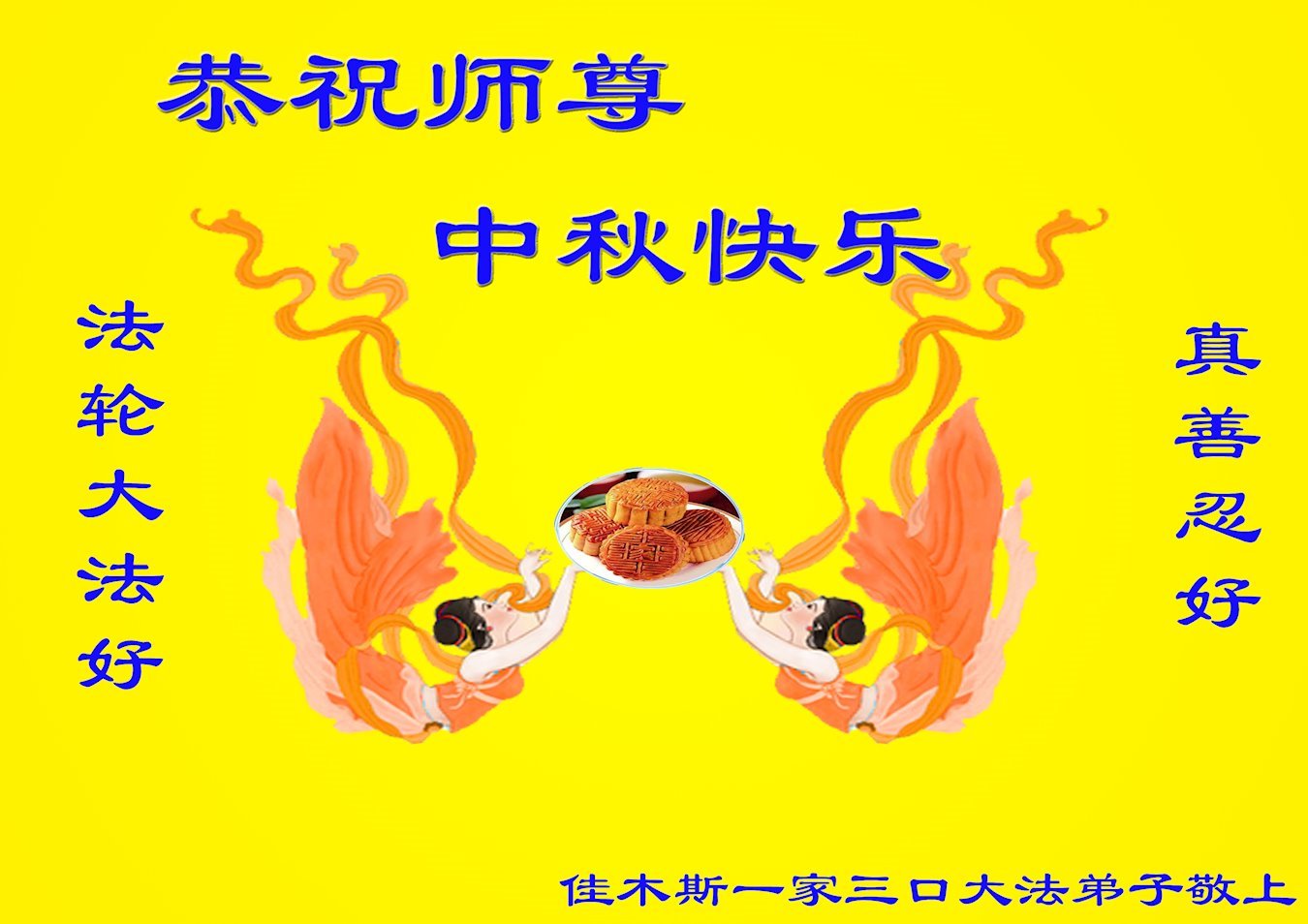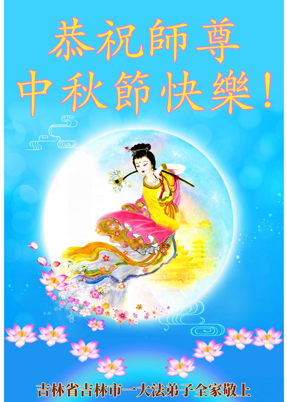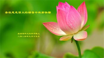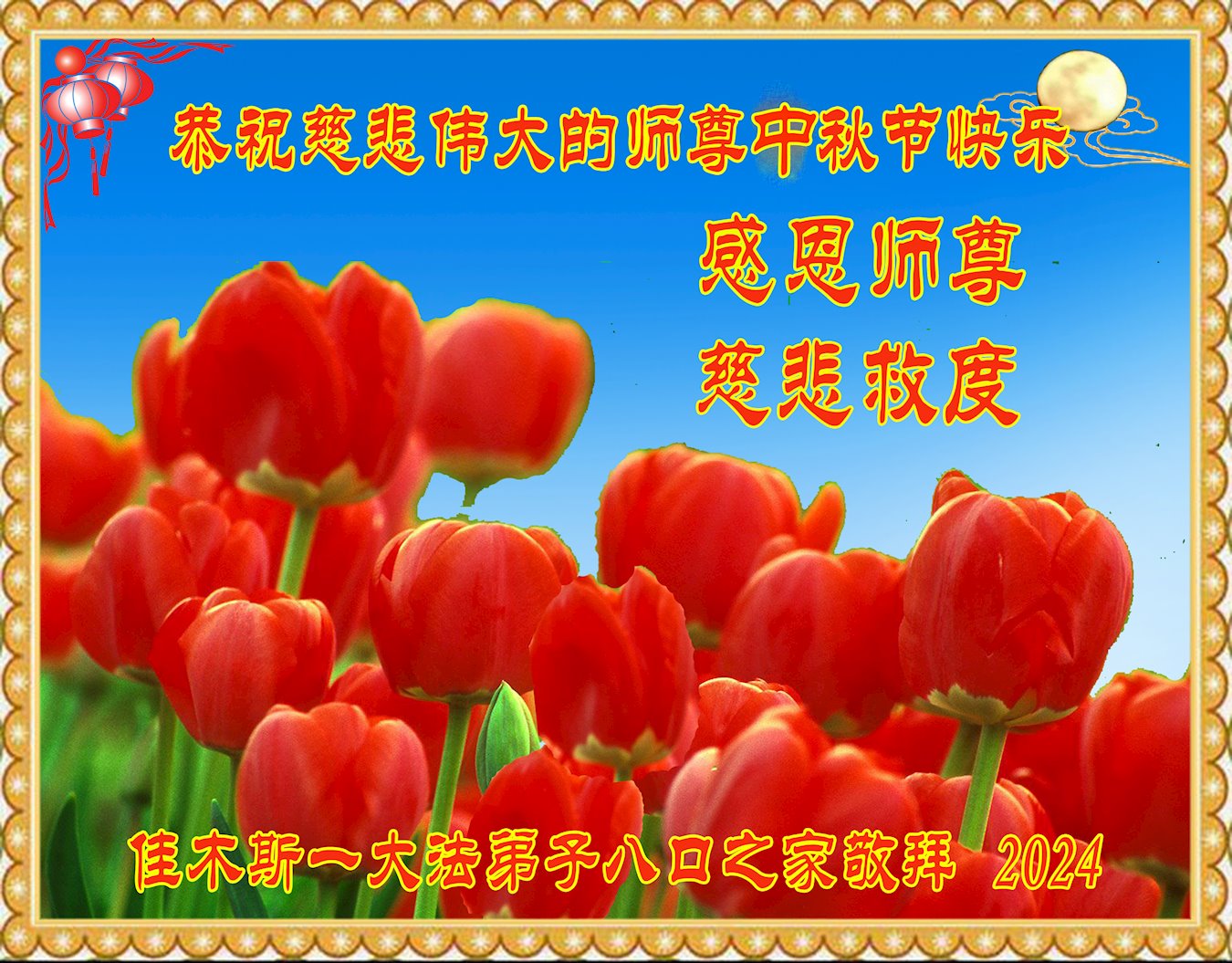 慈悲伟大的师尊好:我们在大陆都曾被邪恶残酷迫害,但我们不仅无悔,且深知能做师父的弟子是我们最大的荣耀与幸福。随师正法、救度众生是我们此生的意义与重任。弟子一定尽心、尽力去做,不负师尊的期望,不负众生的盼望。遥祝慈悲伟大的师尊中秋快乐!盼望师尊早日回大陆。
