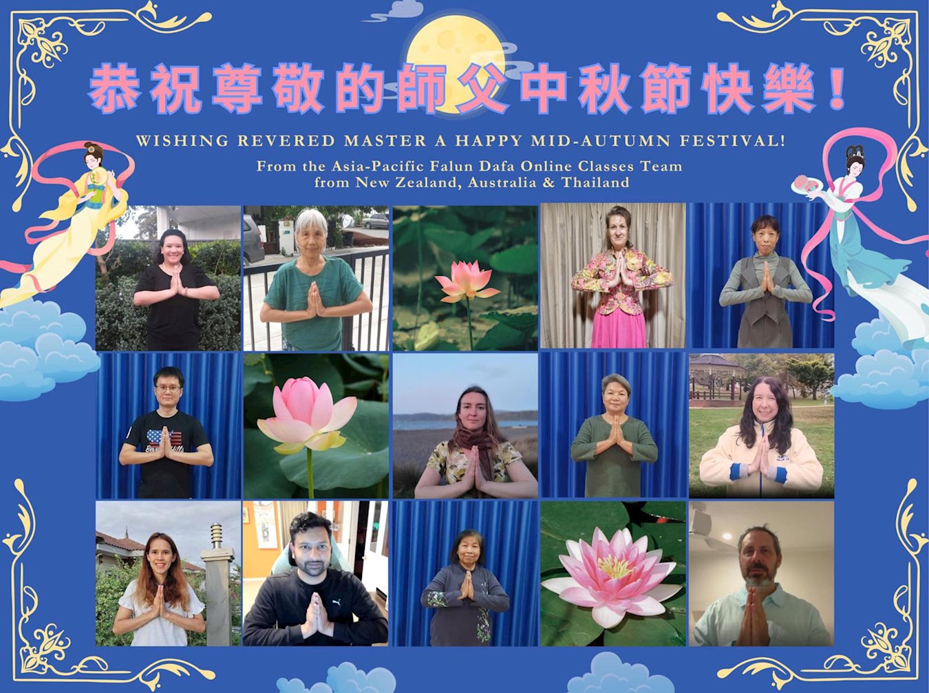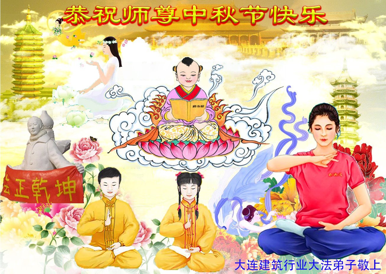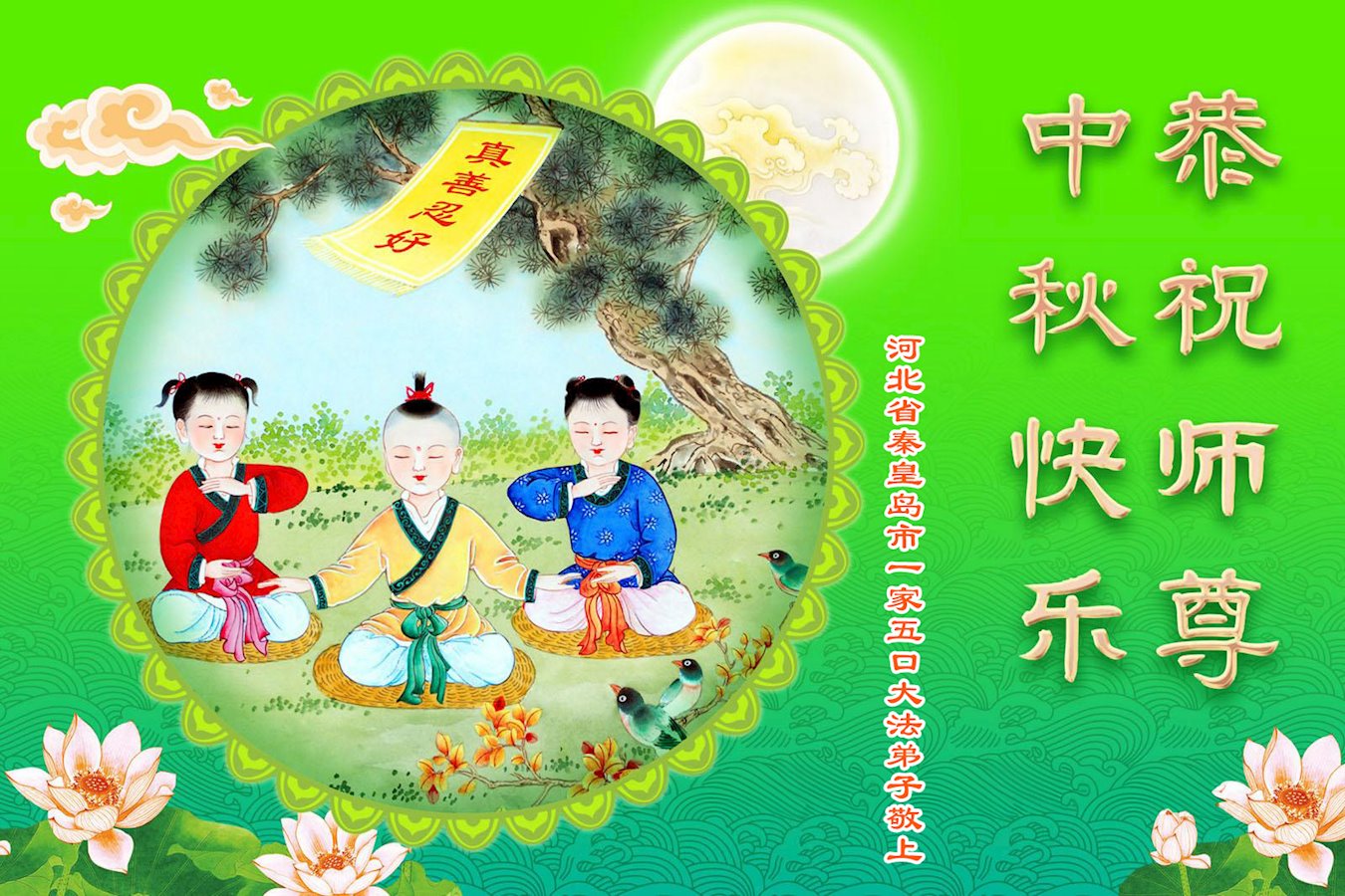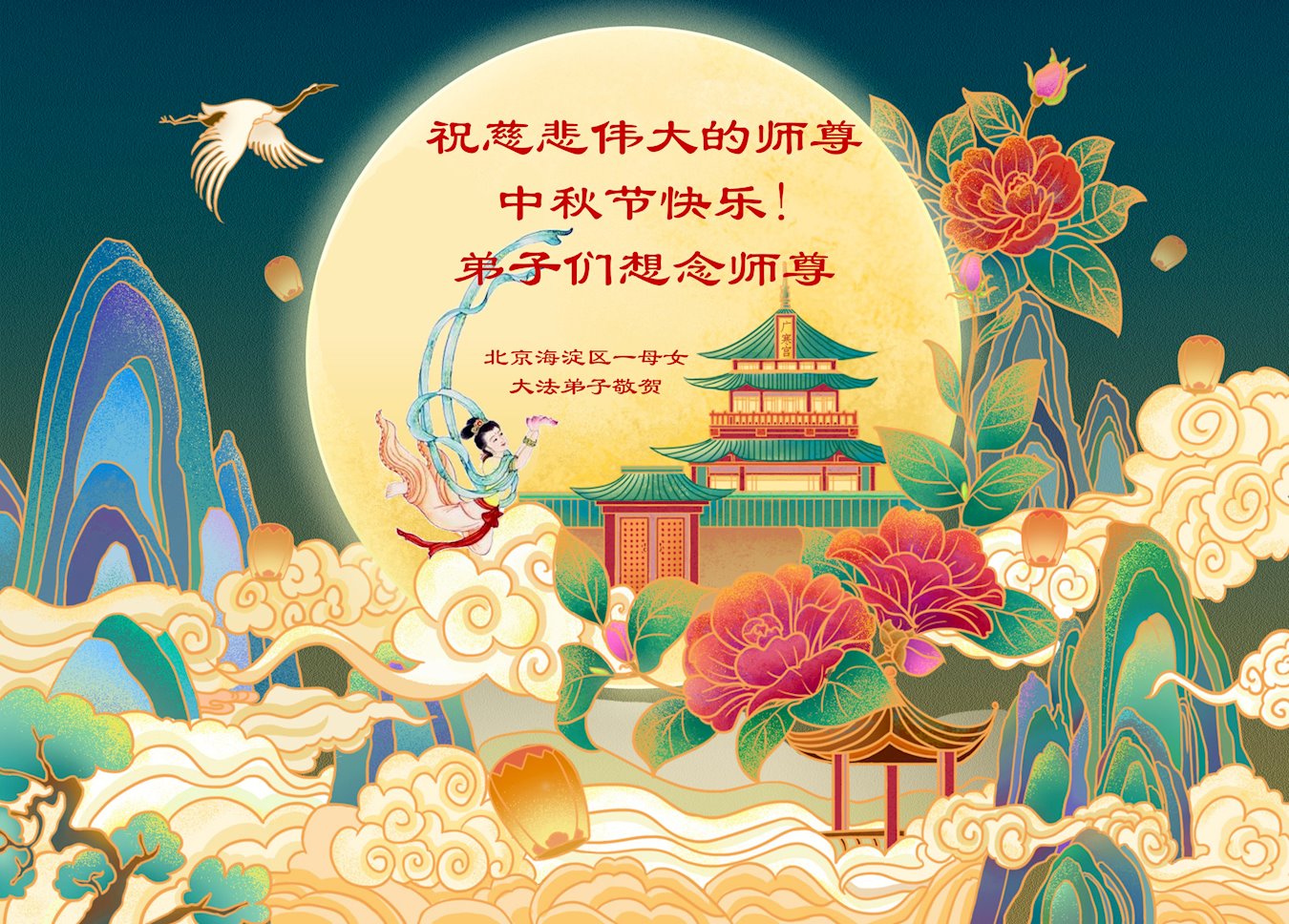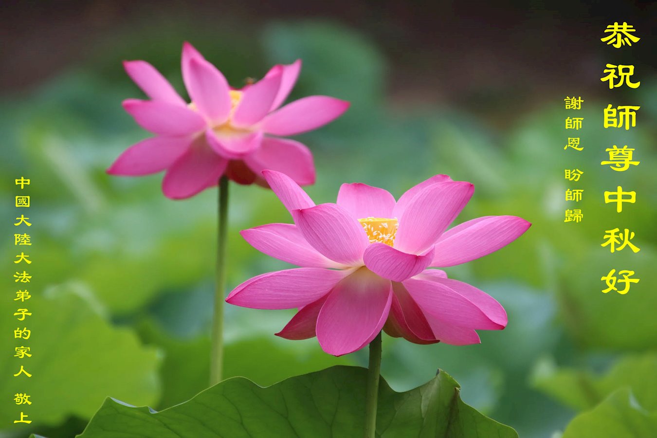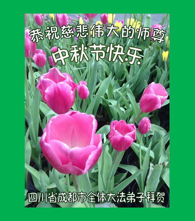 慈悲伟大的师尊好:我们在大陆都曾被邪恶残酷迫害,但我们不仅无悔,且深知能做师父的弟子是我们最大的荣耀与幸福。随师正法、救度众生是我们此生的意义与重任。弟子一定尽心、尽力去做,不负师尊的期望,不负众生的盼望。遥祝慈悲伟大的师尊中秋快乐!盼望师尊早日回大陆。
