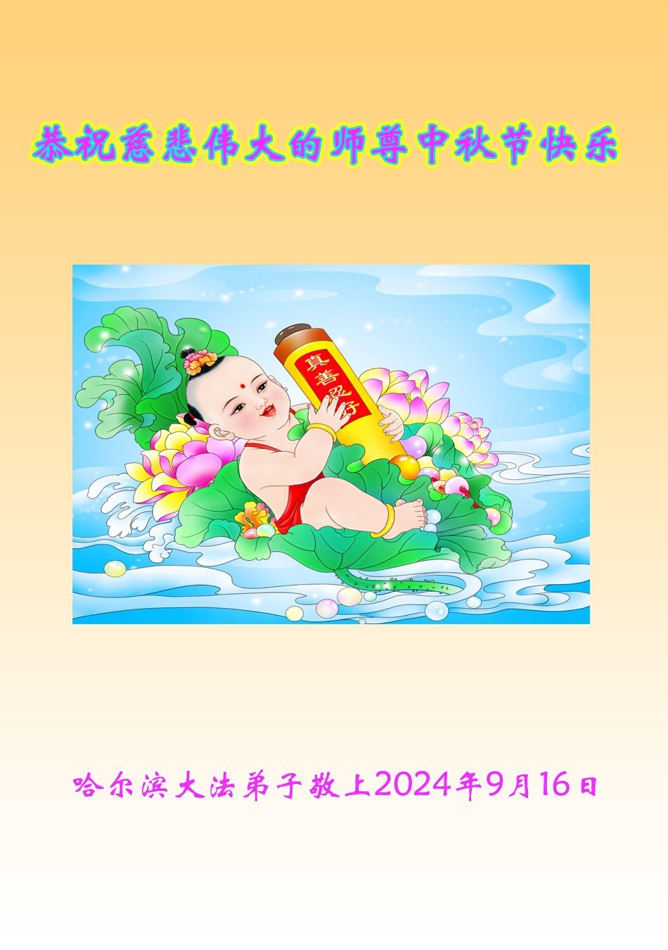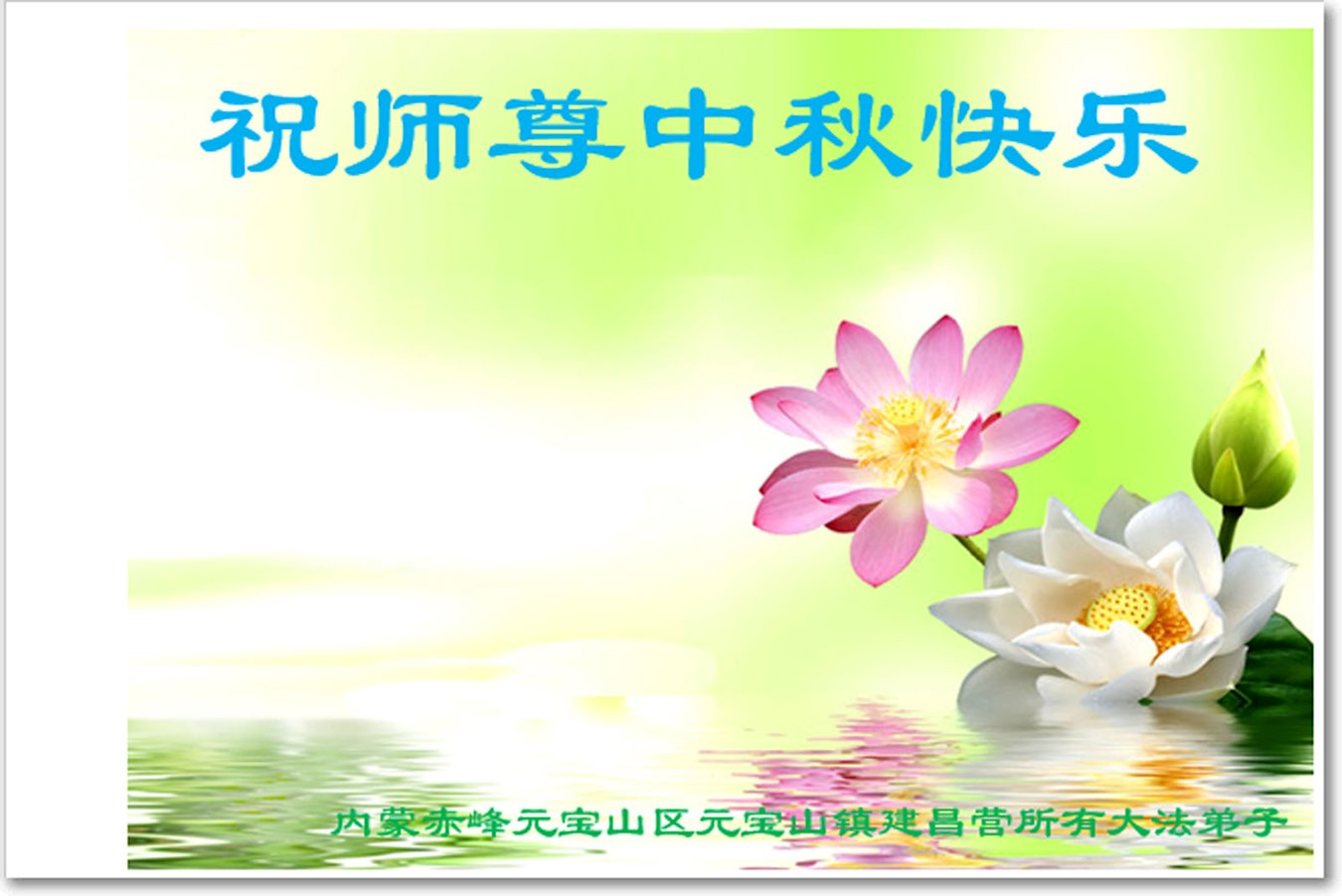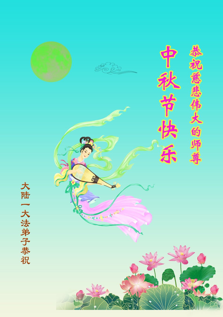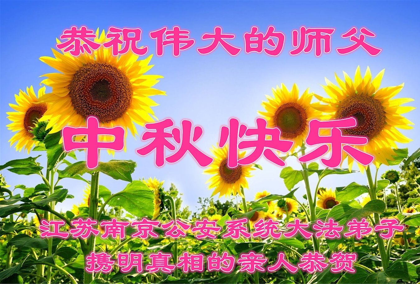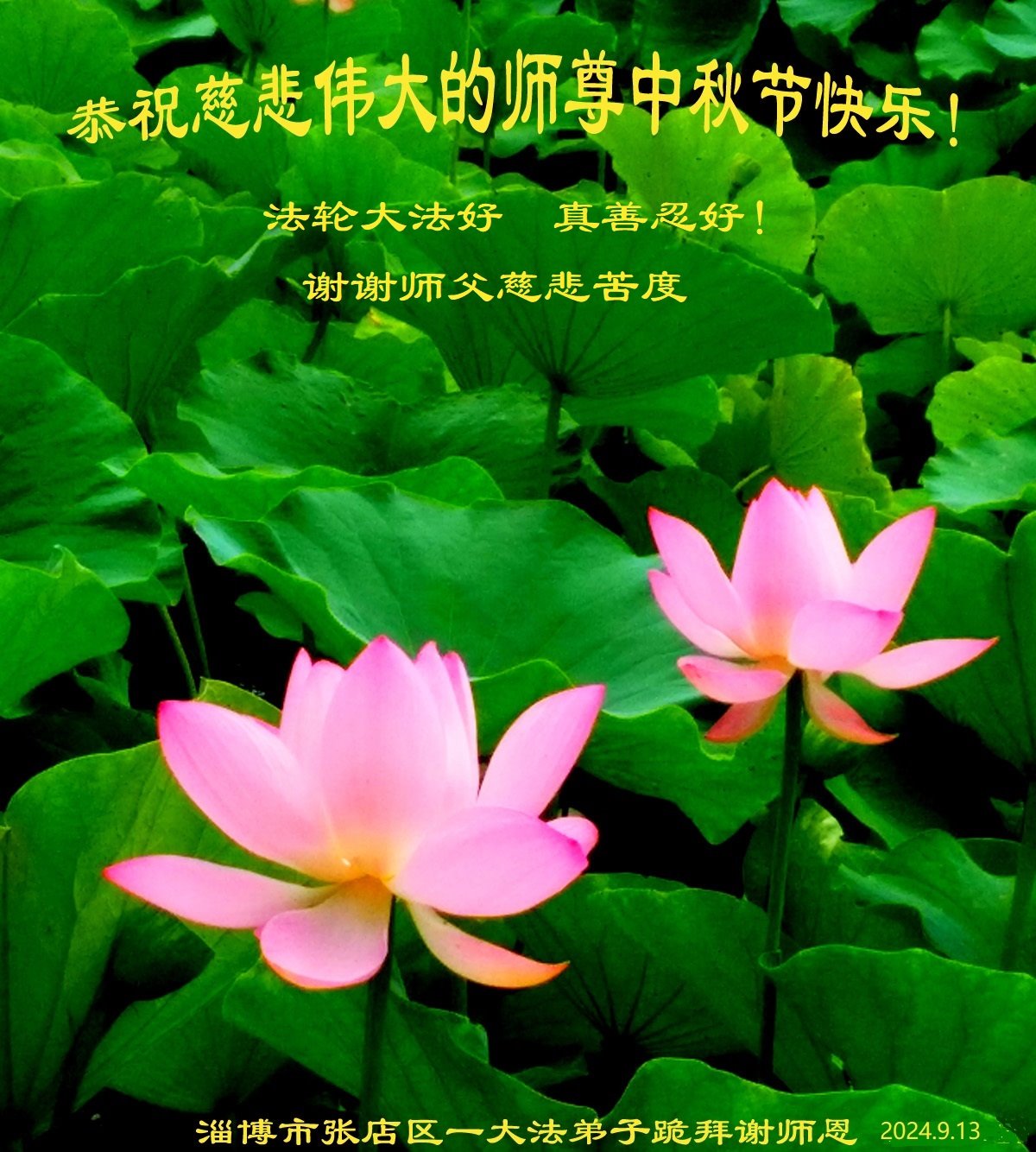 慈悲伟大的师尊好:我们在大陆都曾被邪恶残酷迫害,但我们不仅无悔,且深知能做师父的弟子是我们最大的荣耀与幸福。随师正法、救度众生是我们此生的意义与重任。弟子一定尽心、尽力去做,不负师尊的期望,不负众生的盼望。遥祝慈悲伟大的师尊中秋快乐!盼望师尊早日回大陆。