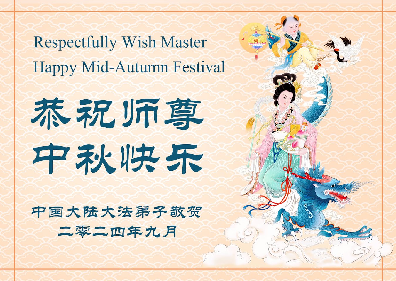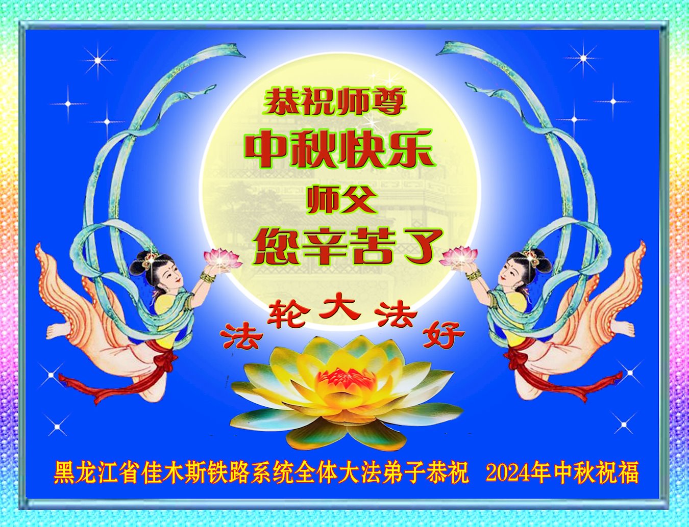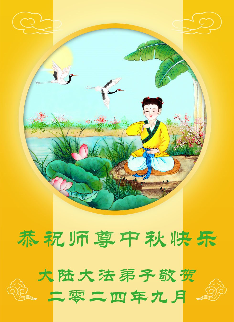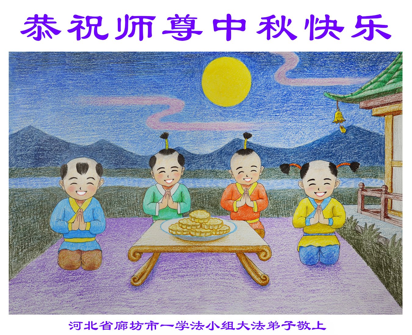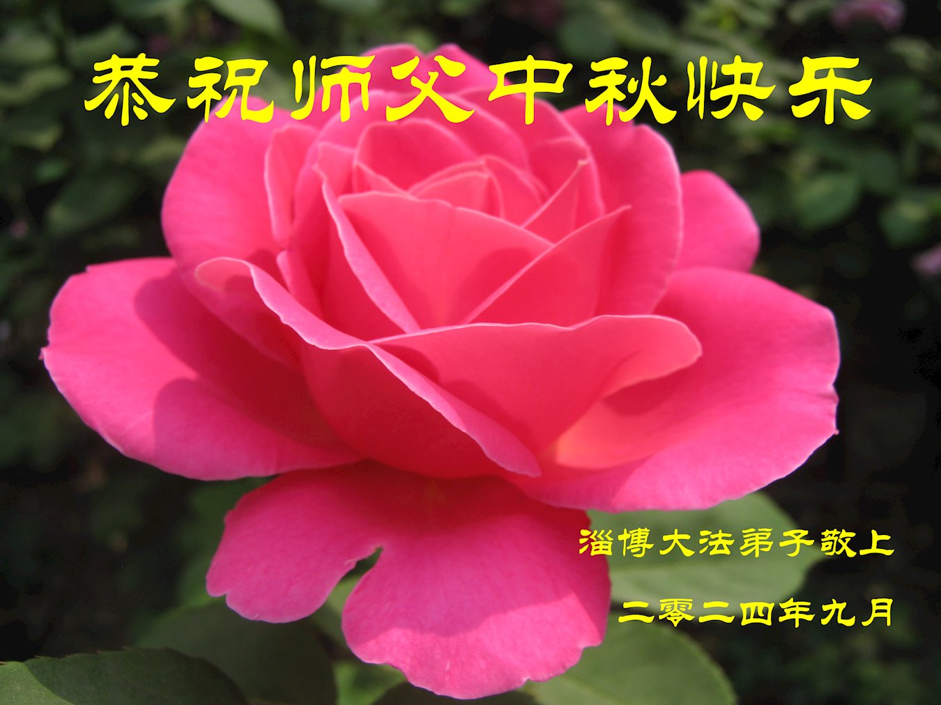 慈悲伟大的师尊好:我们在大陆都曾被邪恶残酷迫害,但我们不仅无悔,且深知能做师父的弟子是我们最大的荣耀与幸福。随师正法、救度众生是我们此生的意义与重任。弟子一定尽心、尽力去做,不负师尊的期望,不负众生的盼望。遥祝慈悲伟大的师尊中秋快乐!盼望师尊早日回大陆。