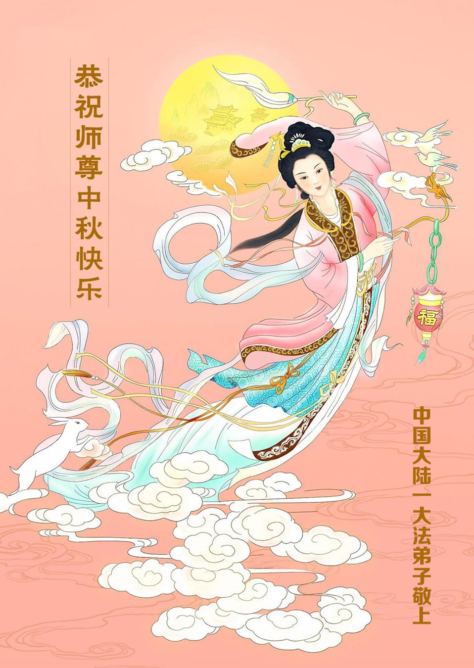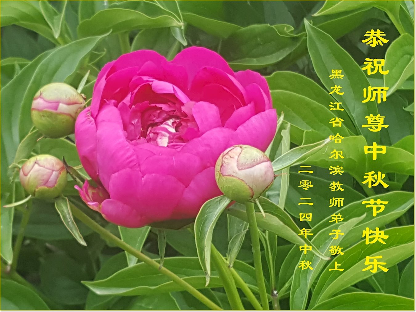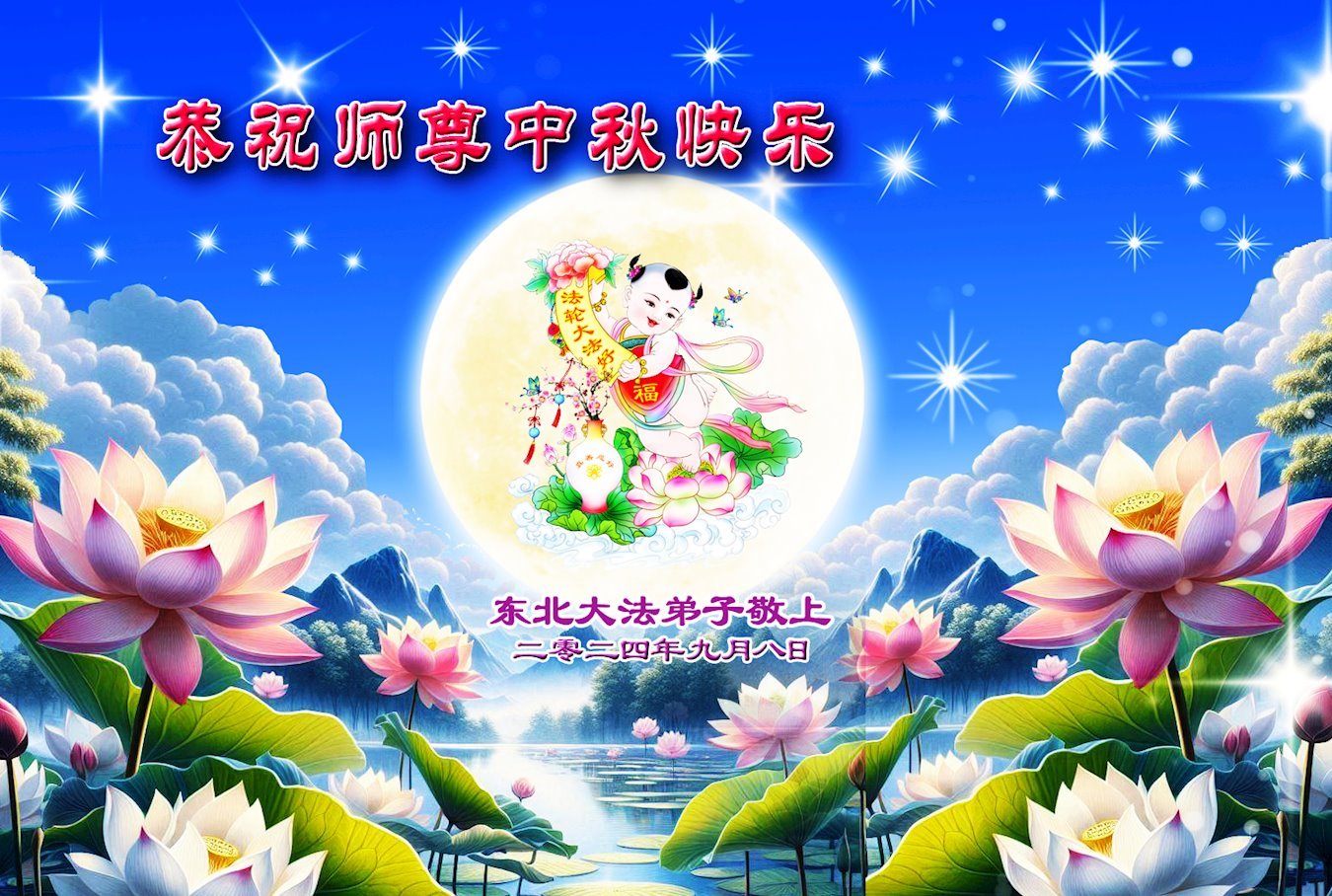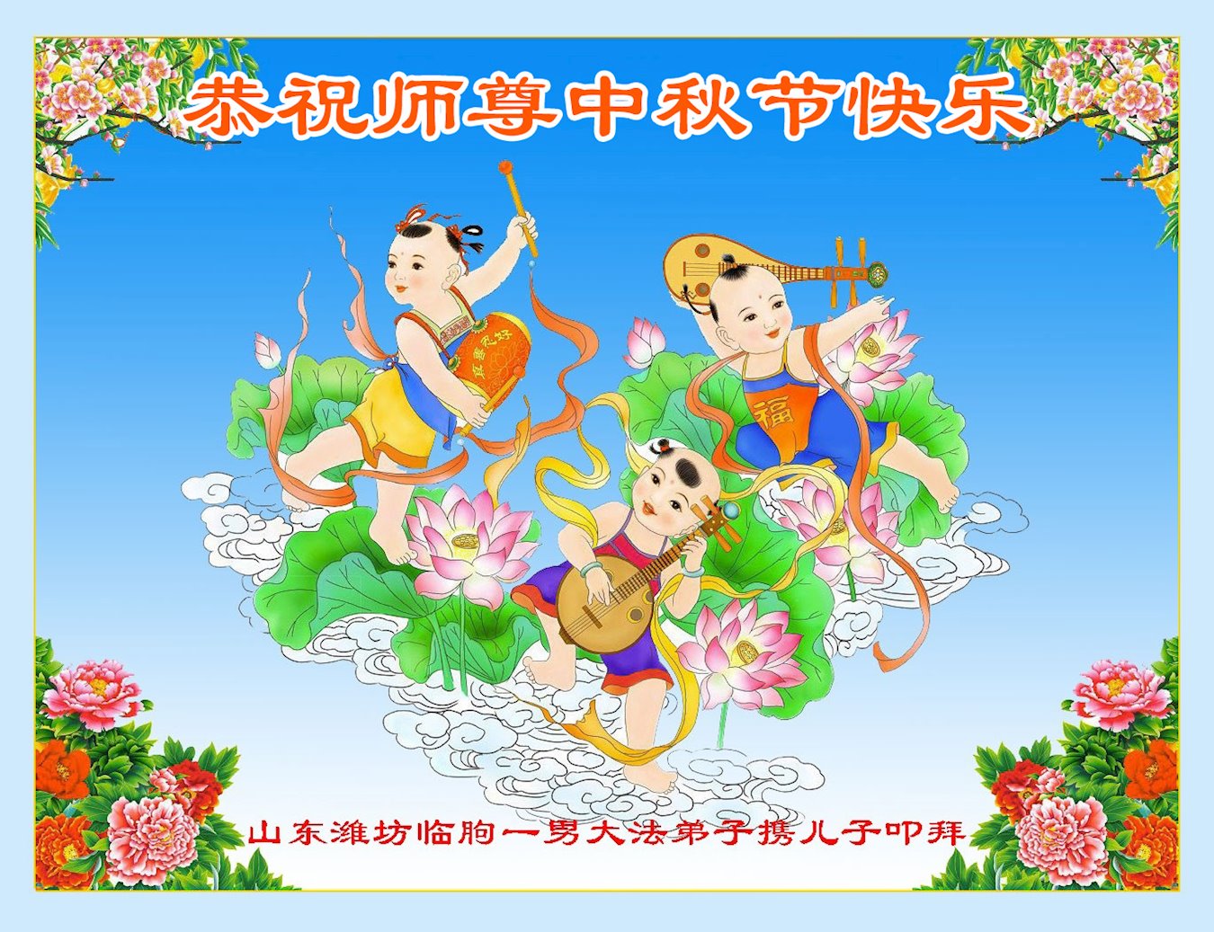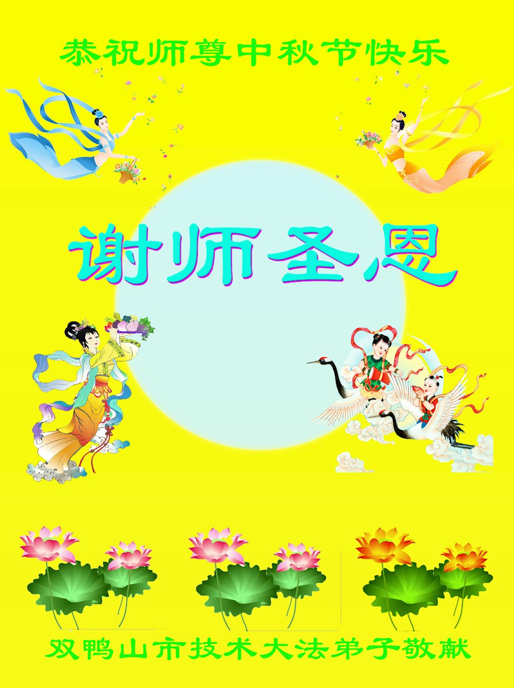 慈悲伟大的师尊好:我们在大陆都曾被邪恶残酷迫害,但我们不仅无悔,且深知能做师父的弟子是我们最大的荣耀与幸福。随师正法、救度众生是我们此生的意义与重任。弟子一定尽心、尽力去做,不负师尊的期望,不负众生的盼望。遥祝慈悲伟大的师尊中秋快乐!盼望师尊早日回大陆。