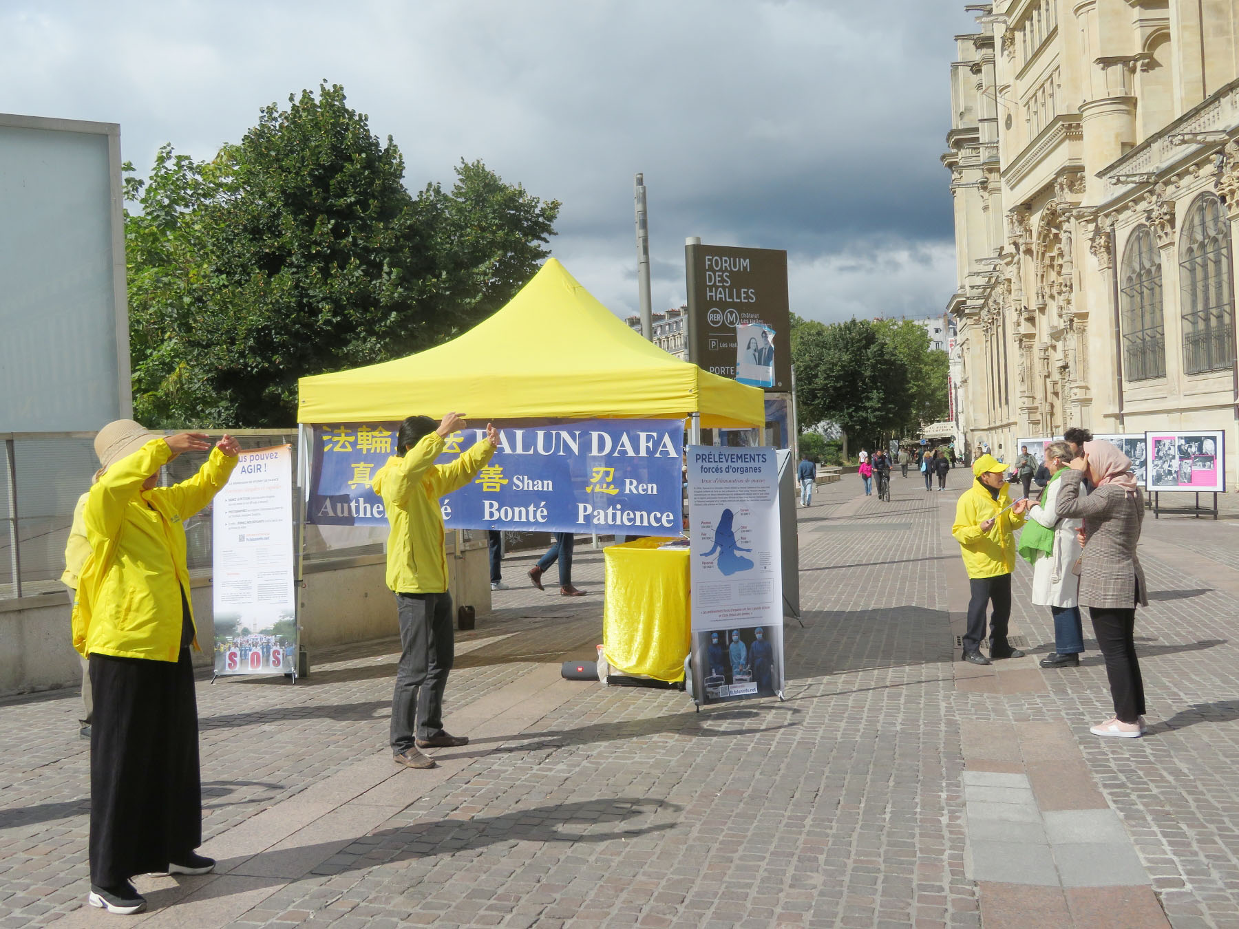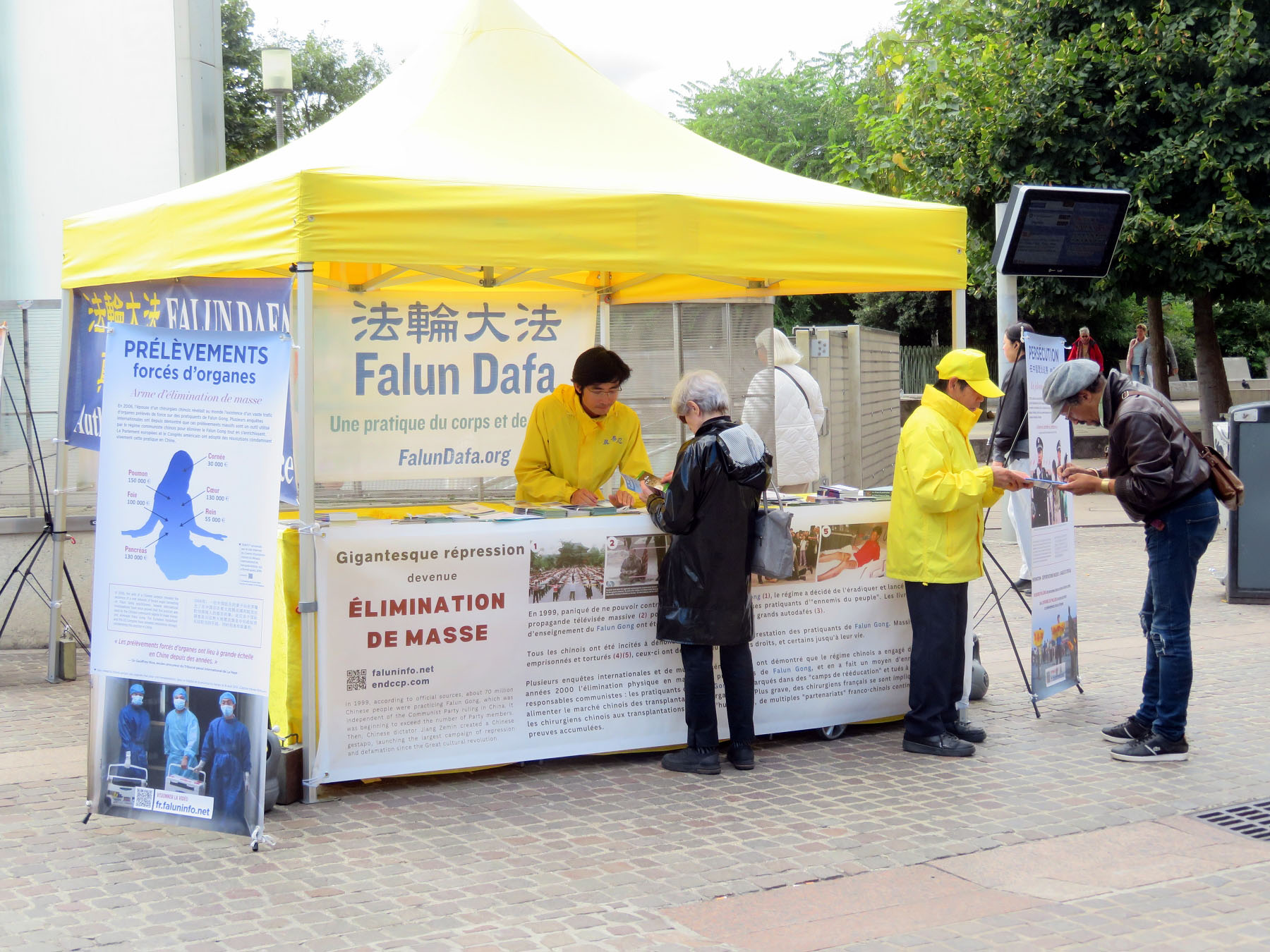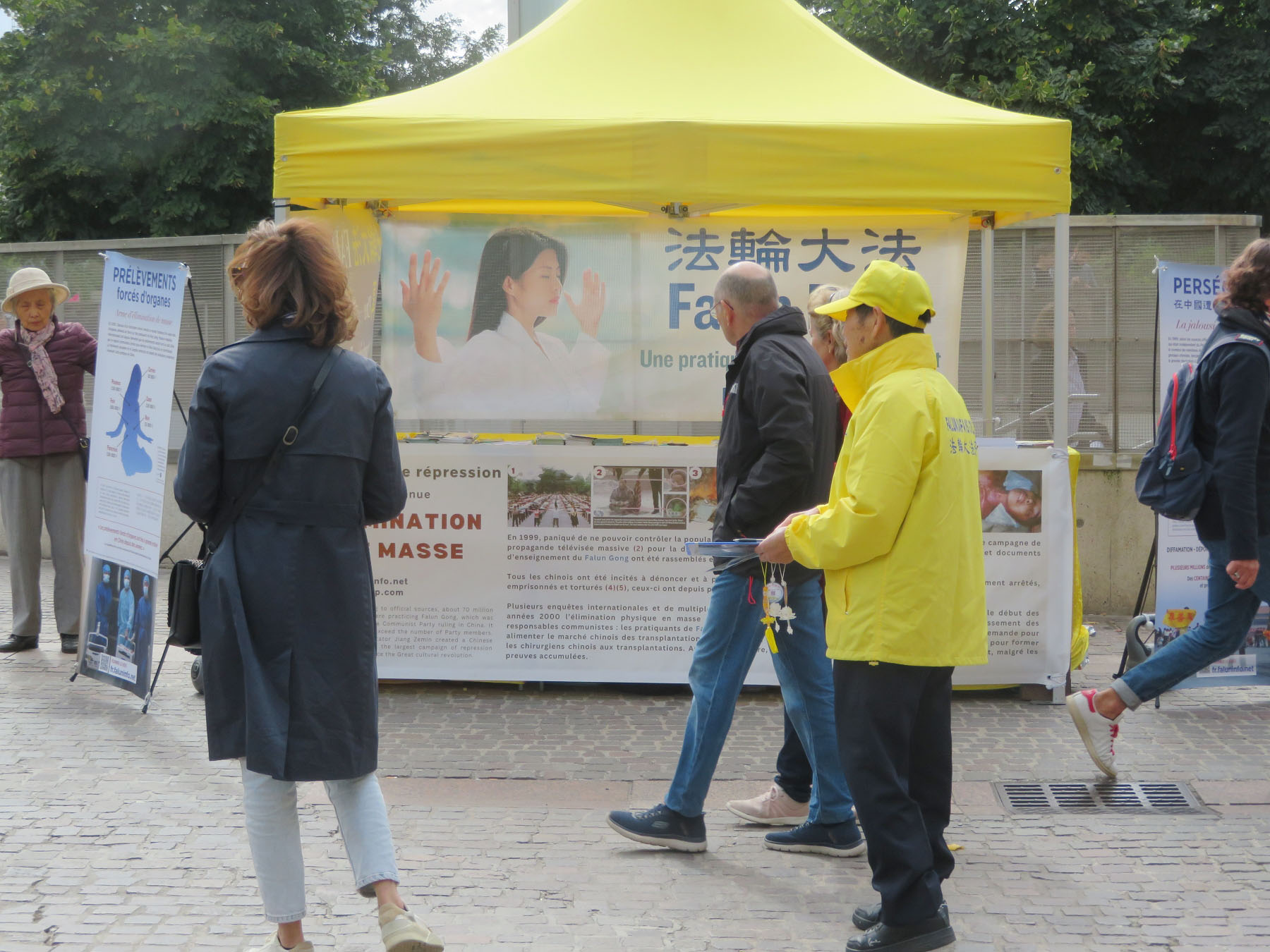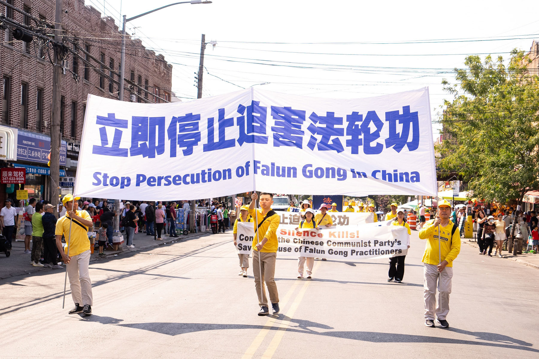第二方阵“停止迫害法轮功”。一条条横幅,揭露中共自一九九九年七月二十日迄今,对法轮功学员长达二十五年的残酷迫害和这个世上最邪恶的魔鬼罪行“活摘法轮功学员器官”。